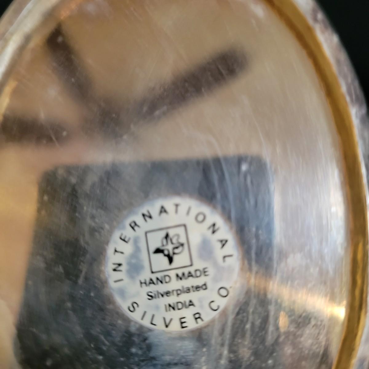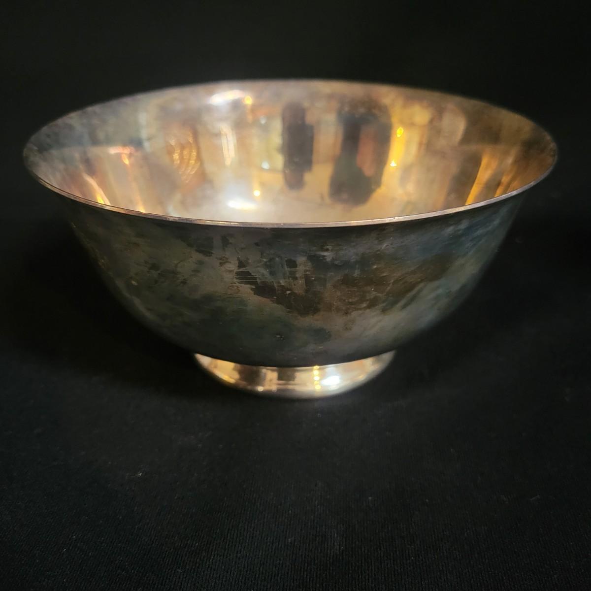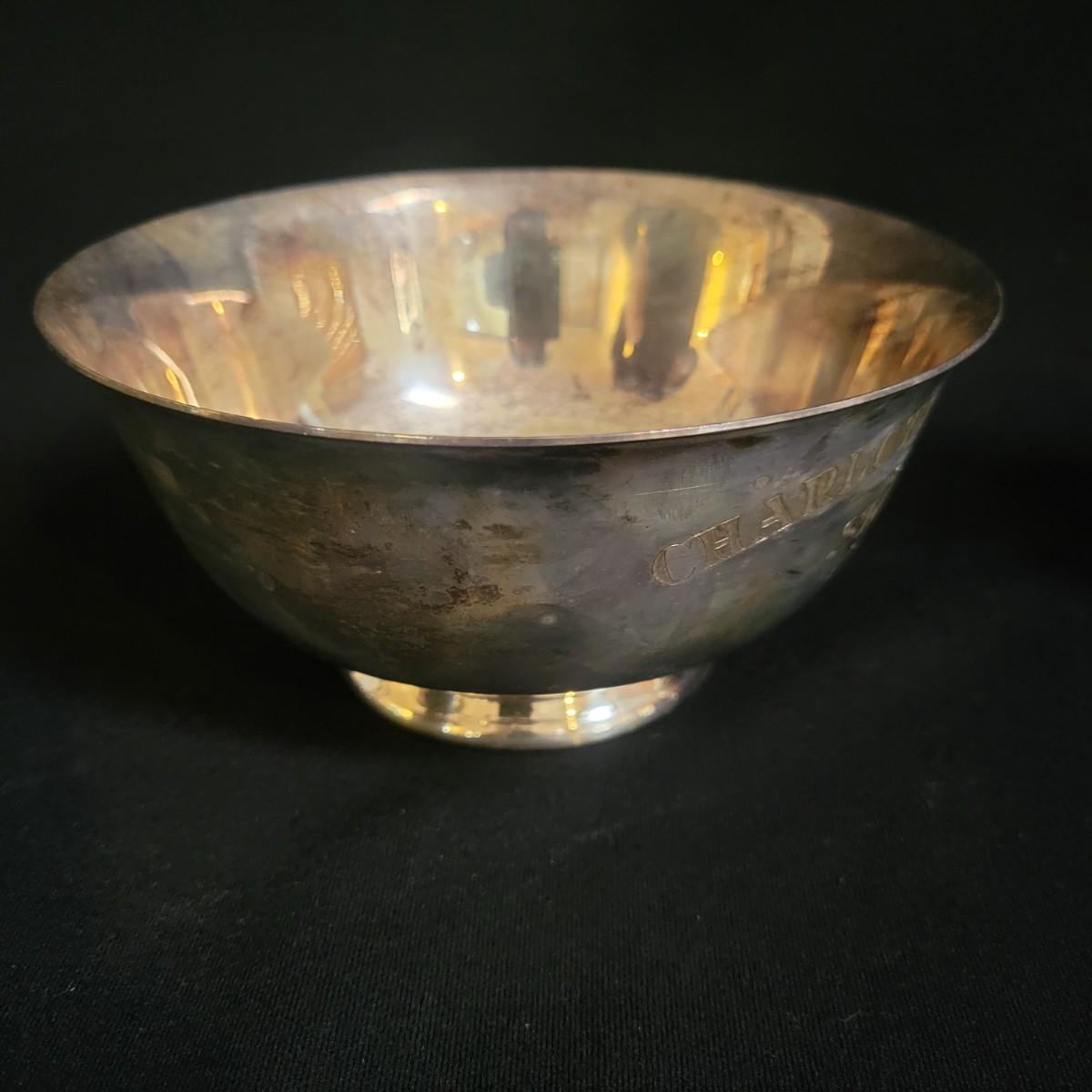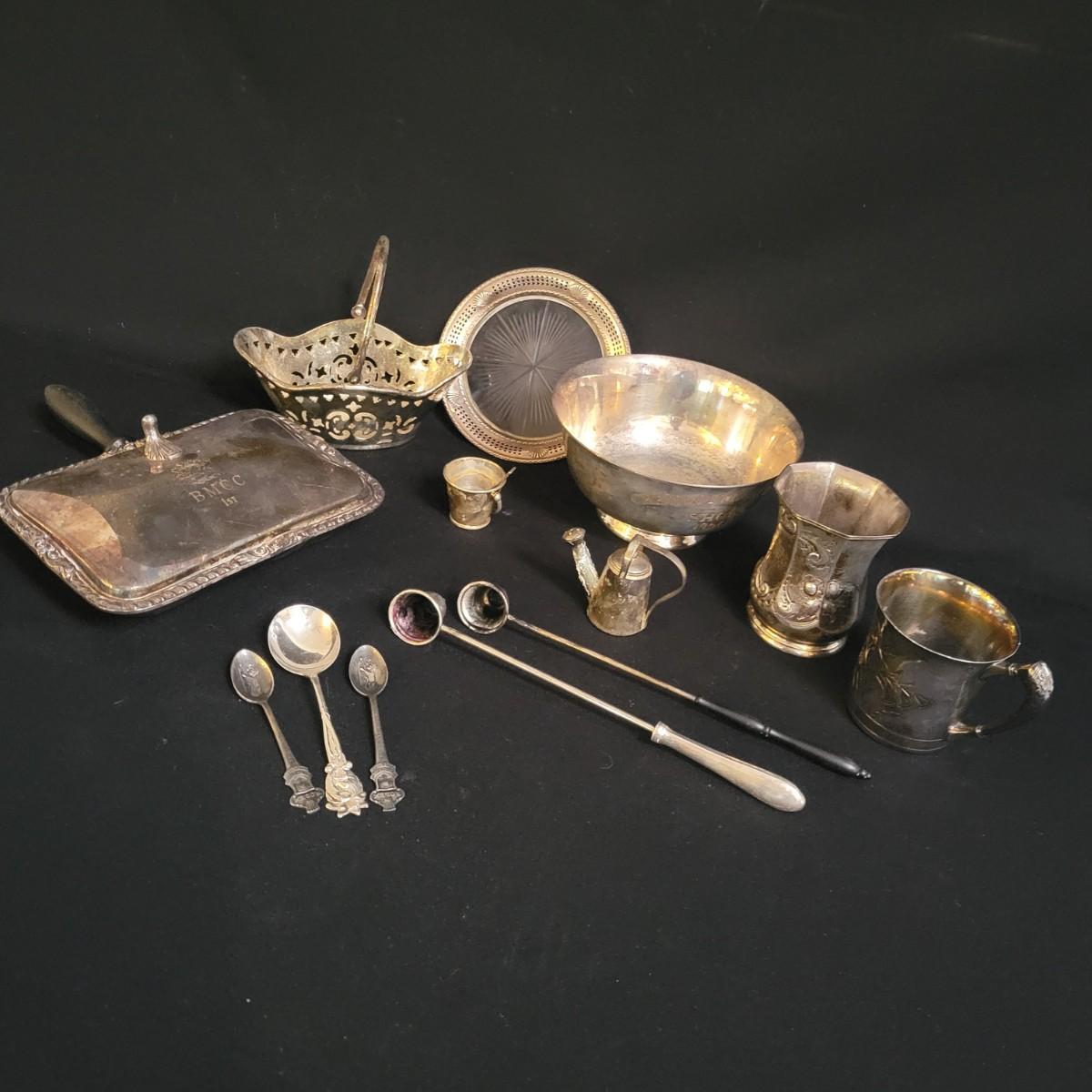 An assortment 13 unique silverplate items that includes a bowl, cups, a basket, a glass plate with a silver rim and more. Manufacturers include Reed and Barton, Godinger, International Silver Co and more. The bowl measures approximately 6.5"D x 3"H. See images for examples of etchings and engravings. Shipping available