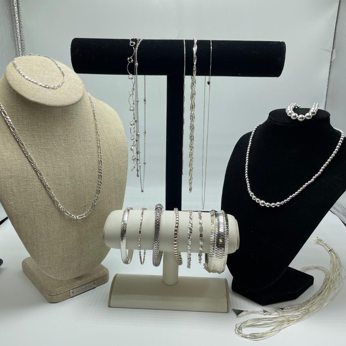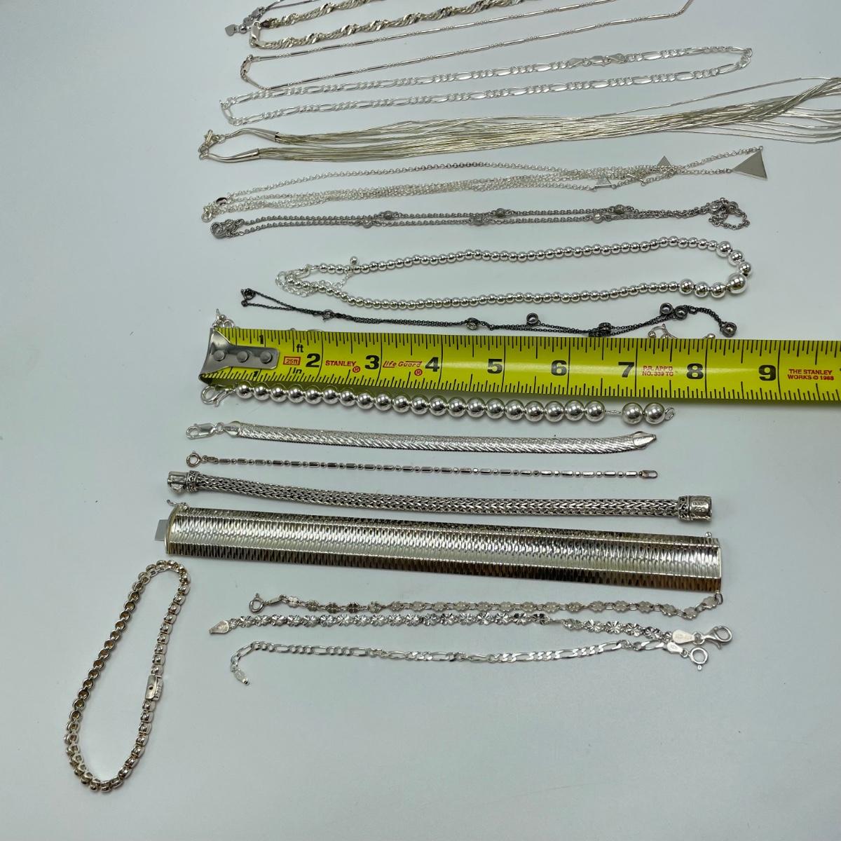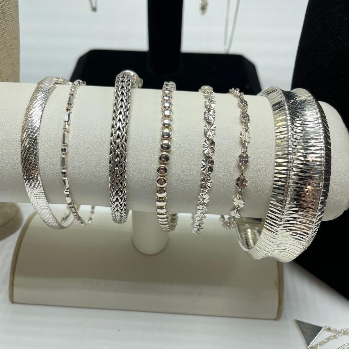 A matching set with bracelet and necklace plus another beaded necklace that complements a bracelet noted in photos. Lot contains a total of nine bracelets and and ten necklaces, each hosting a 925 stamp. The longest necklaces are 24” these are the multi strand and one that can be adjusted with a heart charm. The heaviest bracelet is also marked Sarda. Please see photos for all markings found. All sales are final. No returns or refunds. Please bid accordingly.