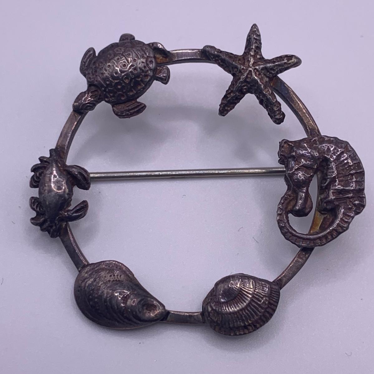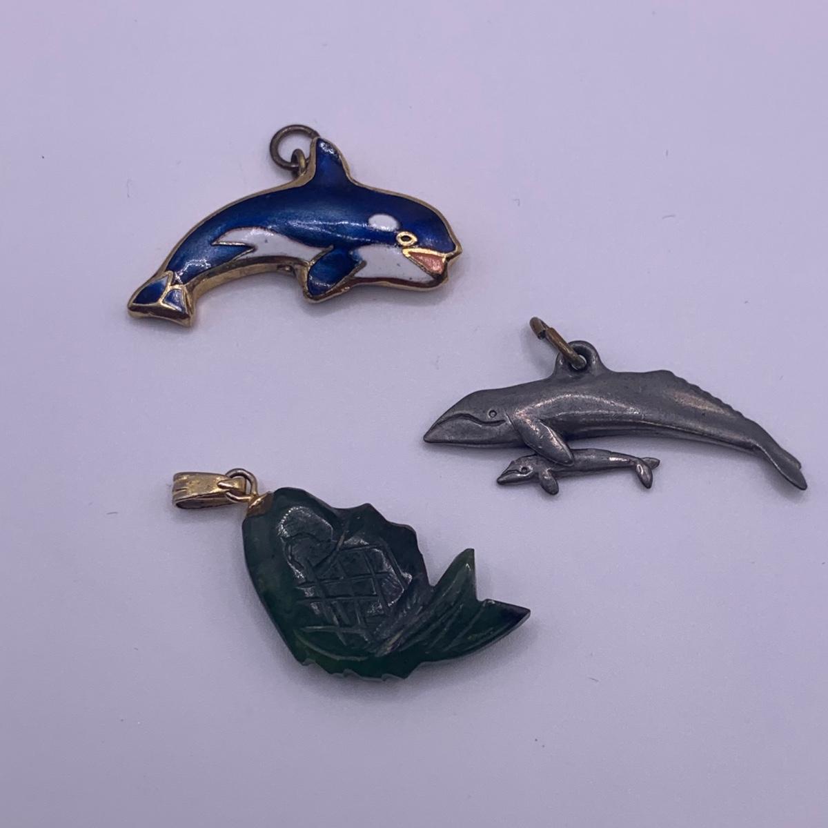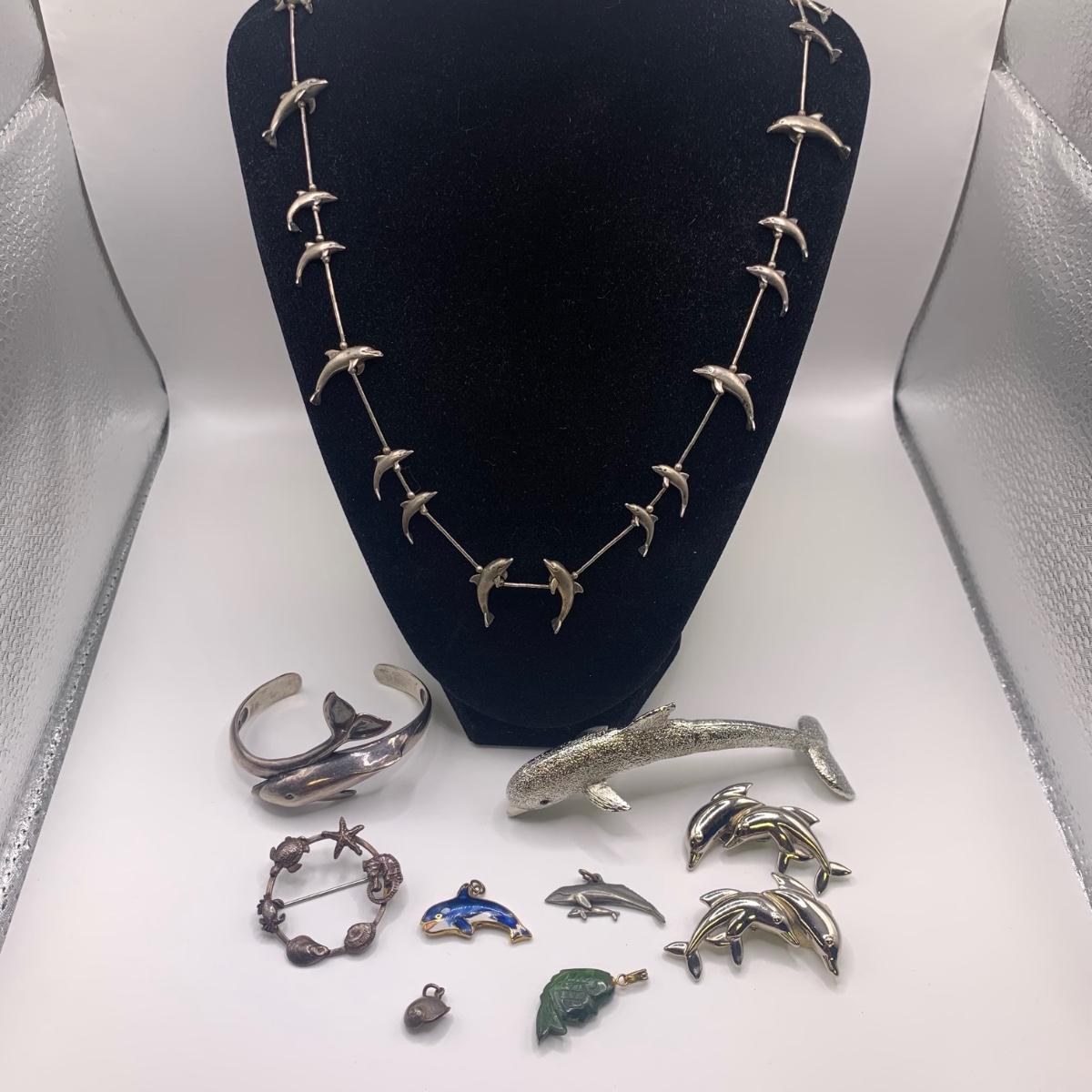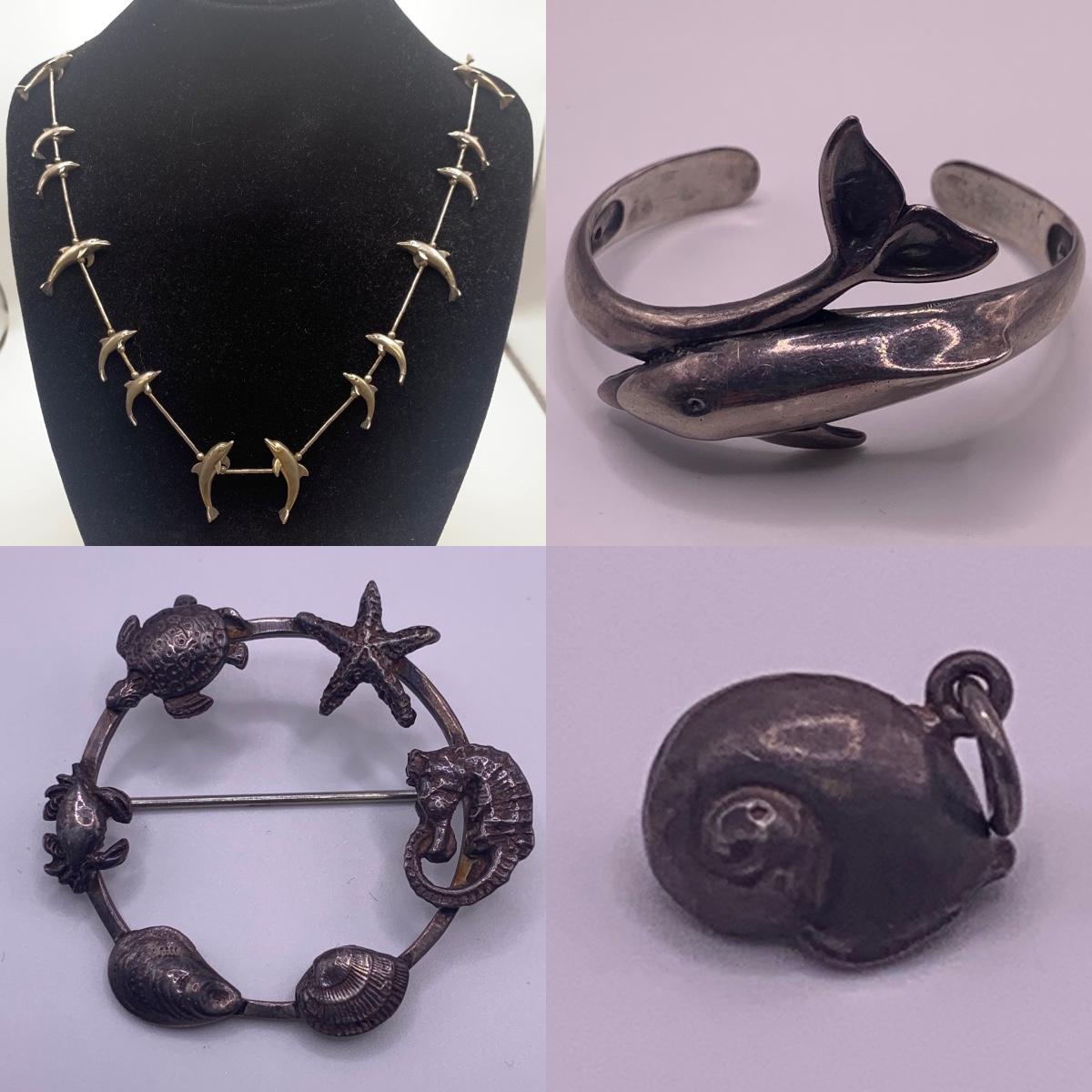10 items total are included in this lot. Four have Sterling markings: the multi-dolphin necklace, the dolphin cuff bracelet, the circular sea life ‘Oscar Carlan’ pin, and the small shell pendant. Also included are a pair of dolphin clip-on earrings, a large dolphin pin with sparkly blue eyes, and three pendants. One pendant appears to be carved jade, one appears to be enameled, and the other has an indecipherable marking on metal that has a pewter appearance.