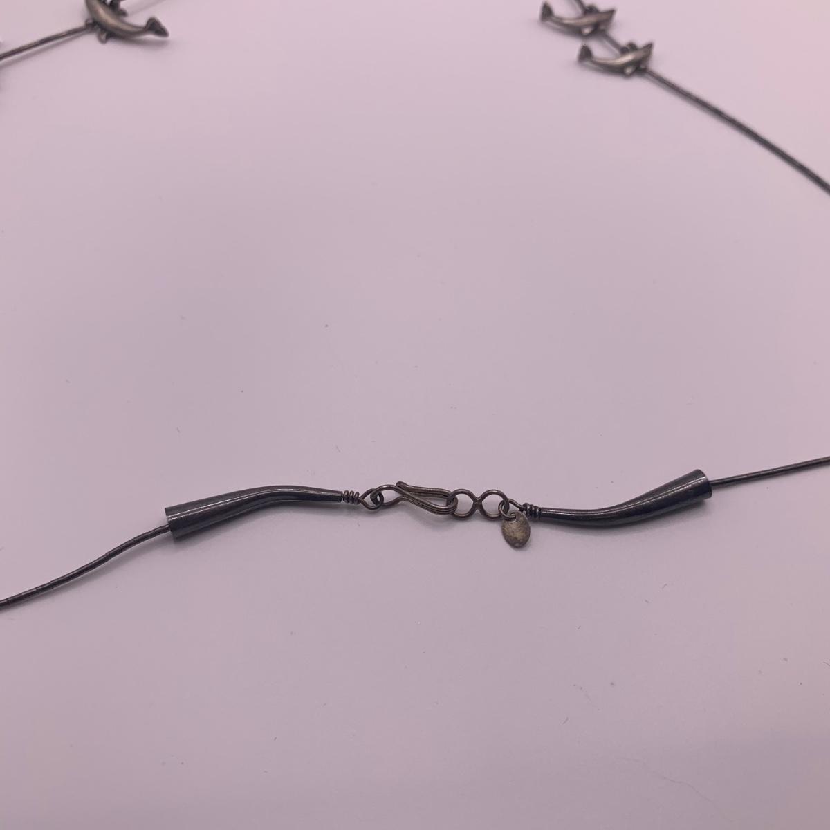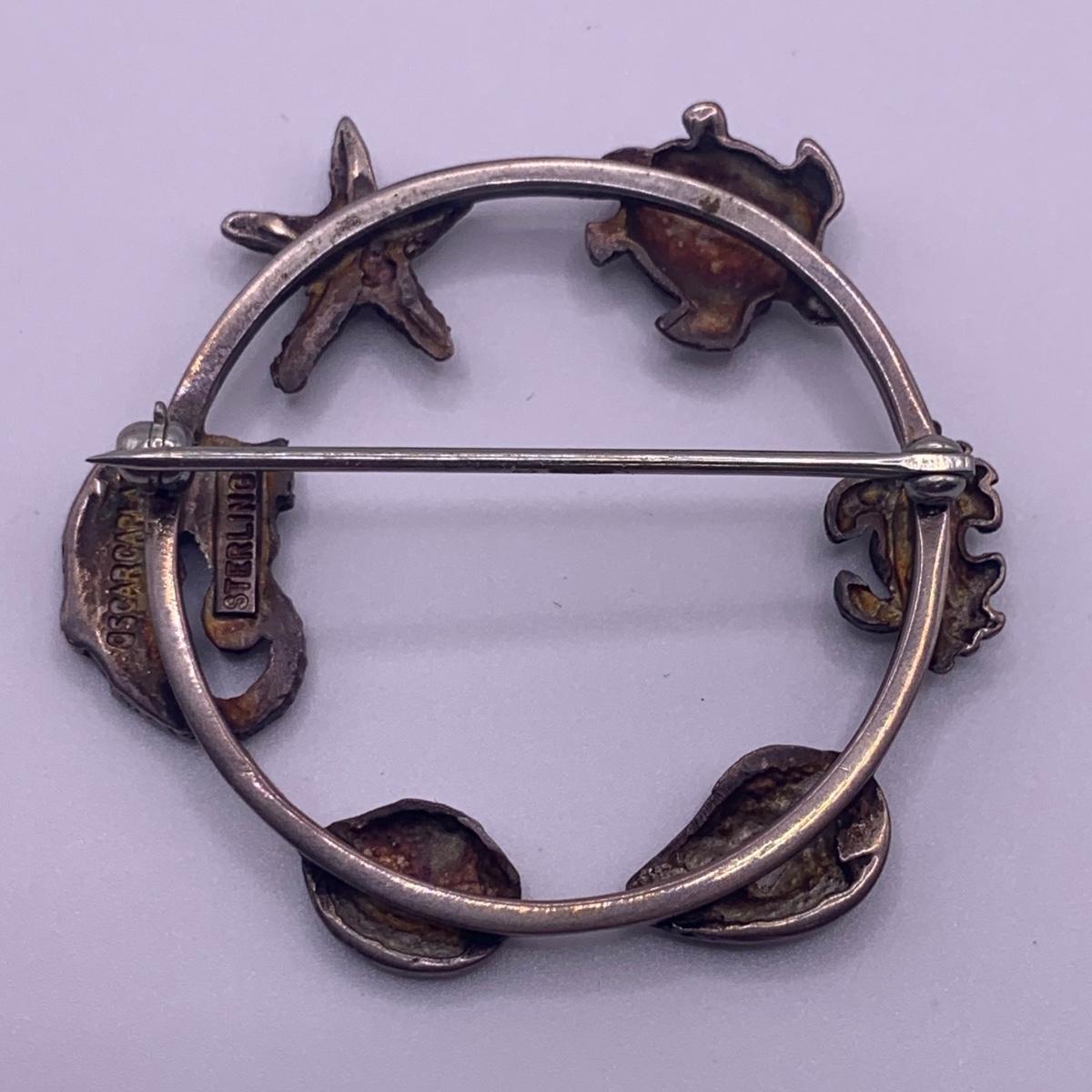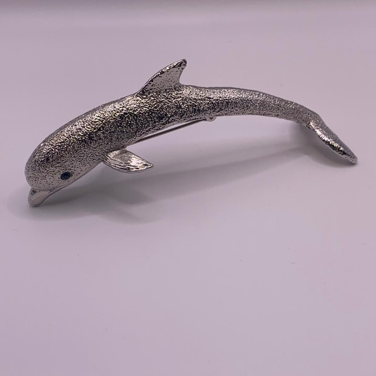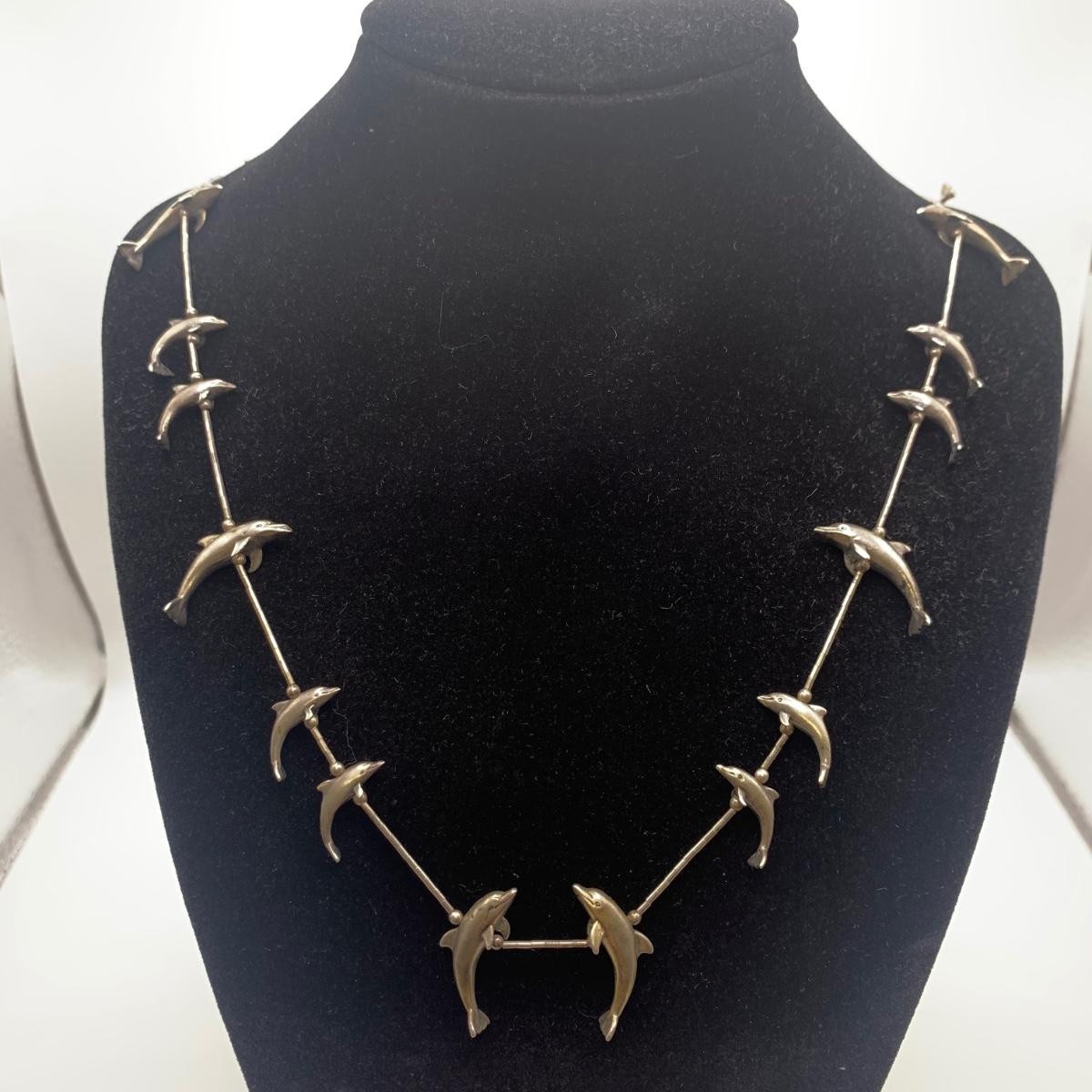 10 items total are included in this lot. Four have Sterling markings: the multi-dolphin necklace, the dolphin cuff bracelet, the circular sea life ‘Oscar Carlan’ pin, and the small shell pendant. Also included are a pair of dolphin clip-on earrings, a large dolphin pin with sparkly blue eyes, and three pendants. One pendant appears to be carved jade, one appears to be enameled, and the other has an indecipherable marking on metal that has a pewter appearance.