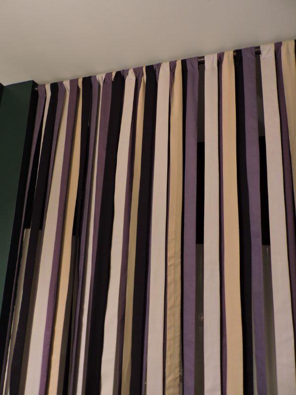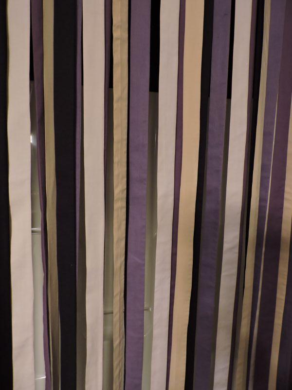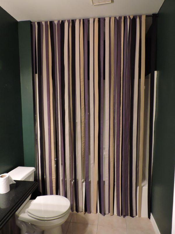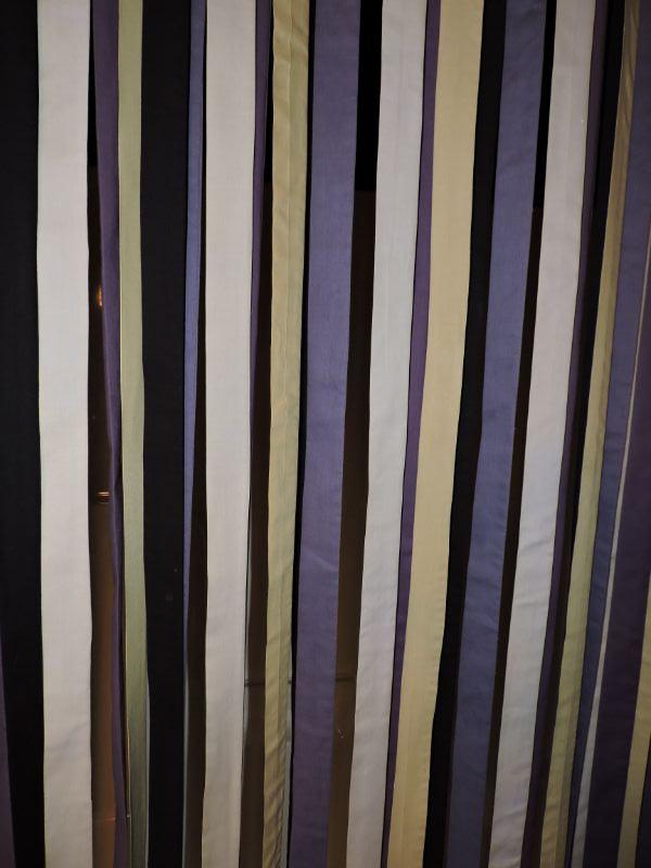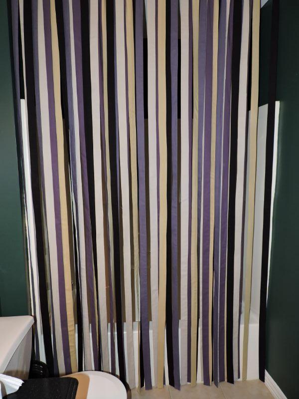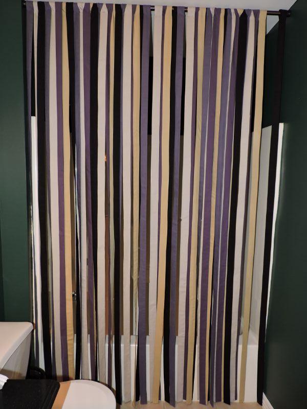 This striped strip shower curtain was hand-made and goes floor to ceiling. Each strip of fabric is about 1" wide. Two shades of purple, 2 tans, and black strips . Small weight inside each strip. Is about 8' tall.