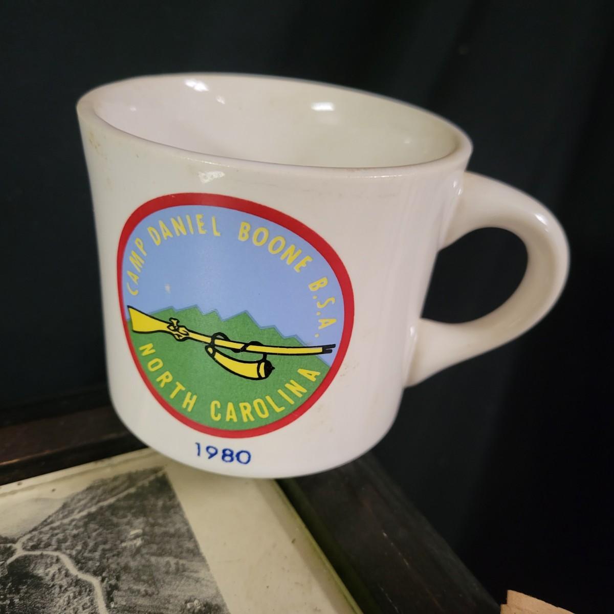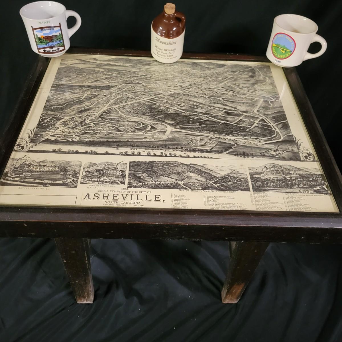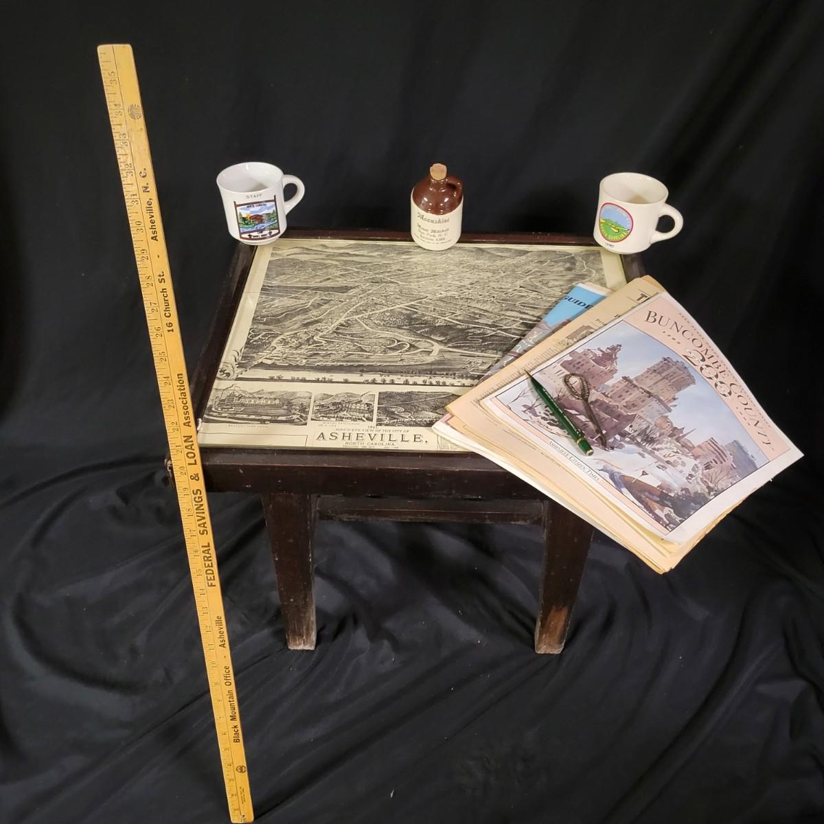 A wooden table, coffee mugs, and other Asheville regional memorabilia in good condition. This solid wood table features a dark brown stain with a glass top and a map depicting Asheville in 1891. The joins in the corners are a little loose and there are areas where the stain has worn on the legs. Measures approximately 22.5" x 18.5" x 19". Lot also includes two camp Daniel Boone coffee mugs, a ceramic moonshine jug from Mnt Mitchell, multiple vintage Asheville publications and other regional items. Local pickup only