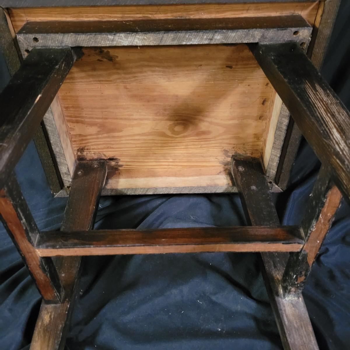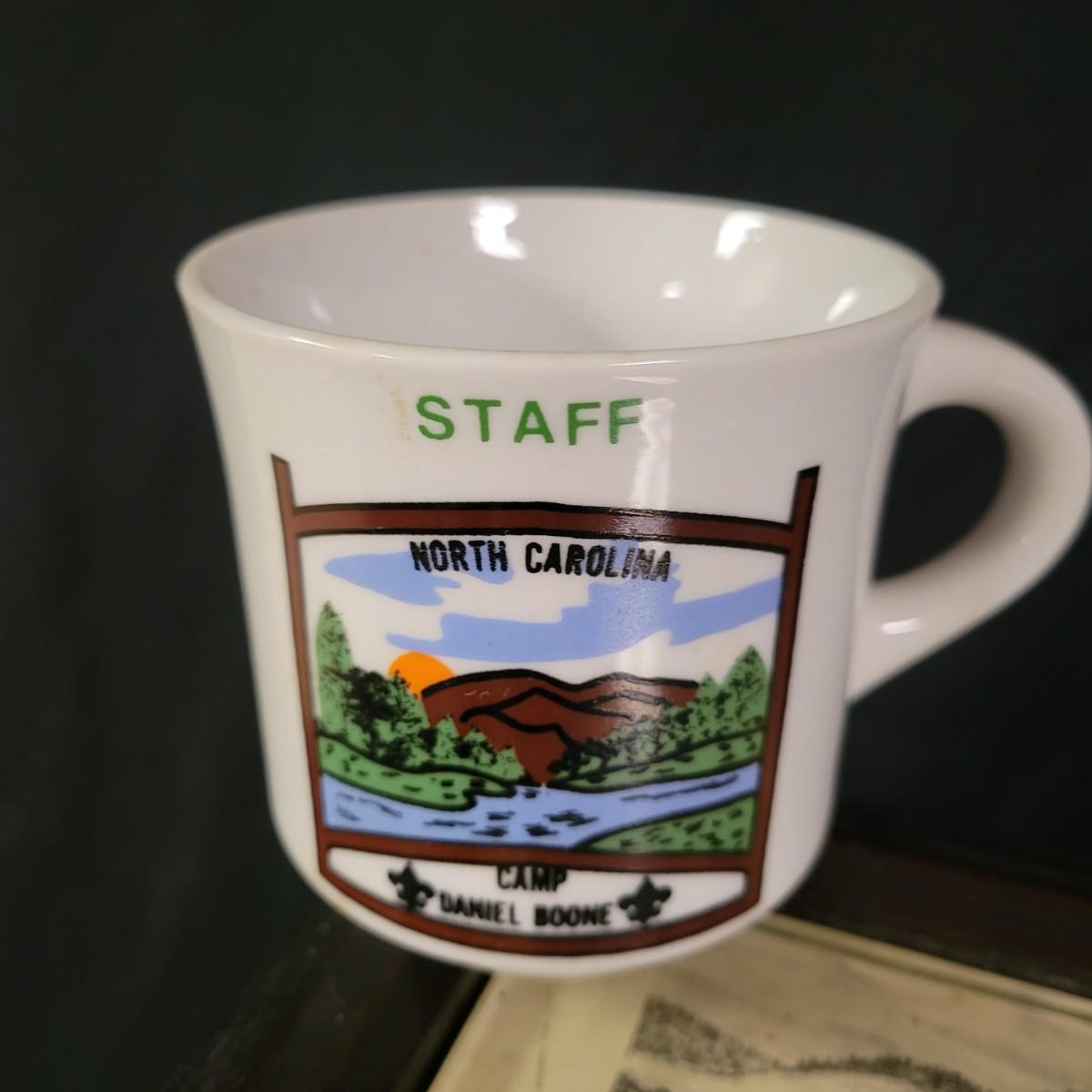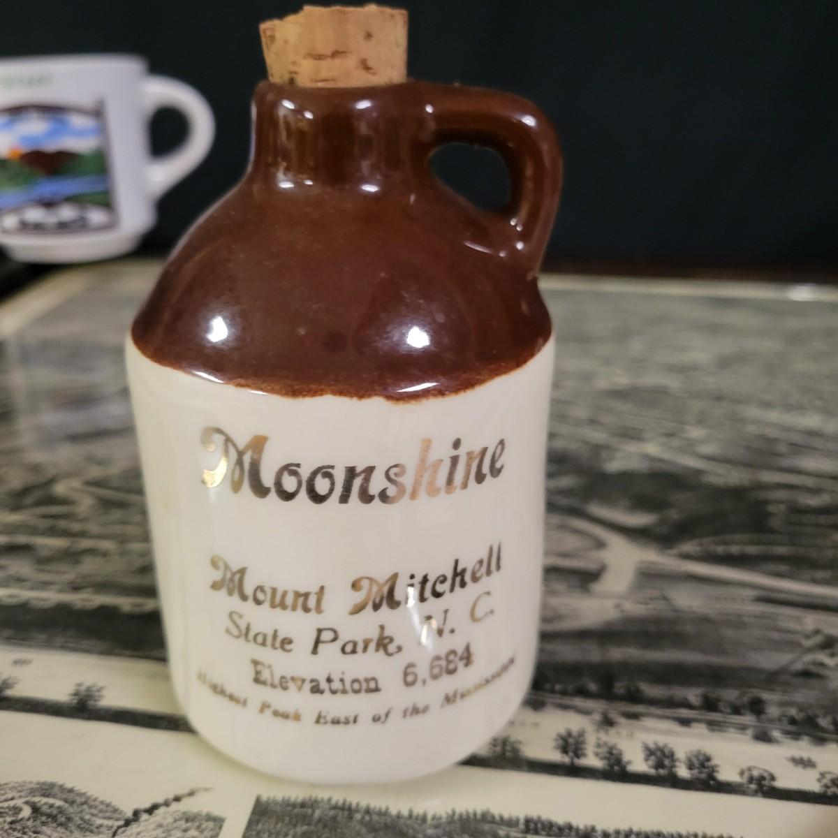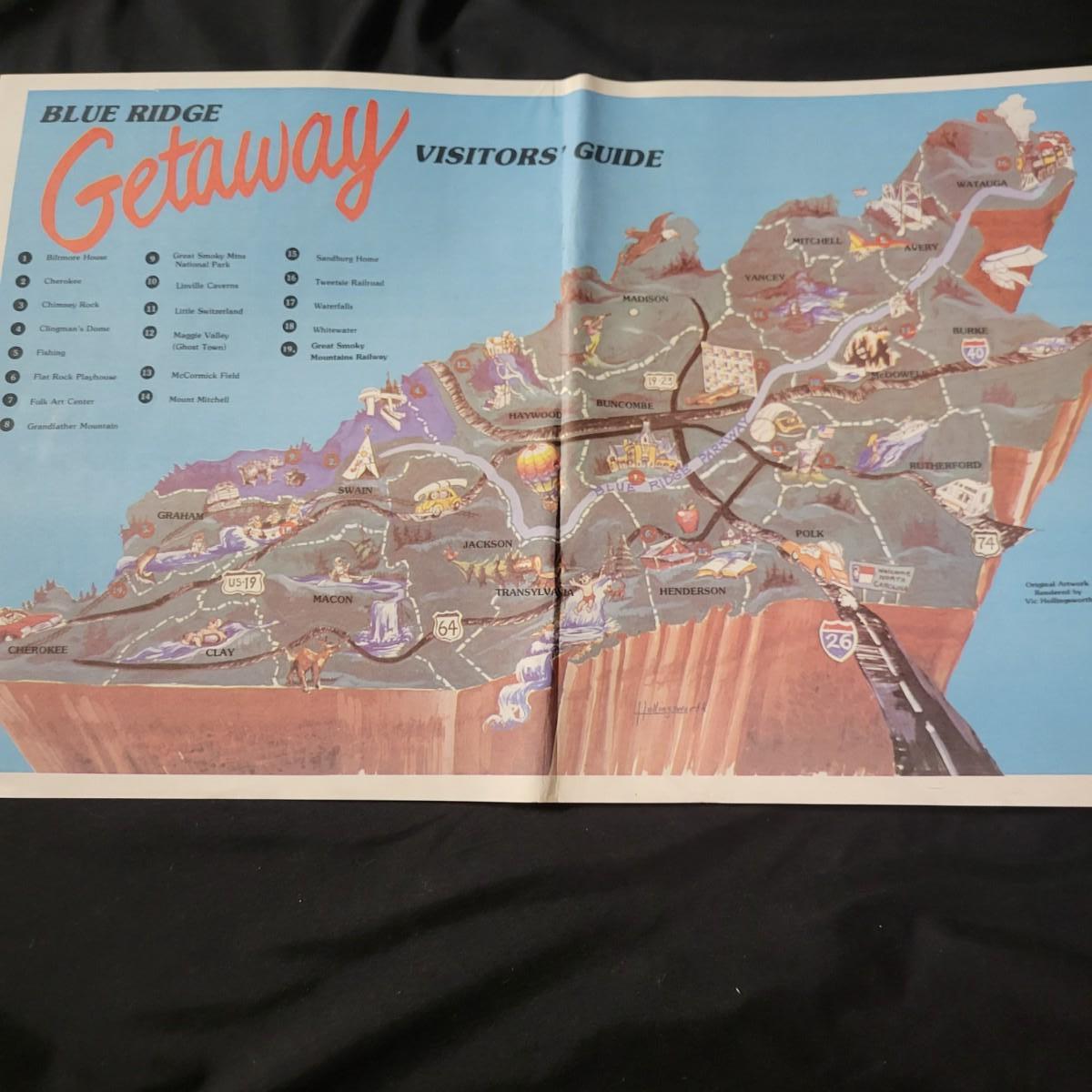 A wooden table, coffee mugs, and other Asheville regional memorabilia in good condition. This solid wood table features a dark brown stain with a glass top and a map depicting Asheville in 1891. The joins in the corners are a little loose and there are areas where the stain has worn on the legs. Measures approximately 22.5" x 18.5" x 19". Lot also includes two camp Daniel Boone coffee mugs, a ceramic moonshine jug from Mnt Mitchell, multiple vintage Asheville publications and other regional items. Local pickup only