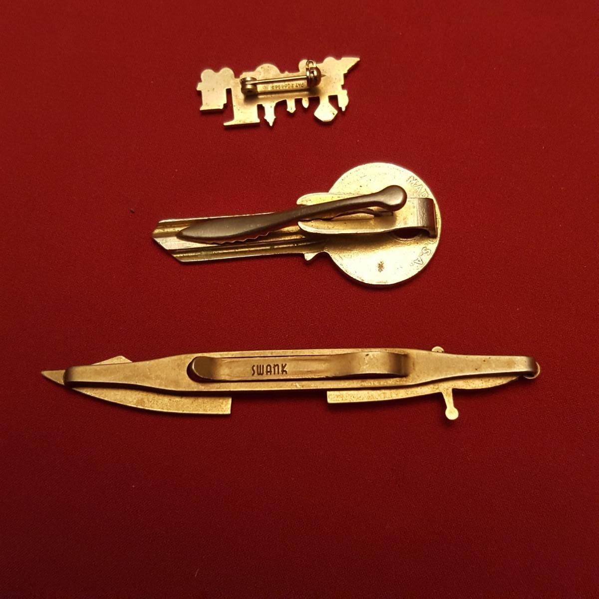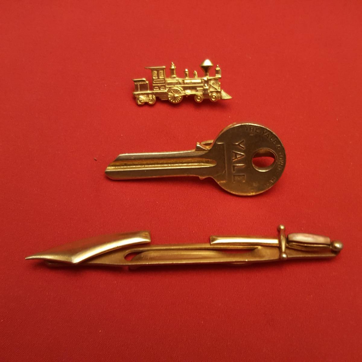 This auction lot is for two Unique Tie Clasps and a Train Pin. One of the clasps is designed as a sword and the other is made from a Yale key. The added bonus is a fun small Steam Train Locomotive lapel pin.