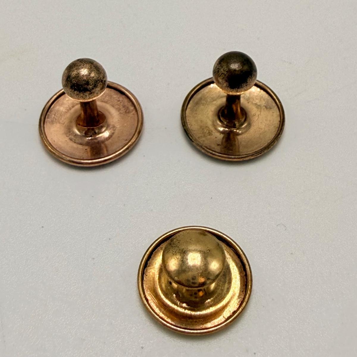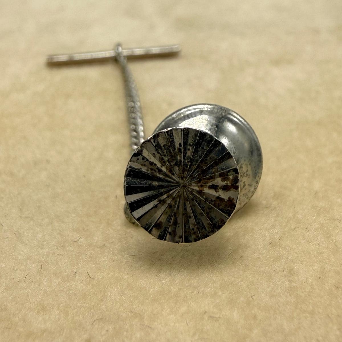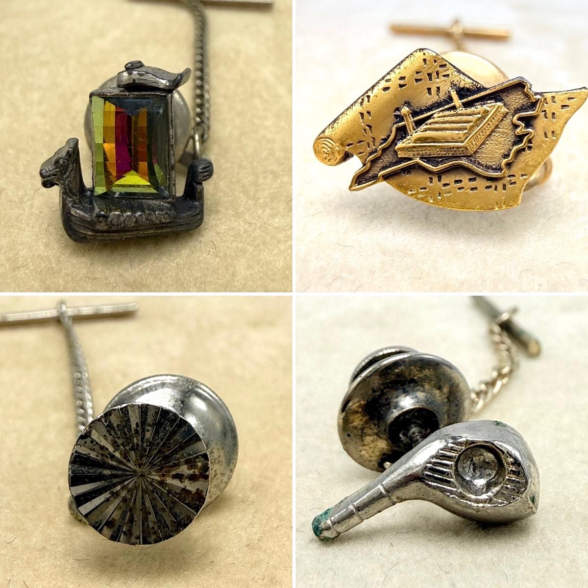 Four unique cufflinks plus three collar studs. The tie tack featuring the state of North Carolina is stamped 10K G.F. One tie tack stamped Swank is in the shape of a Viking longship and features a colorful faceted iridescent gemstone. The round tie tack is stamped “Simmons Sterling”. Please see photos for all other details.