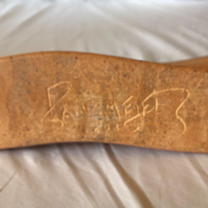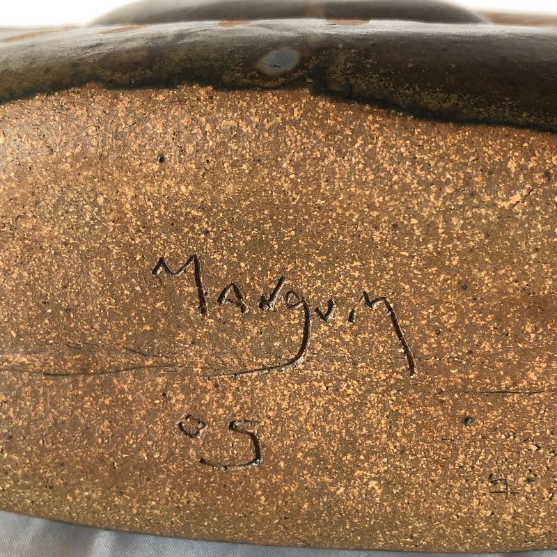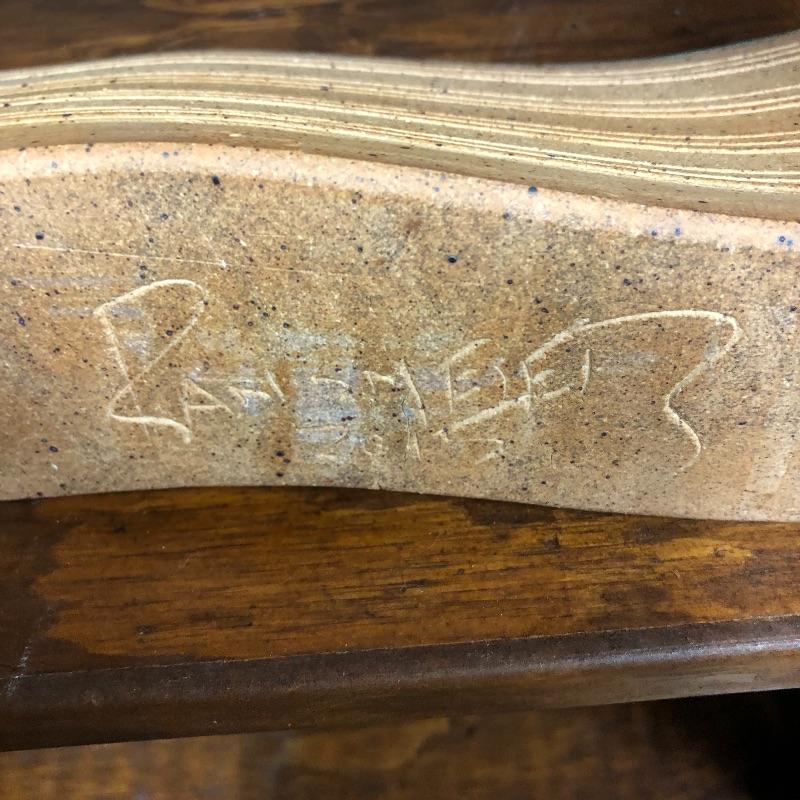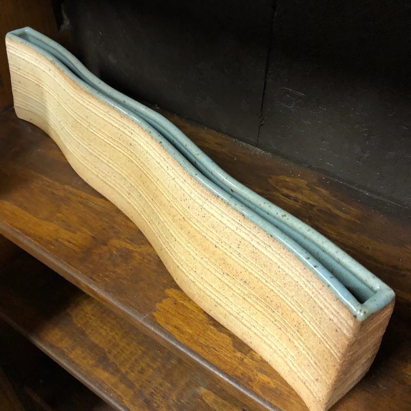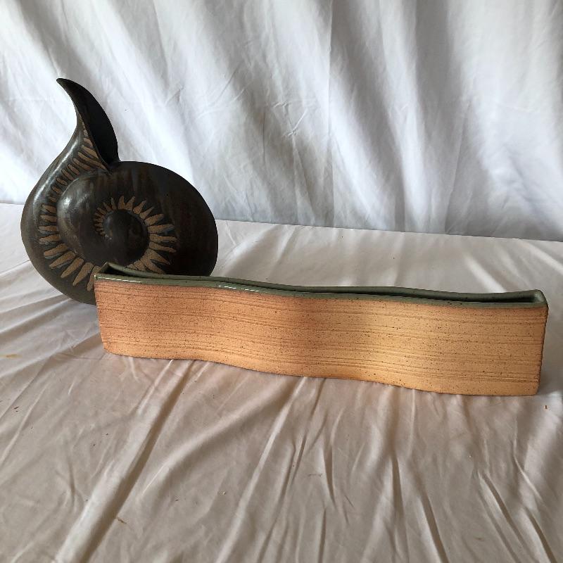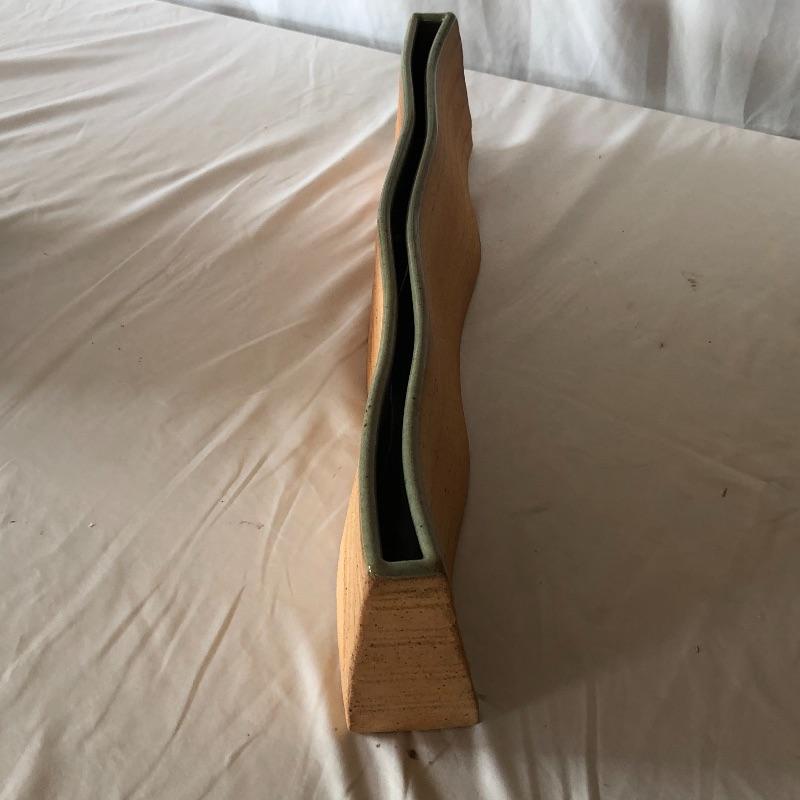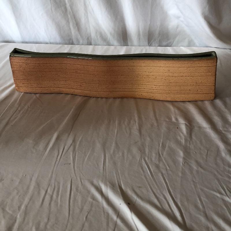 local artist in Weaverville- Magnum” from Magnum Pottery. It measures 21”x 1.5”x 4.5”. The long slender pottery vase boasts a warm tan color topped with a green edge and lining and measures 11”x 2.5“x 13”. It’s’ signature is hard to decipher-please see pictures. Both vases are signed.