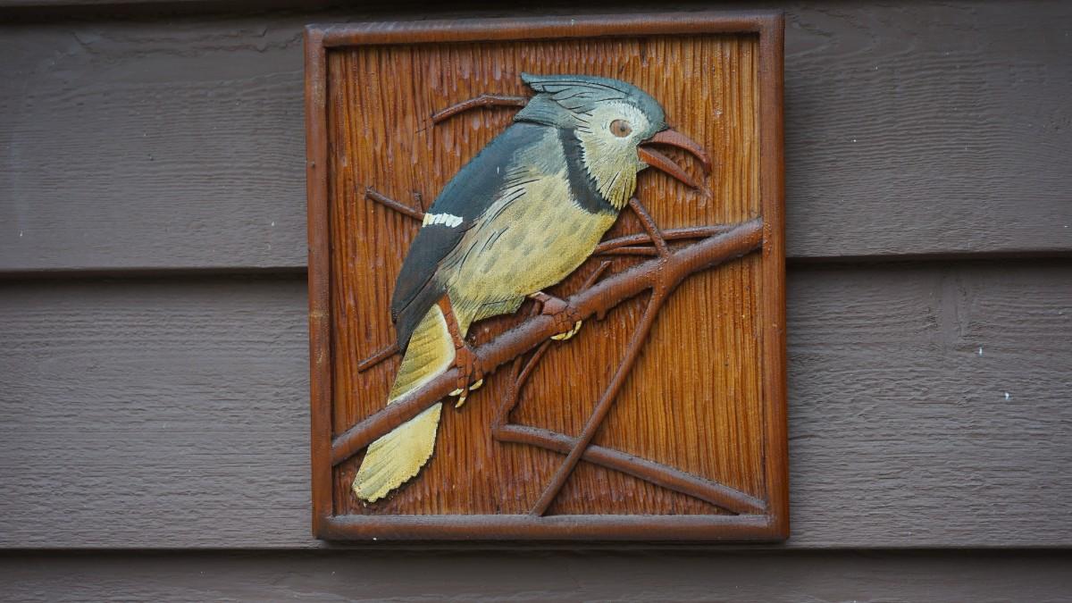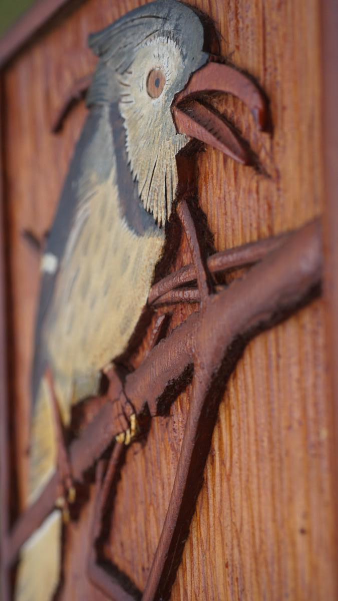this is a wood carved blue jay flat in form that was carved on a piece of wood.