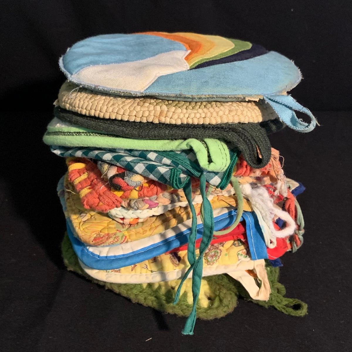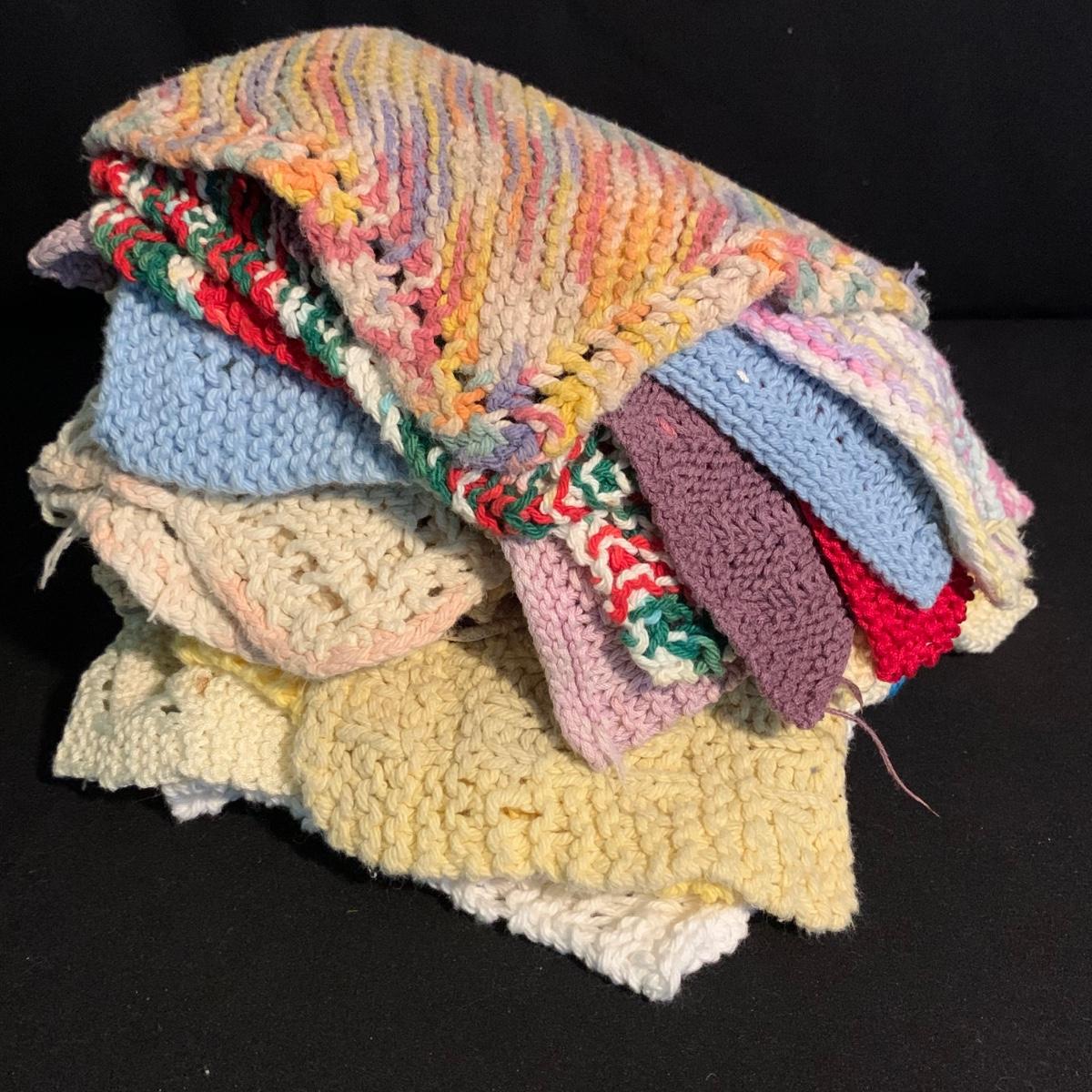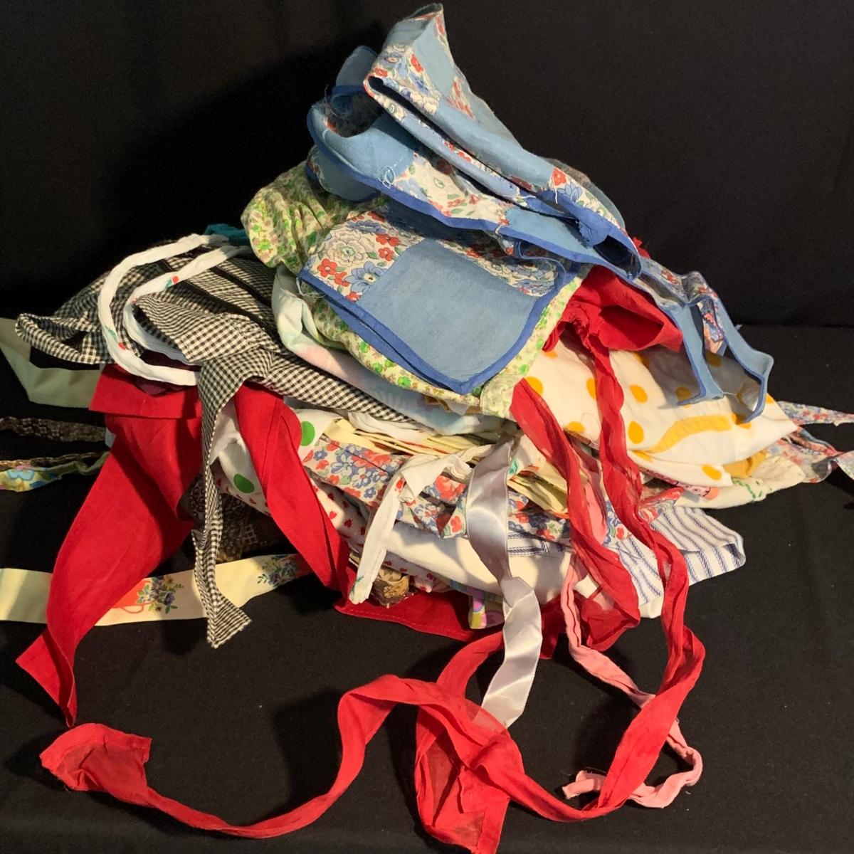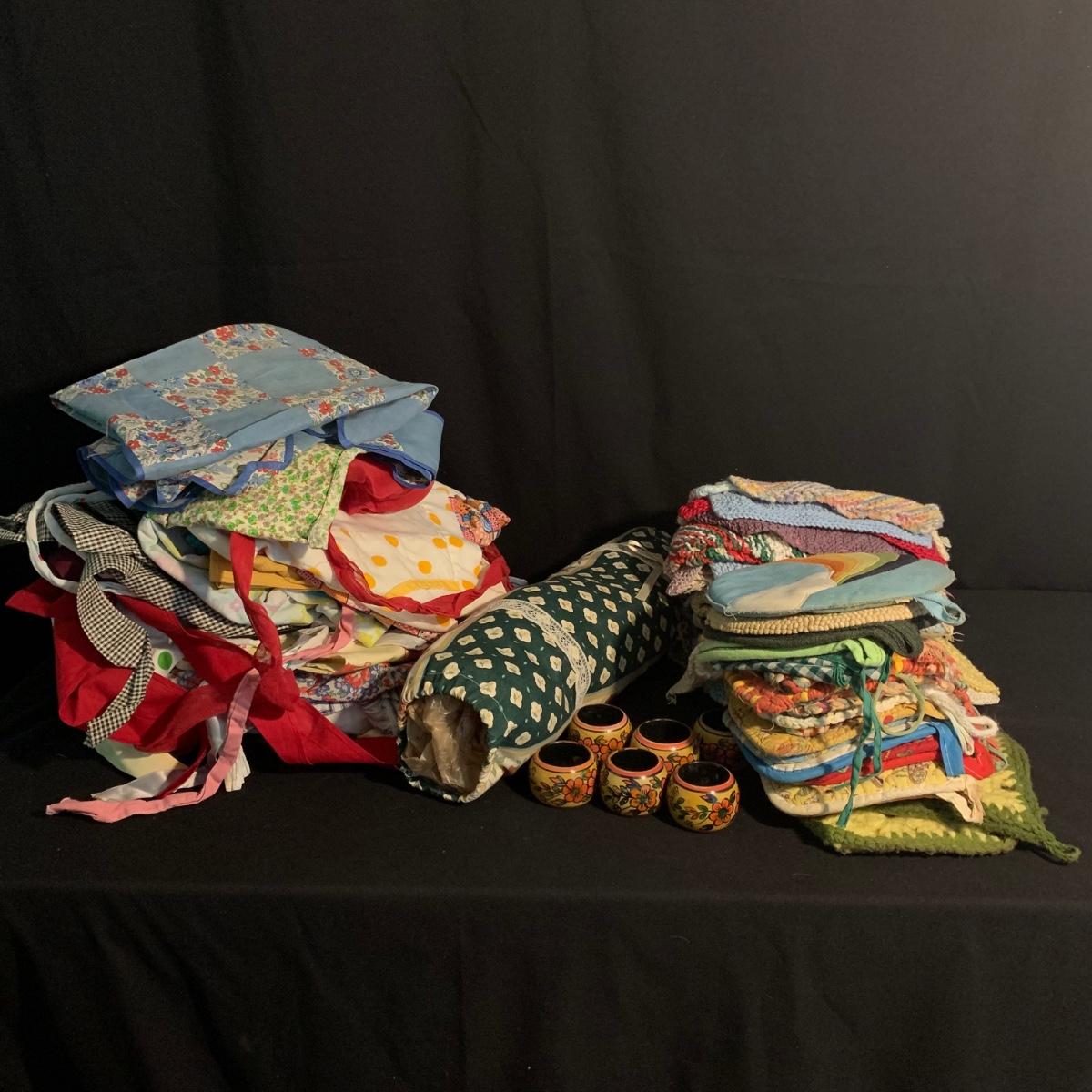 In this lot there are approximately 25 aprons, 20 potholders, 20 dishwashing cloths, 6 napkins rings, and a cloth tube used for storing plastic grocery bags. Most cloth items appear to be handmade. The aprons are sewn, the dish cloths are mostly crocheted. The napkin rings are painted wood and have a sticker that says they are made in India. Some aprons are full length and some are half length. Most items are in good condition. Some items are in fair condition with loose yarn or small holes. Shipping available.