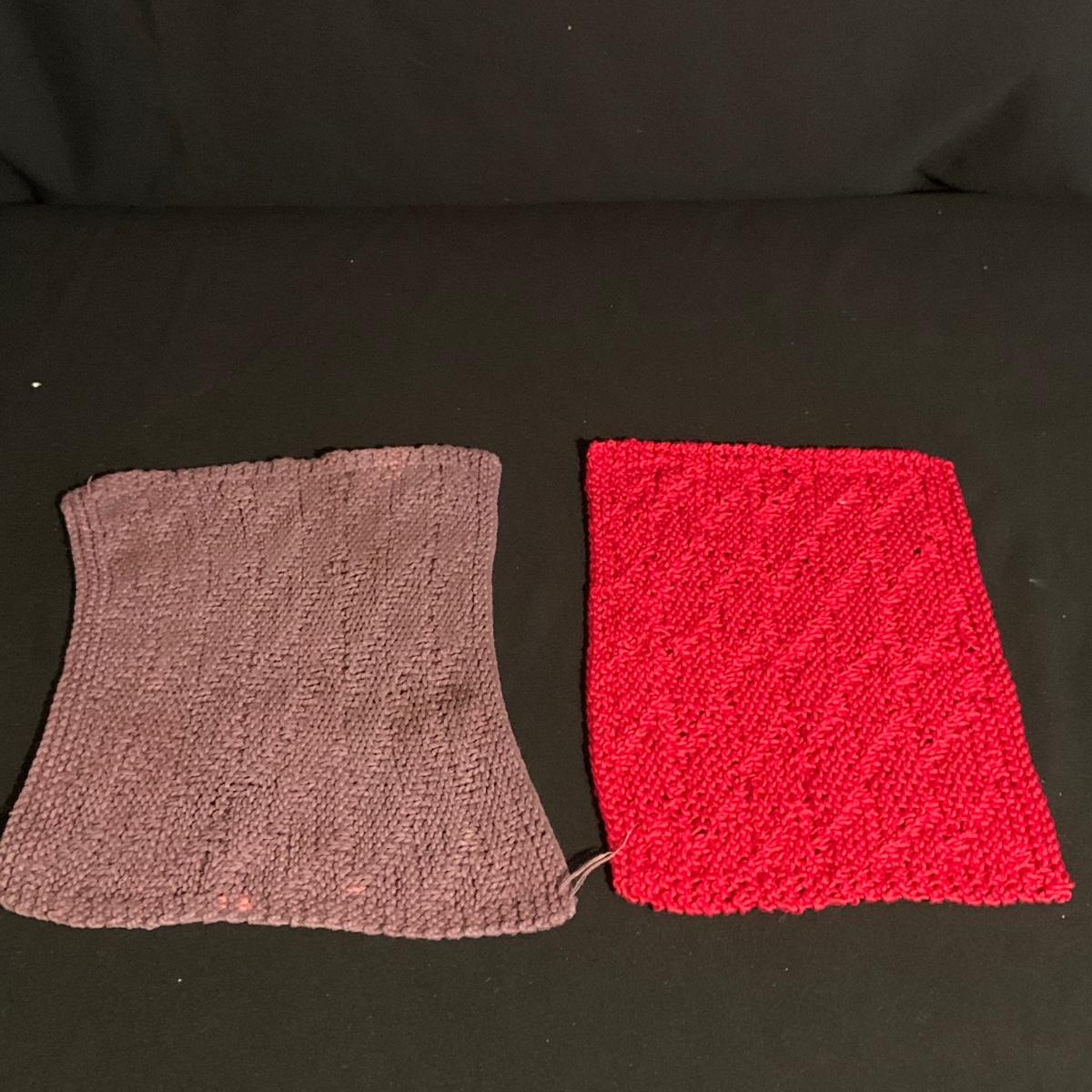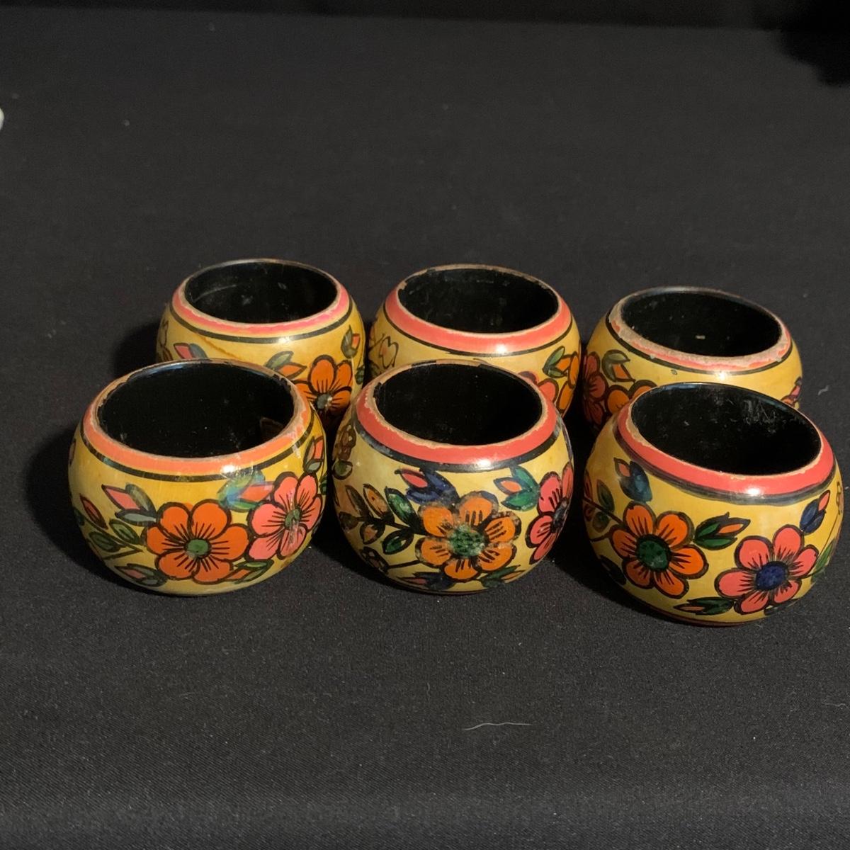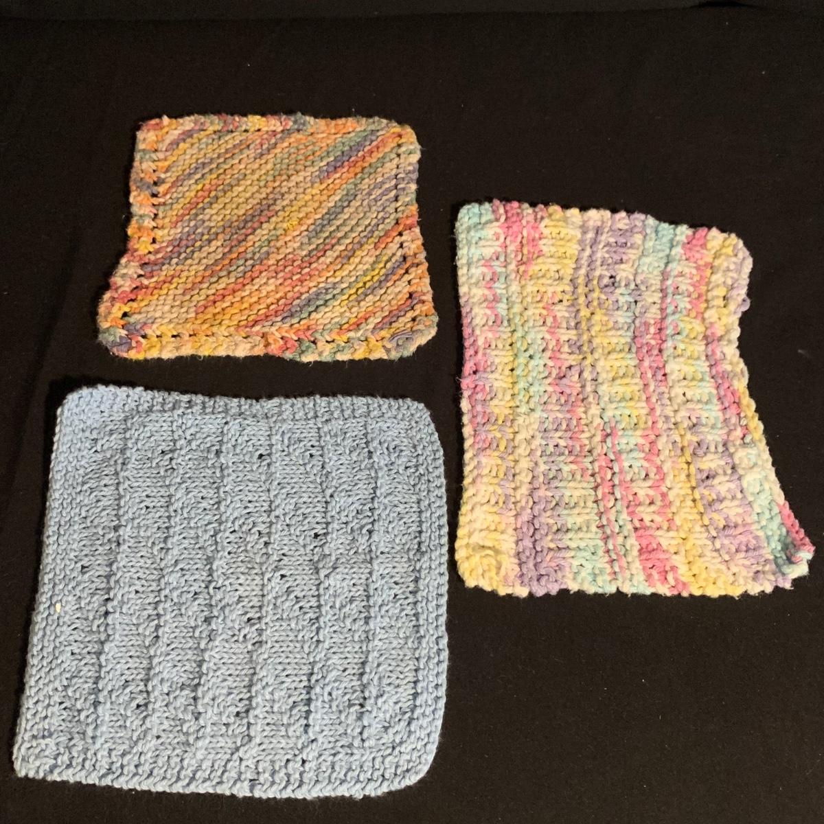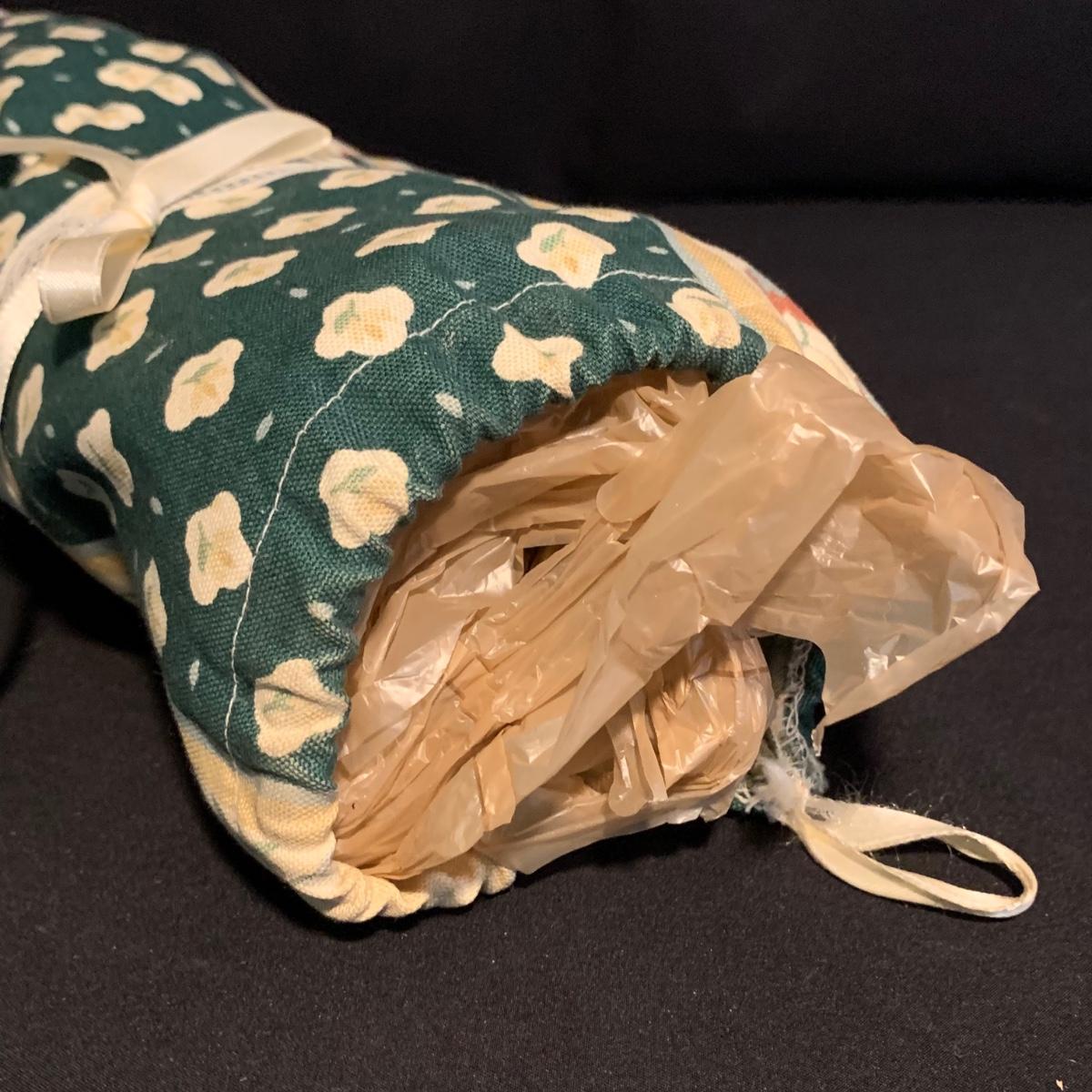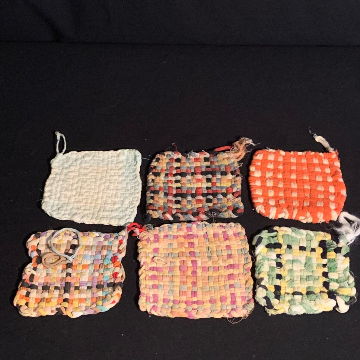 In this lot there are approximately 25 aprons, 20 potholders, 20 dishwashing cloths, 6 napkins rings, and a cloth tube used for storing plastic grocery bags. Most cloth items appear to be handmade. The aprons are sewn, the dish cloths are mostly crocheted. The napkin rings are painted wood and have a sticker that says they are made in India. Some aprons are full length and some are half length. Most items are in good condition. Some items are in fair condition with loose yarn or small holes. Shipping available.