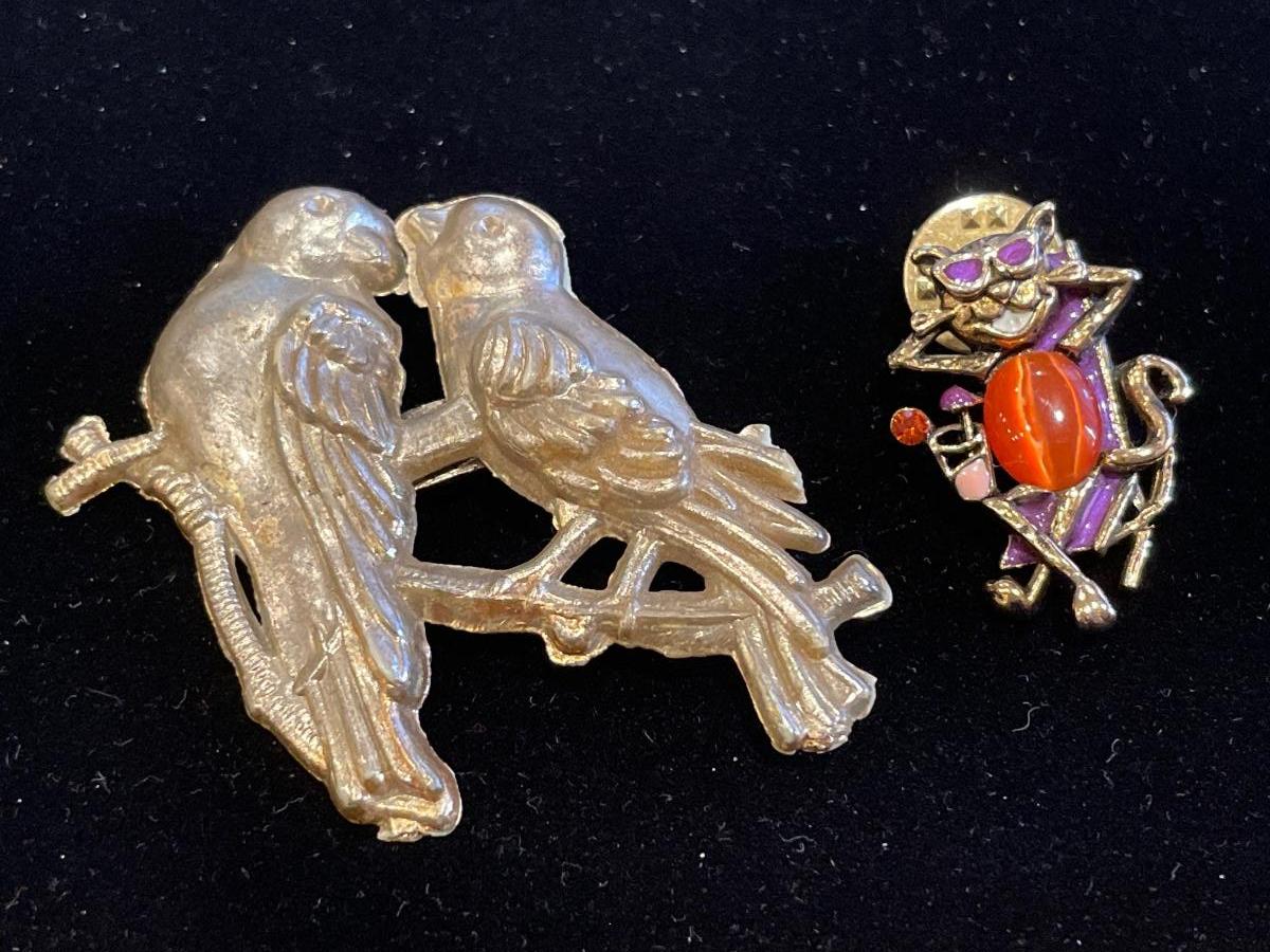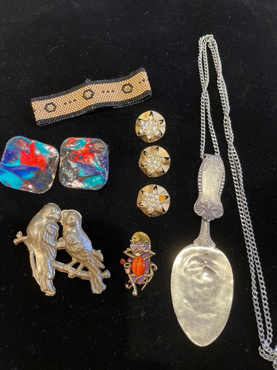 Sparkly button covers, clip on earrings, spoon pendant, cat & bird pin and beaded bracelet