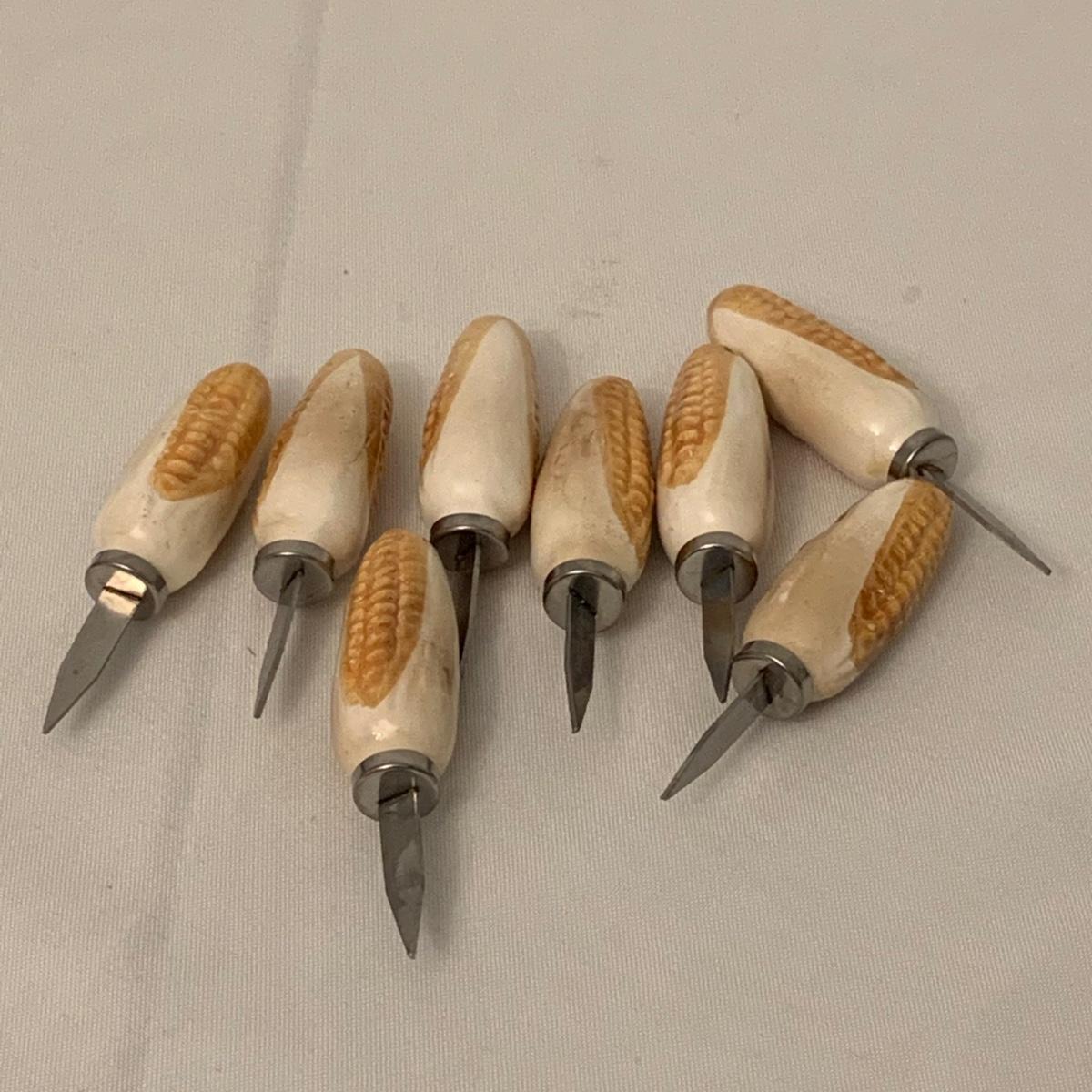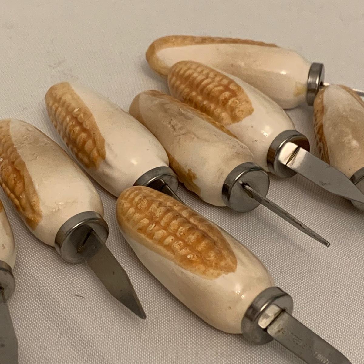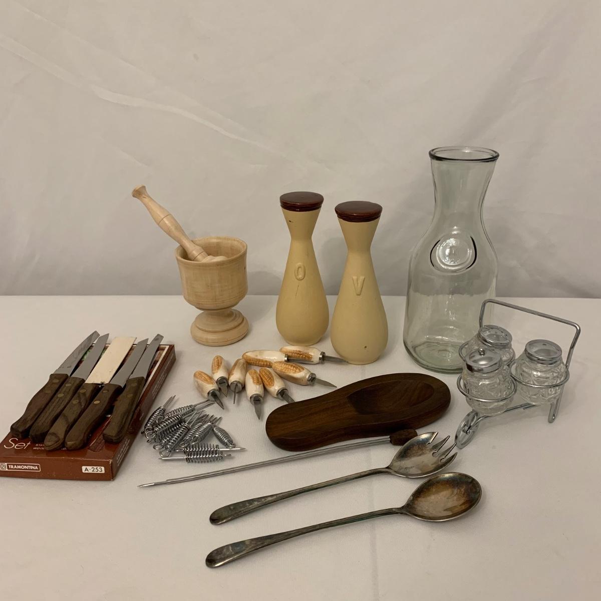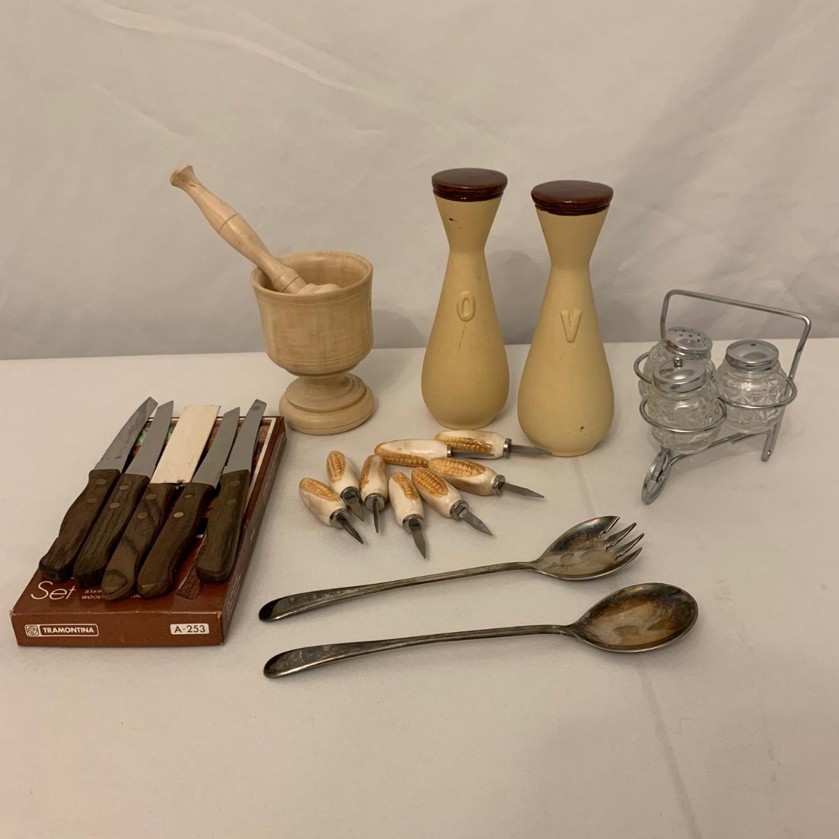 Collection of unique and vintage kitchen items includes Italian made silver plated salad serving set, ice pick, wood spoon rest, little metal cart with glass salt and pepper shakers, a glass pitcher, ceramic oil and vinegar jar set, wood mortar and pestle, two sets of corn cob holders, a 6-piece Tramontina steak knife set, and a 5-piece steak knife set. The salad serving set is tarnished and there are signs of wear on the corn holders and knives, but otherwise all items seem to be in good condition. Shipping available.