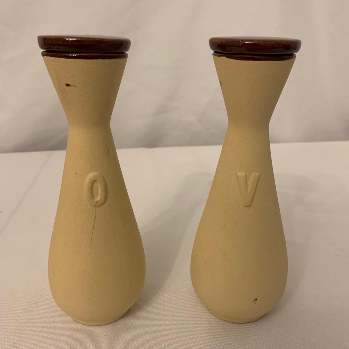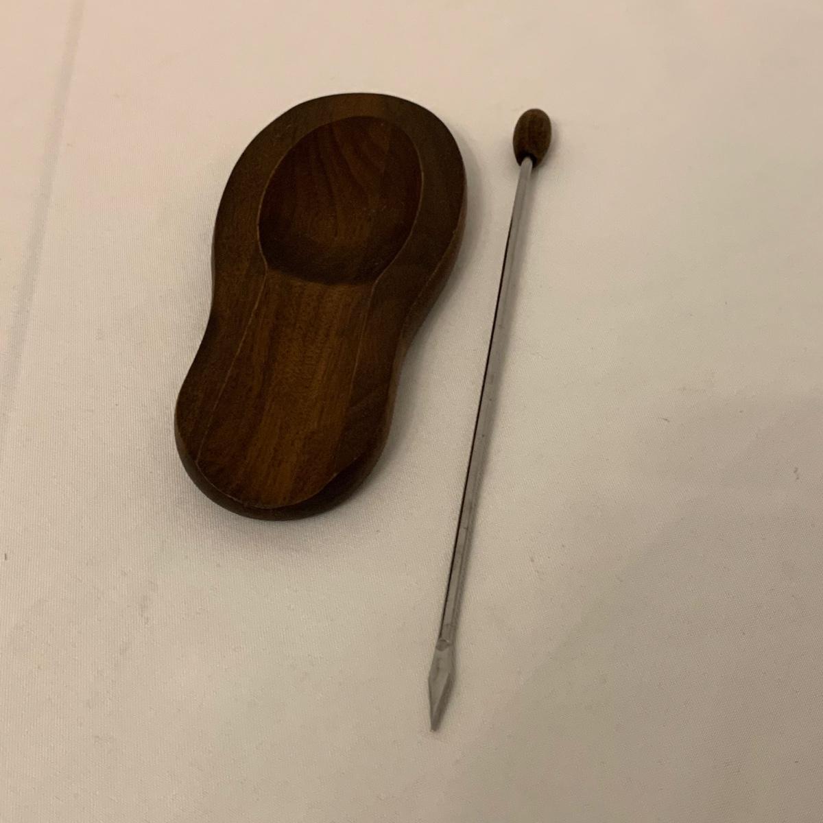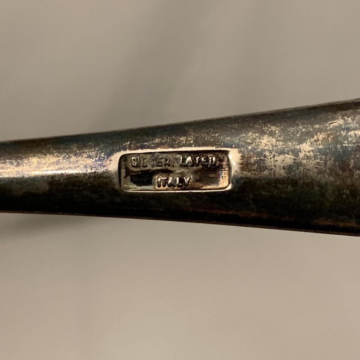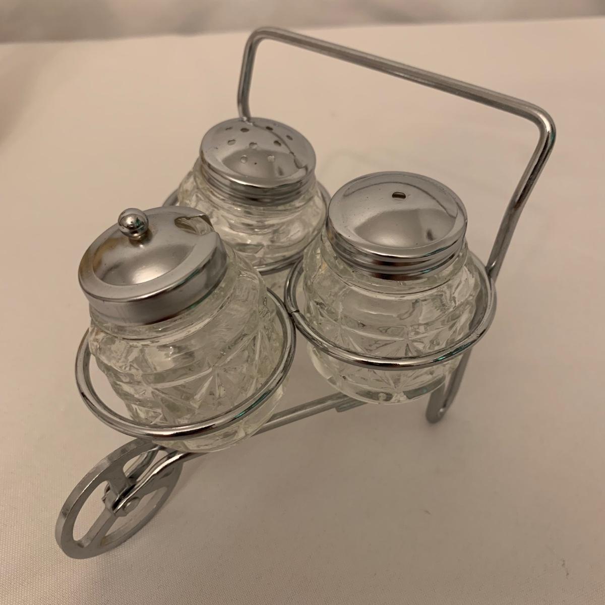 Collection of unique and vintage kitchen items includes Italian made silver plated salad serving set, ice pick, wood spoon rest, little metal cart with glass salt and pepper shakers, a glass pitcher, ceramic oil and vinegar jar set, wood mortar and pestle, two sets of corn cob holders, a 6-piece Tramontina steak knife set, and a 5-piece steak knife set. The salad serving set is tarnished and there are signs of wear on the corn holders and knives, but otherwise all items seem to be in good condition. Shipping available.