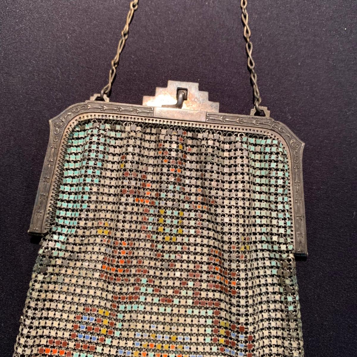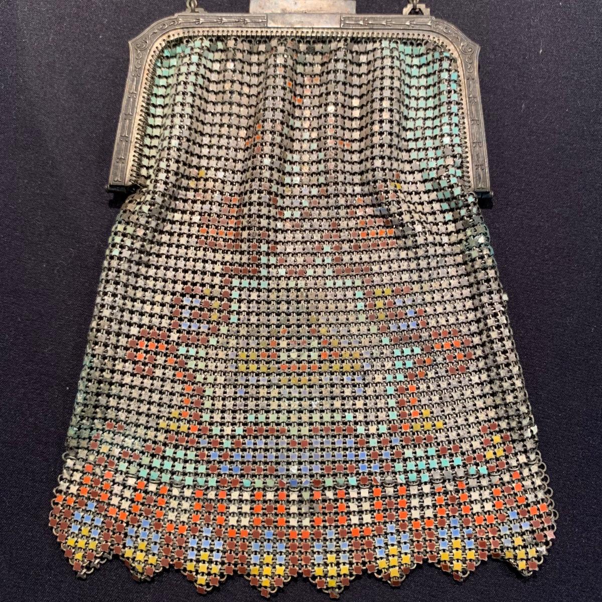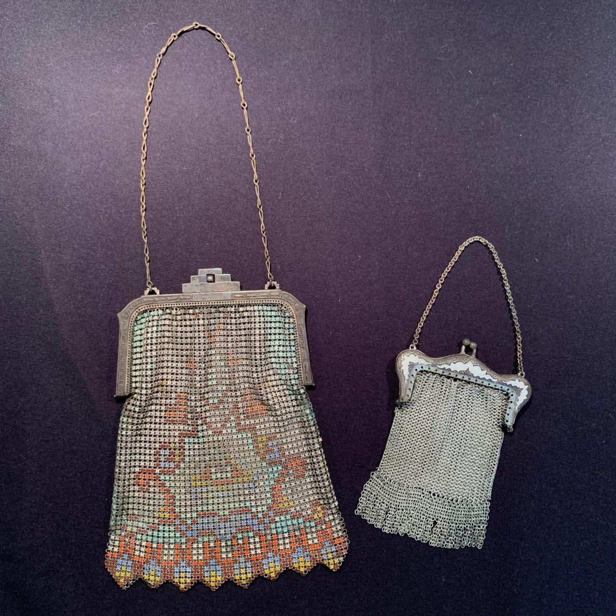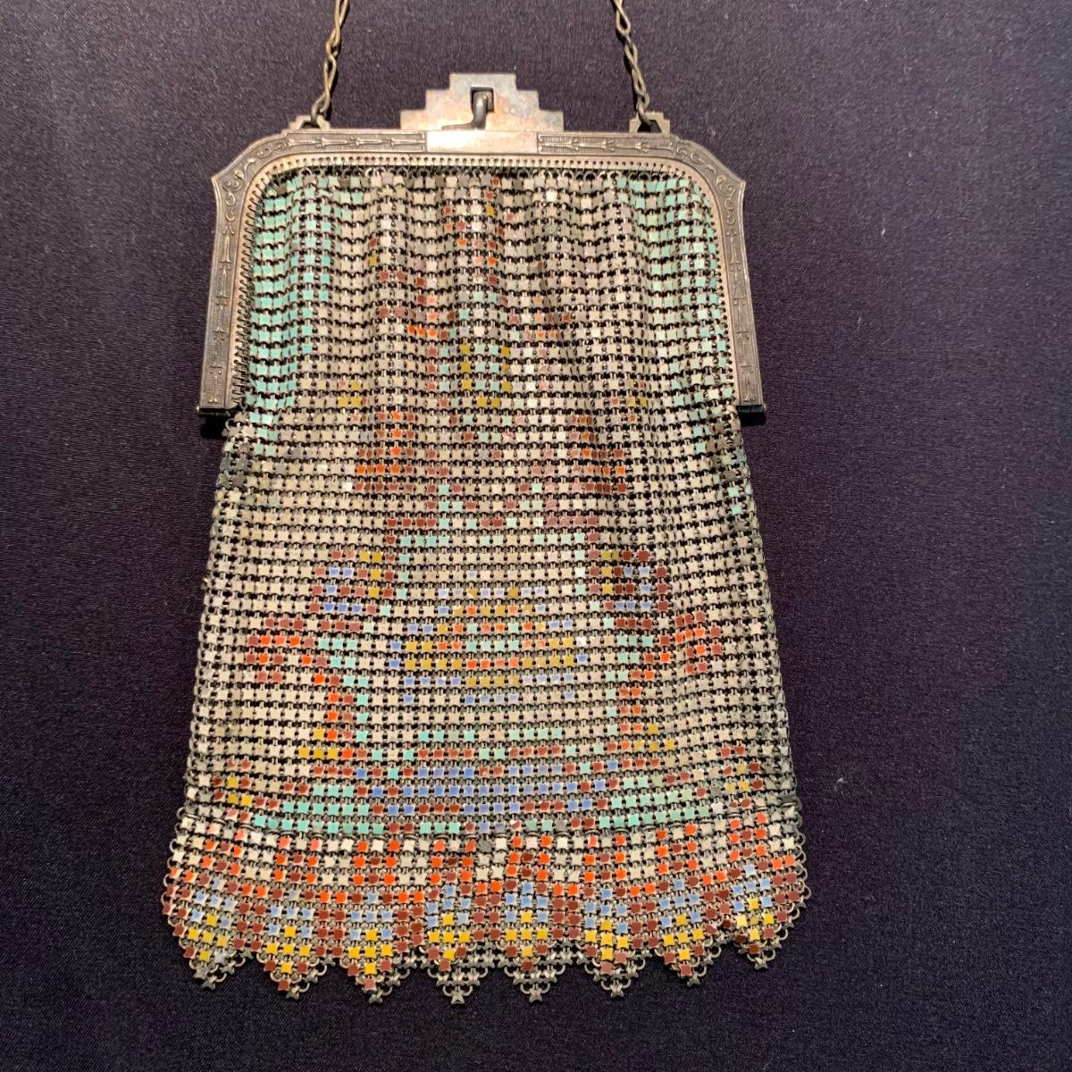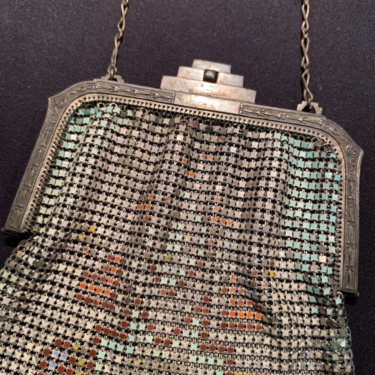 Two unique vintage metal/mesh purses. The colorful one is a Whiting & Davis Co. Mesh Bag. It measures approximately 4” x 7” (not including the chain handle). The other is a Modele Depose that measures approximately 2.75” x 4”. Note some of the links coming off the metal wires on the Modele Depose. They are both very delicate. Shipping available.