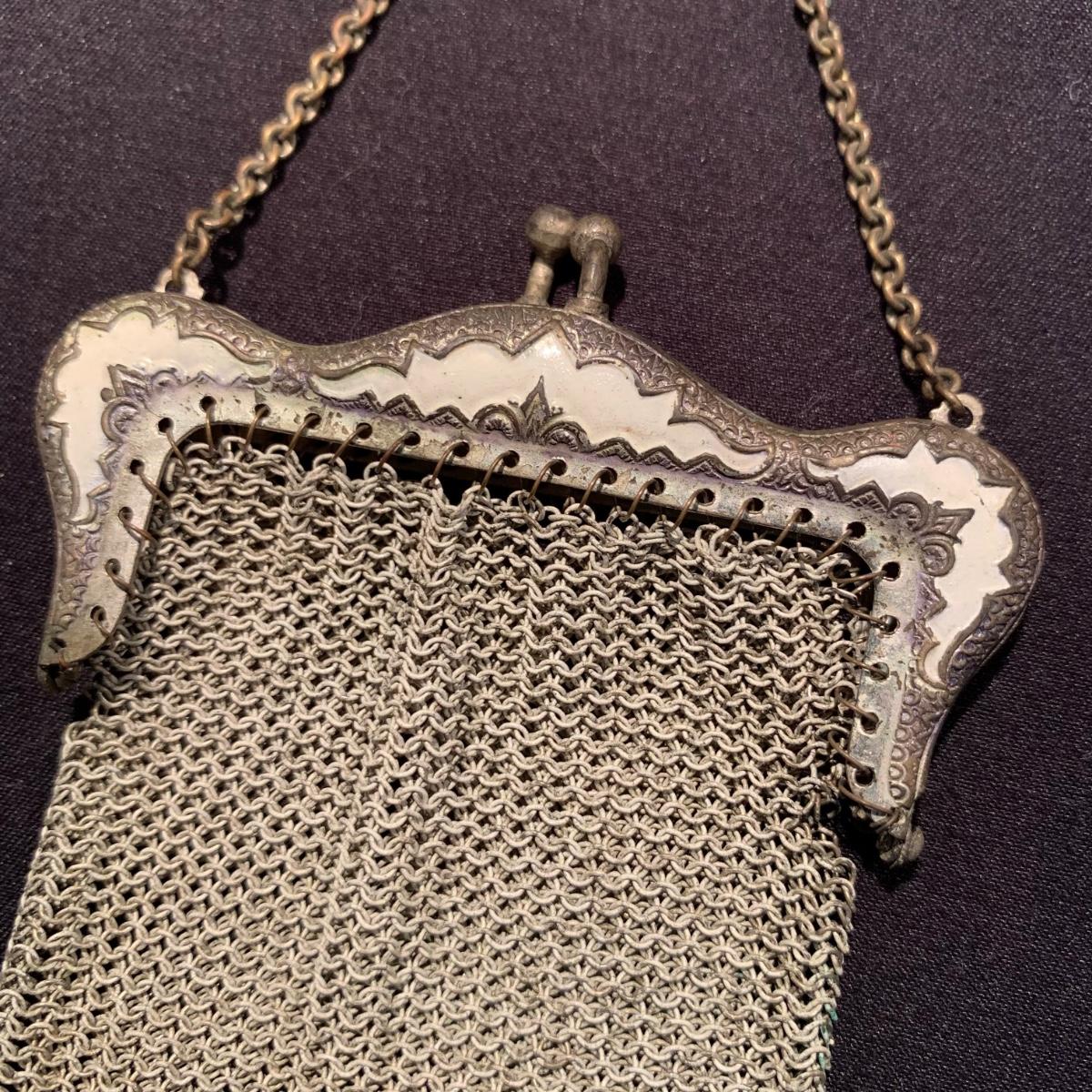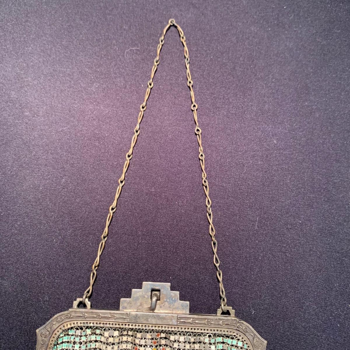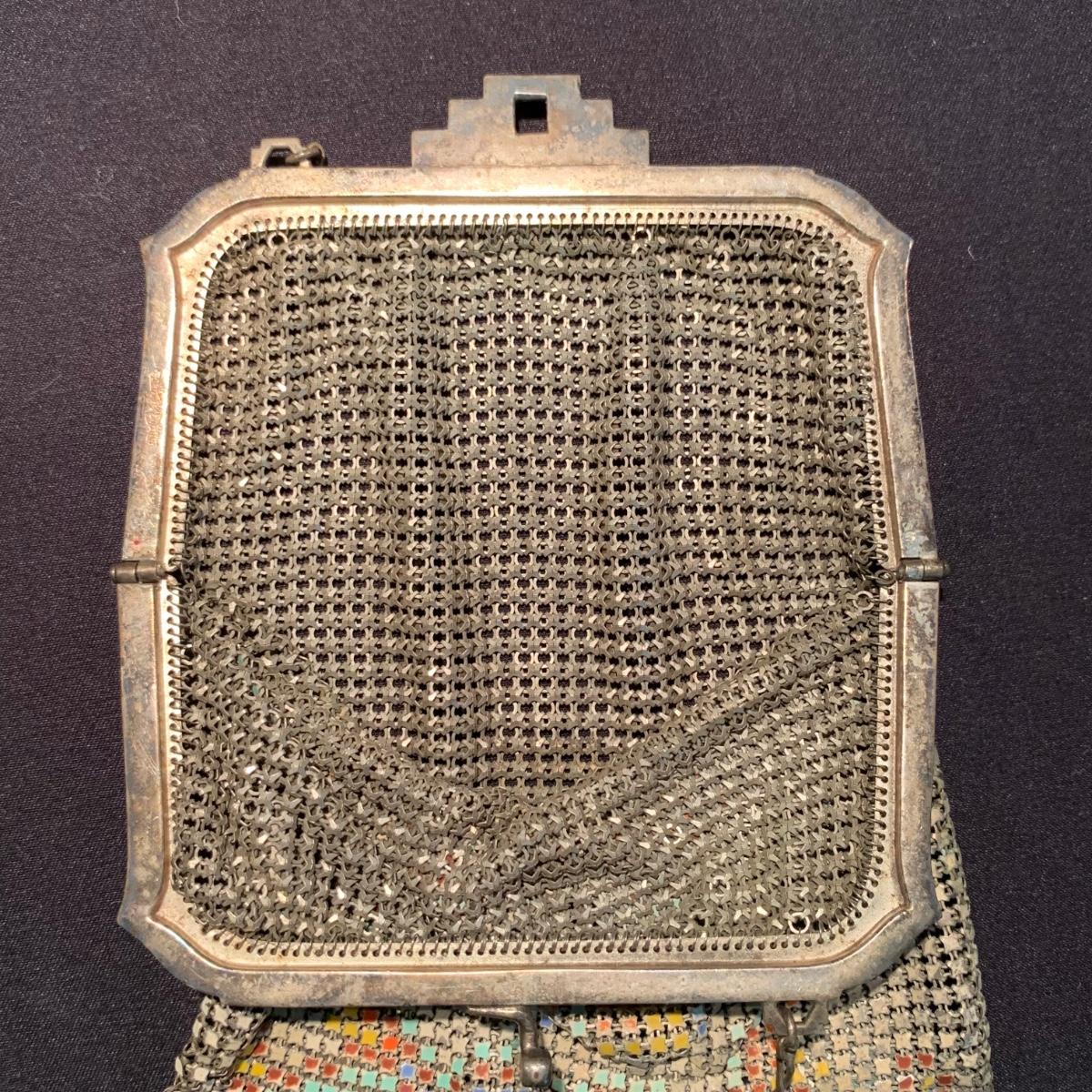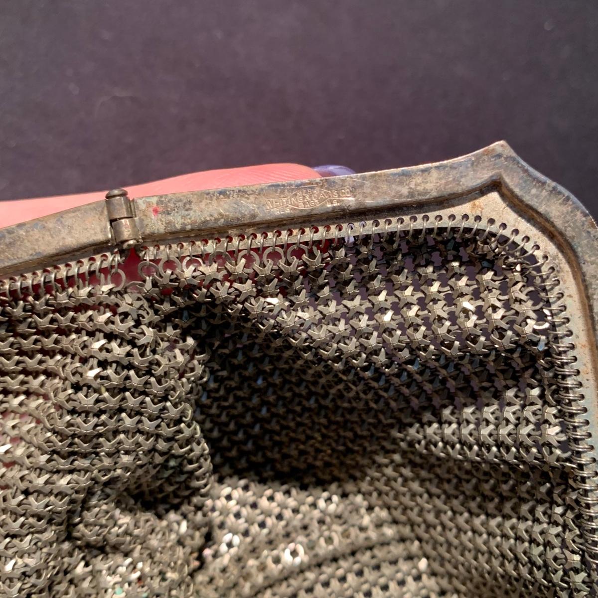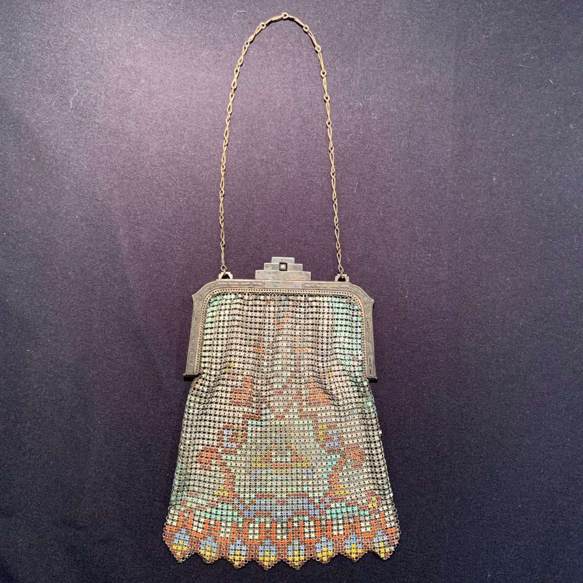 Two unique vintage metal/mesh purses. The colorful one is a Whiting & Davis Co. Mesh Bag. It measures approximately 4” x 7” (not including the chain handle). The other is a Modele Depose that measures approximately 2.75” x 4”. Note some of the links coming off the metal wires on the Modele Depose. They are both very delicate. Shipping available.