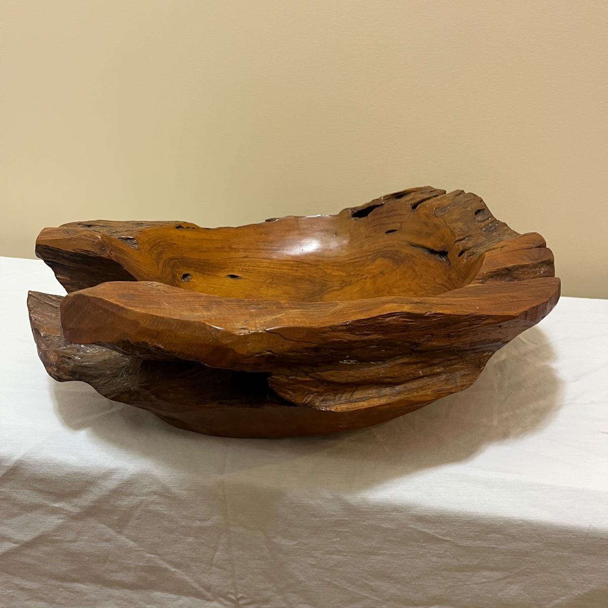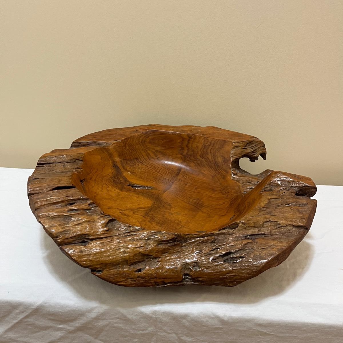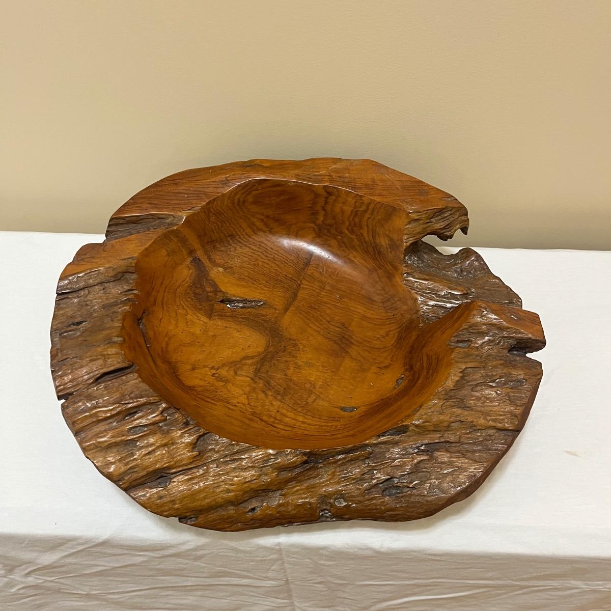 Lot includes a unique wooden bowl that appears to be a carved teak root bowl.