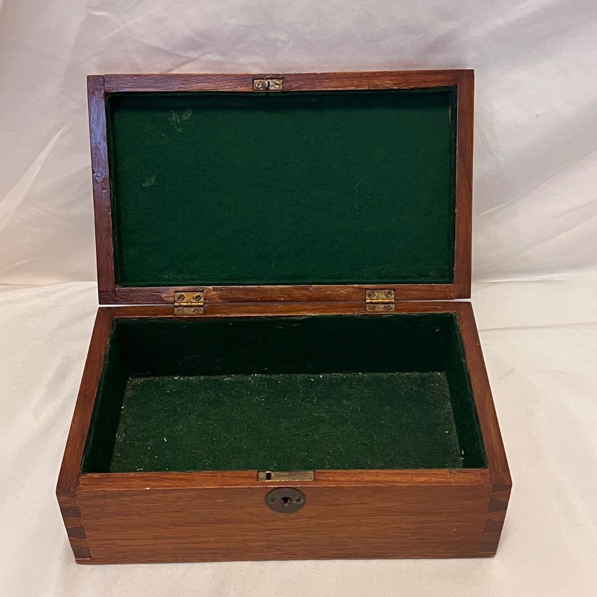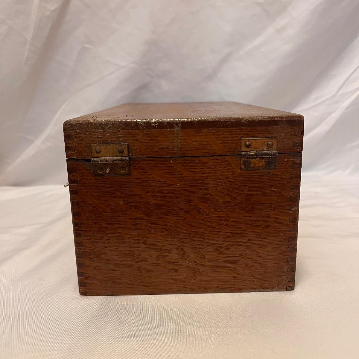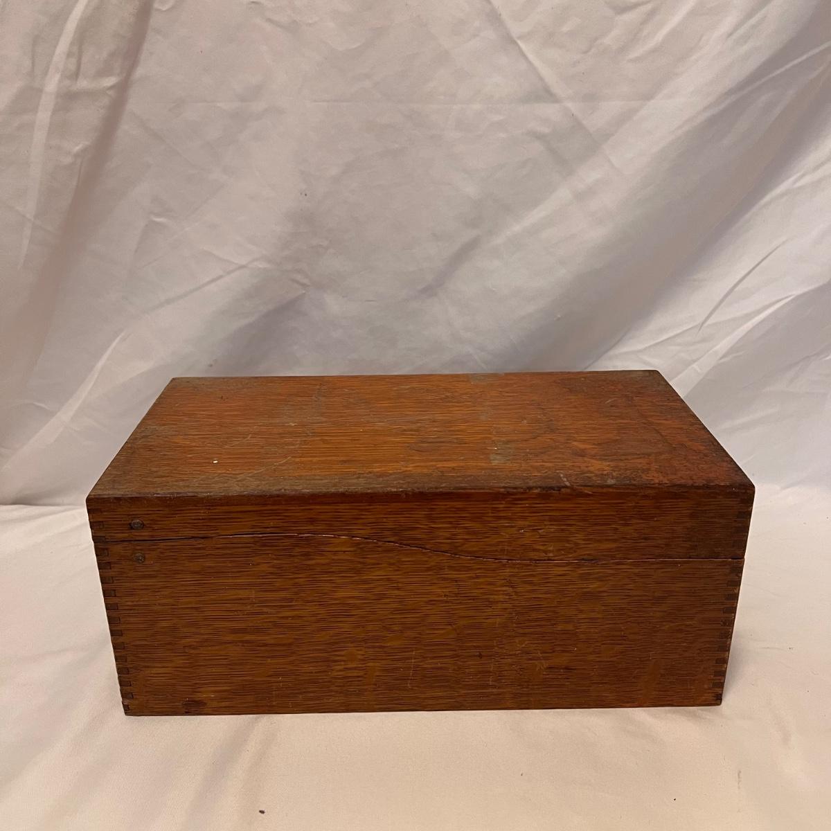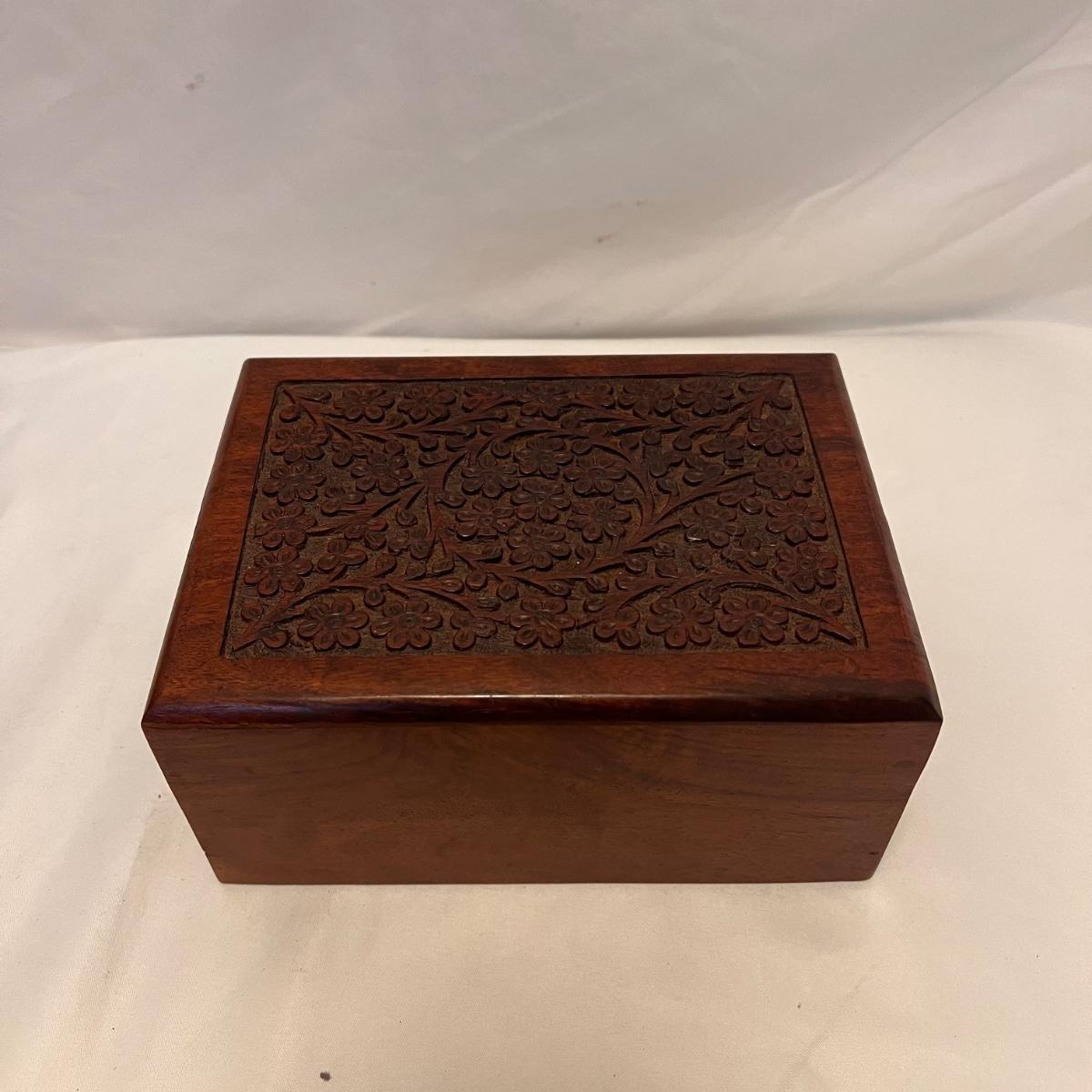 This lot includes five wooden boxes of various sizes. The smallest box measures 8” x 5.5” x 2.5”H and the largest 13” x 6.95” x 5.5”H. The first box individually pictured appears to be a vintage oak index card file/recipe box with dovetailed detail on the sides. The second box with the floral carvings appears to be made in India. The third is just a simple wooden box. The fourth is an old Punch cigar box. Lastly, the fifth appears to be mahogany box with dovetailed detail on the side. The box is lined with green felt and has a spot for a key on the front - no key included. Shipping available.