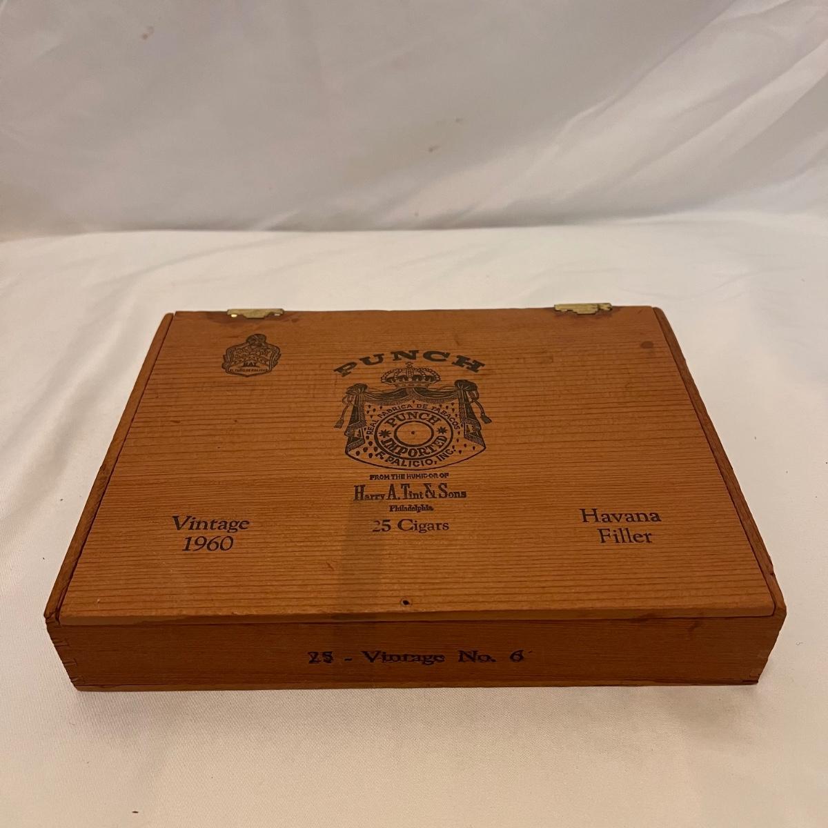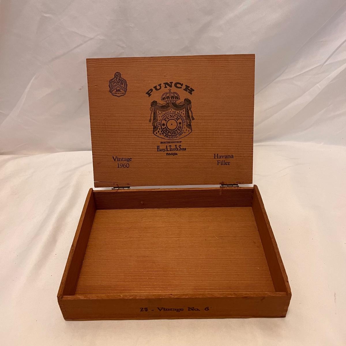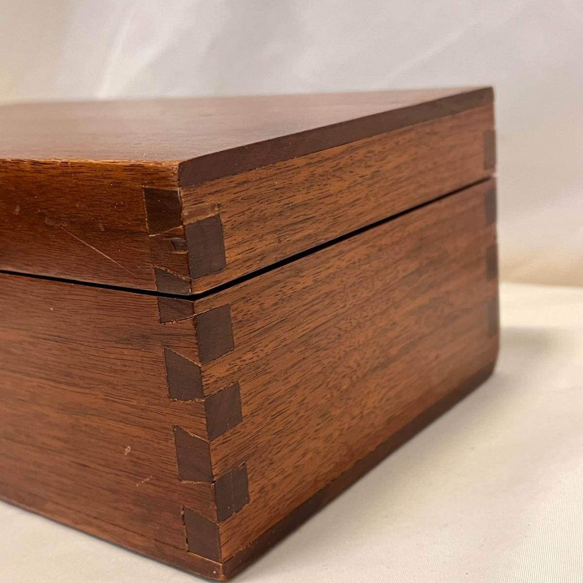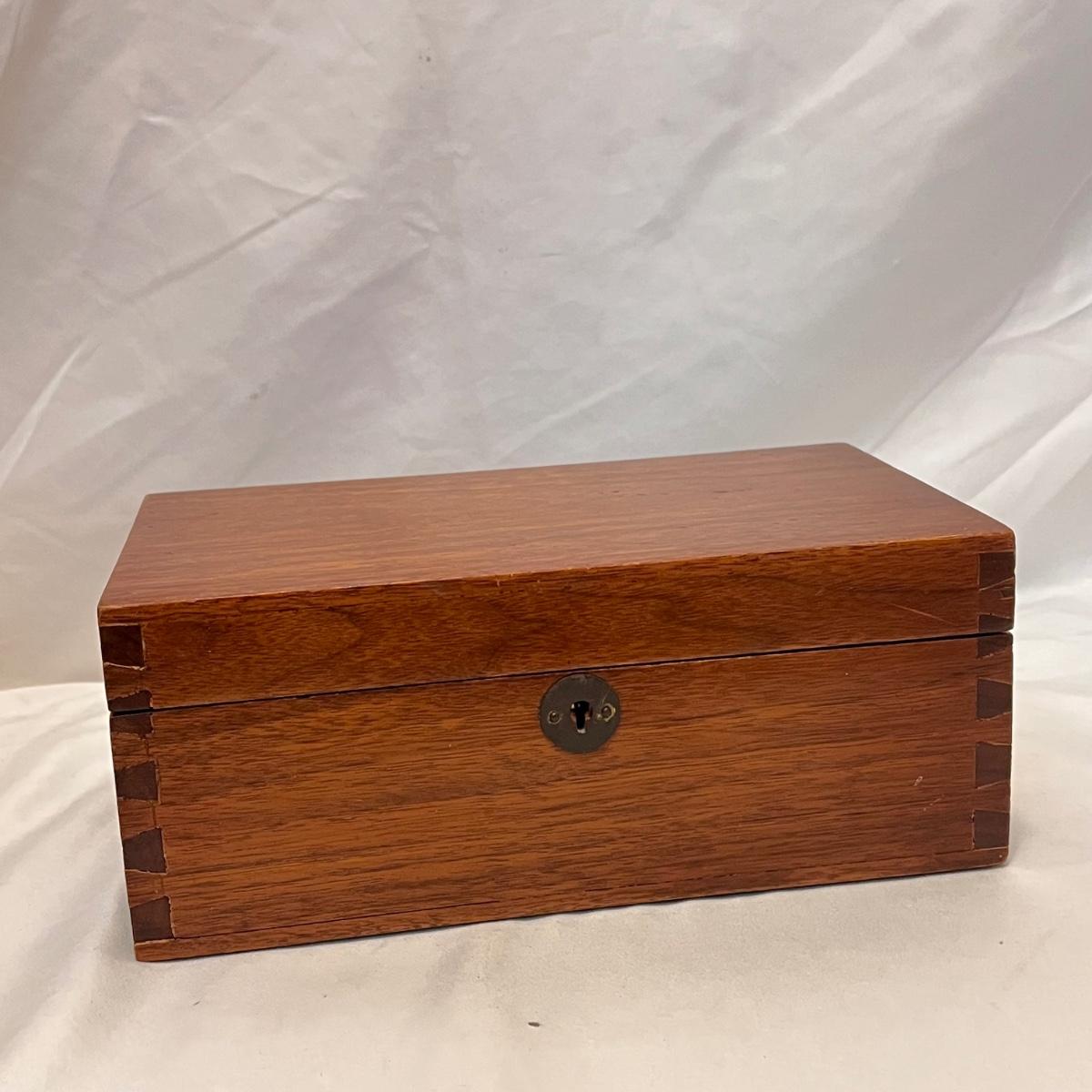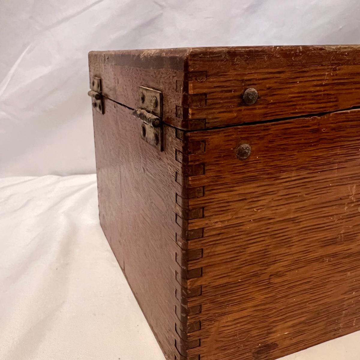 This lot includes five wooden boxes of various sizes. The smallest box measures 8” x 5.5” x 2.5”H and the largest 13” x 6.95” x 5.5”H. The first box individually pictured appears to be a vintage oak index card file/recipe box with dovetailed detail on the sides. The second box with the floral carvings appears to be made in India. The third is just a simple wooden box. The fourth is an old Punch cigar box. Lastly, the fifth appears to be mahogany box with dovetailed detail on the side. The box is lined with green felt and has a spot for a key on the front - no key included. Shipping available.