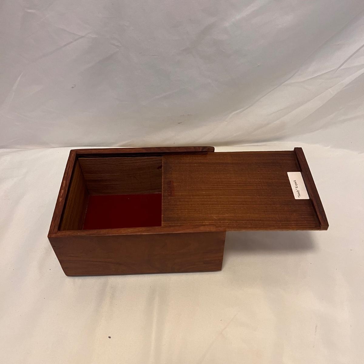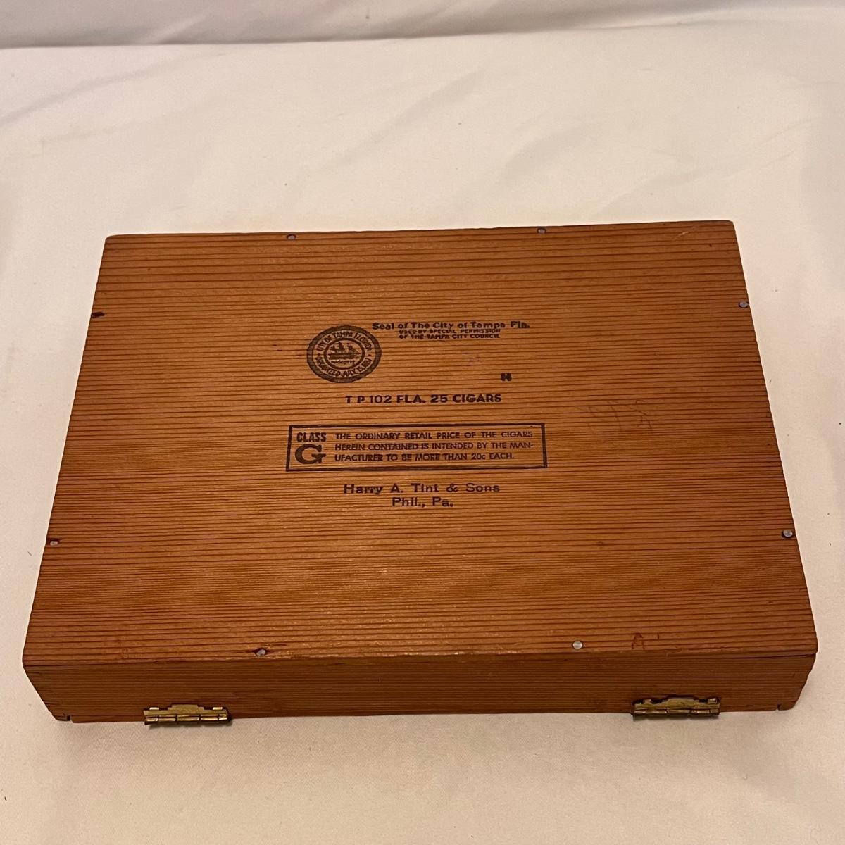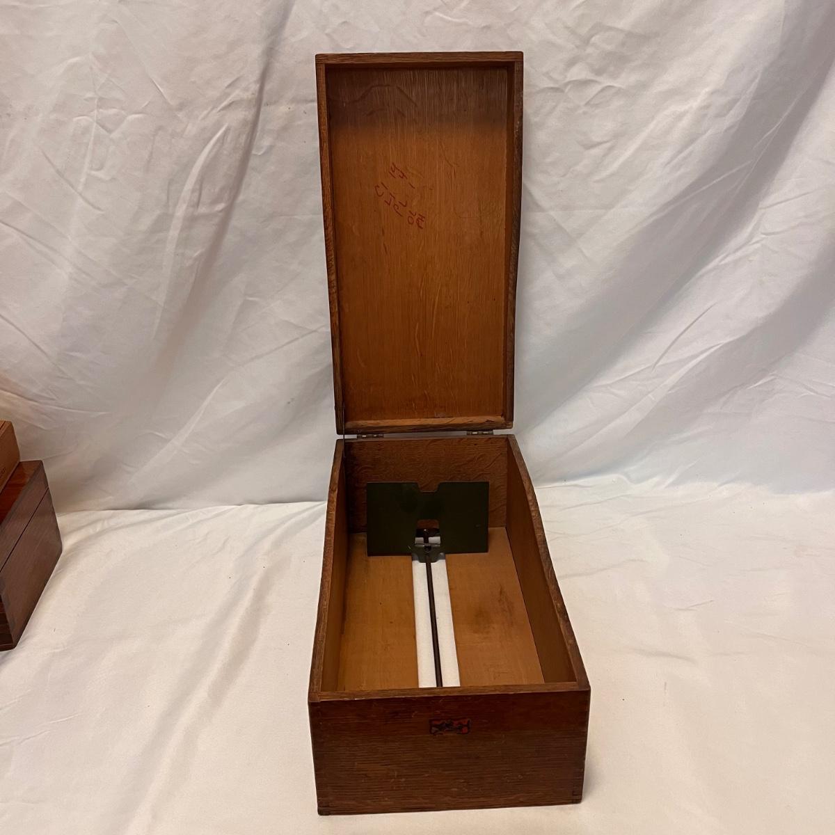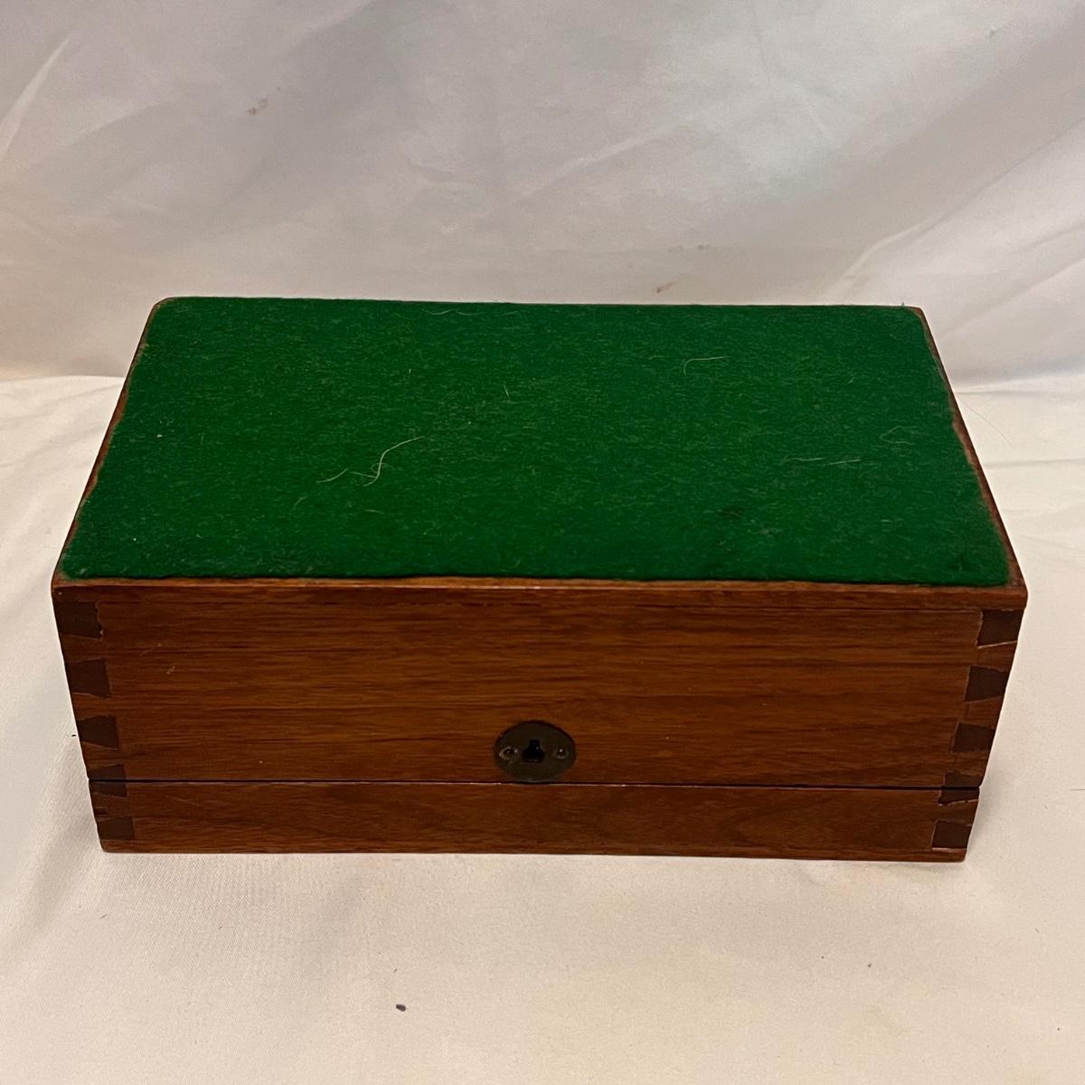 This lot includes five wooden boxes of various sizes. The smallest box measures 8” x 5.5” x 2.5”H and the largest 13” x 6.95” x 5.5”H. The first box individually pictured appears to be a vintage oak index card file/recipe box with dovetailed detail on the sides. The second box with the floral carvings appears to be made in India. The third is just a simple wooden box. The fourth is an old Punch cigar box. Lastly, the fifth appears to be mahogany box with dovetailed detail on the side. The box is lined with green felt and has a spot for a key on the front - no key included. Shipping available.