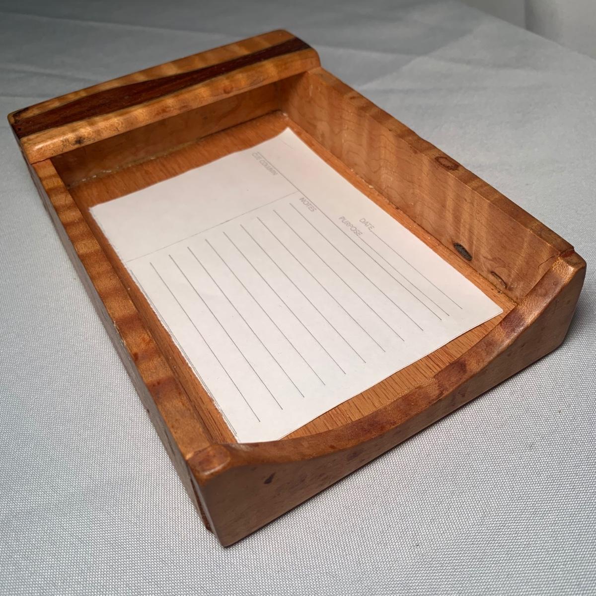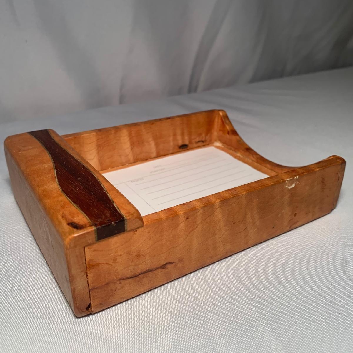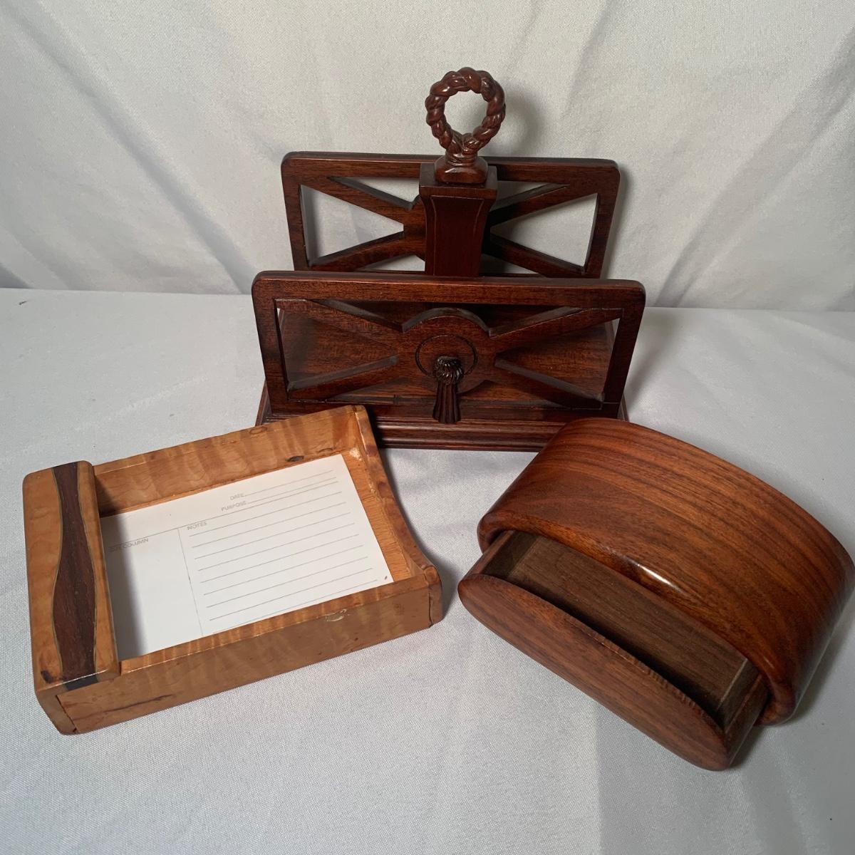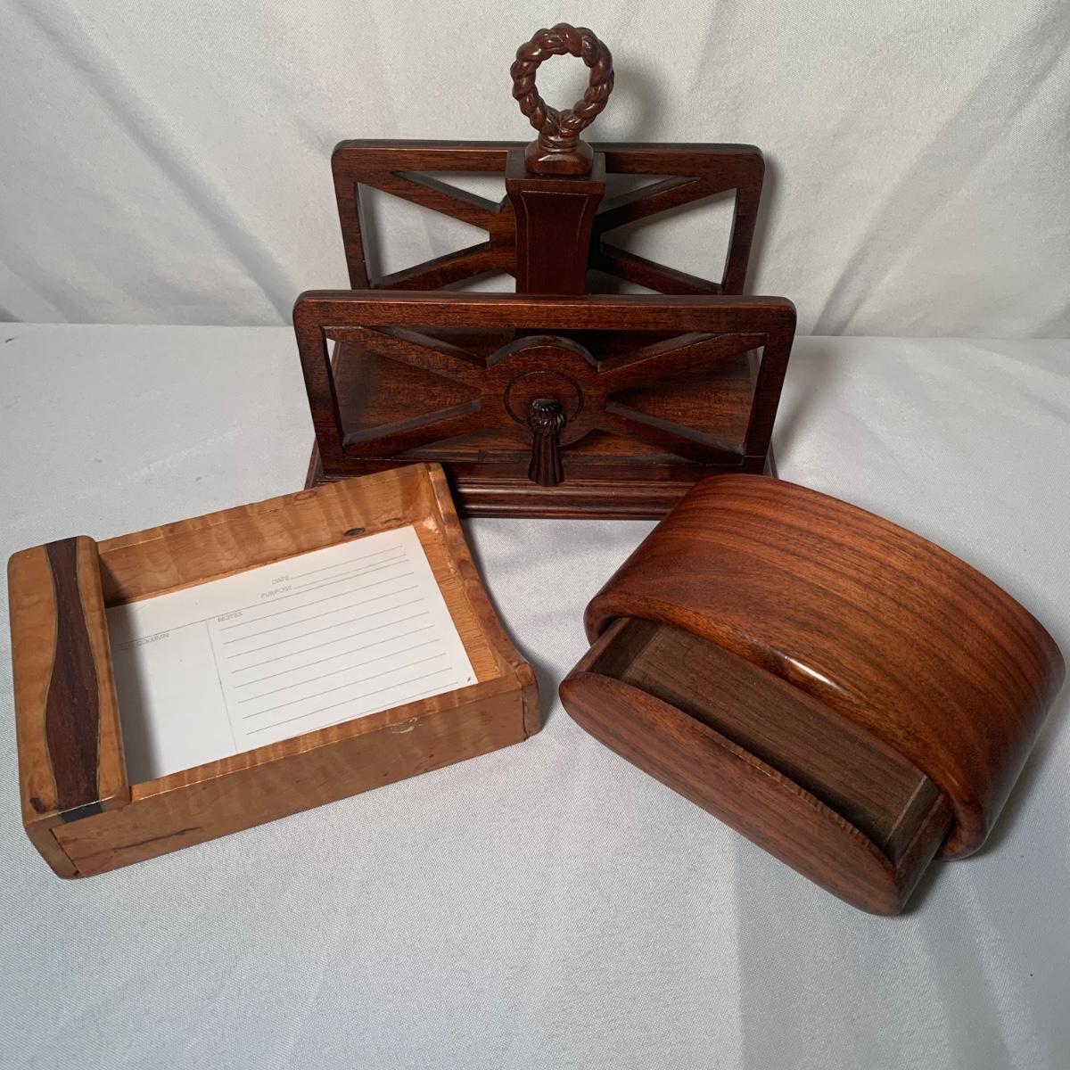 Lot includes three wooden desk organizers. Mail holder/letter opener combo, wooden message holder and small box with removable drawer. The letter opener holder is a bit loose and could use a little wood glue. Otherwise all items are in good condition. Mail holder/letter opener measures, 8.25”W x 5.5”W x 7”H.