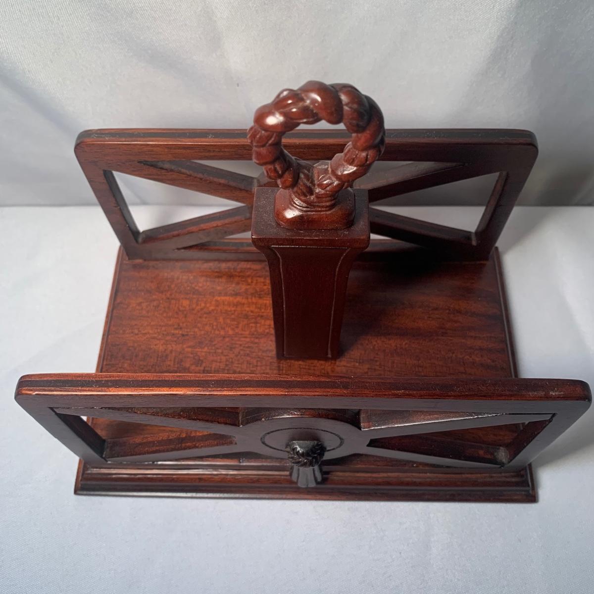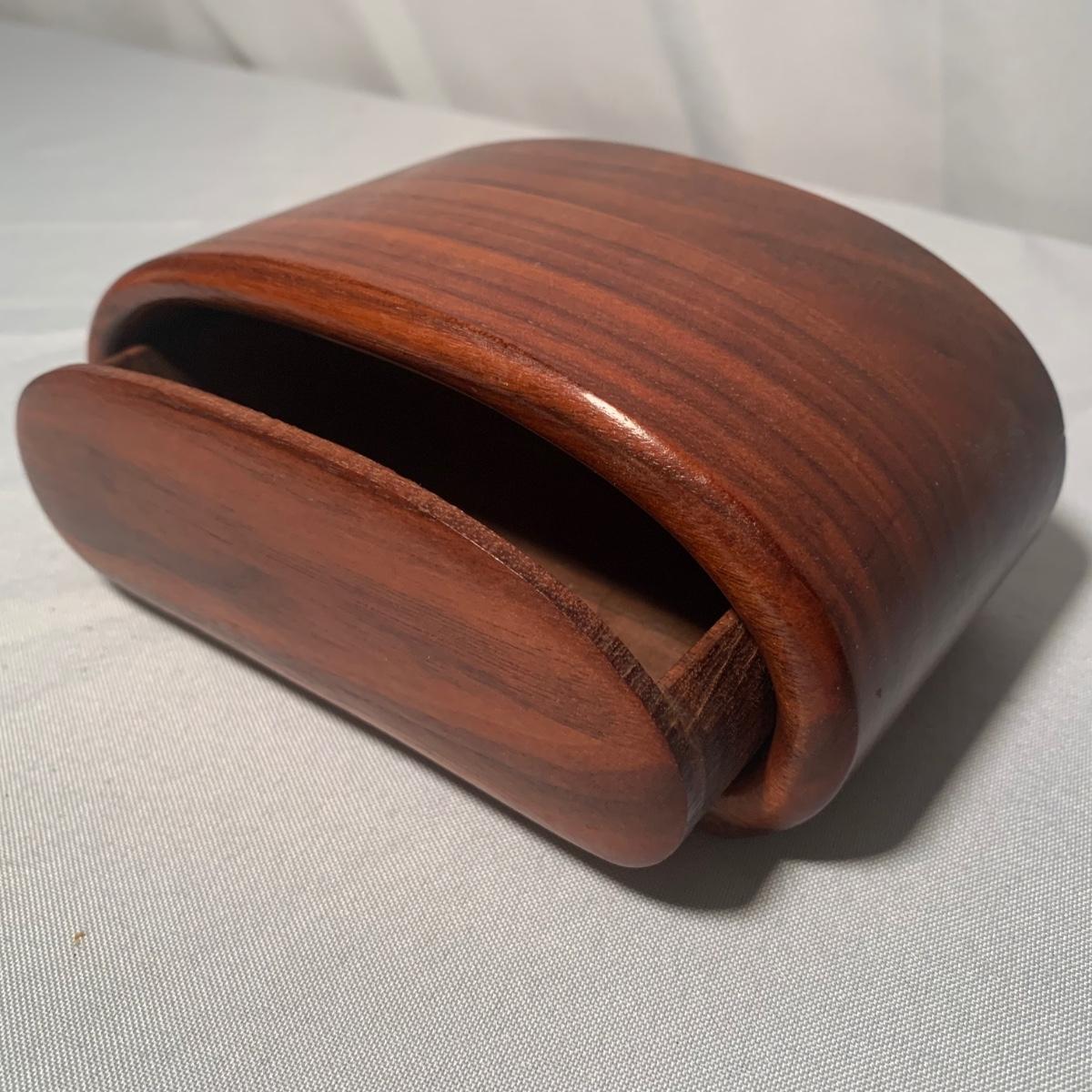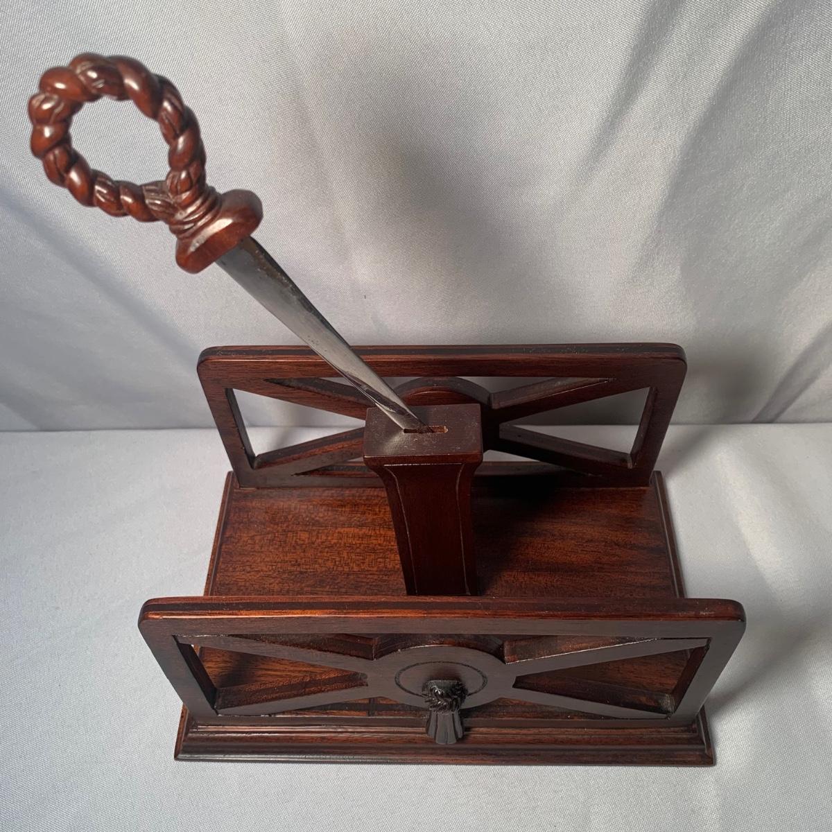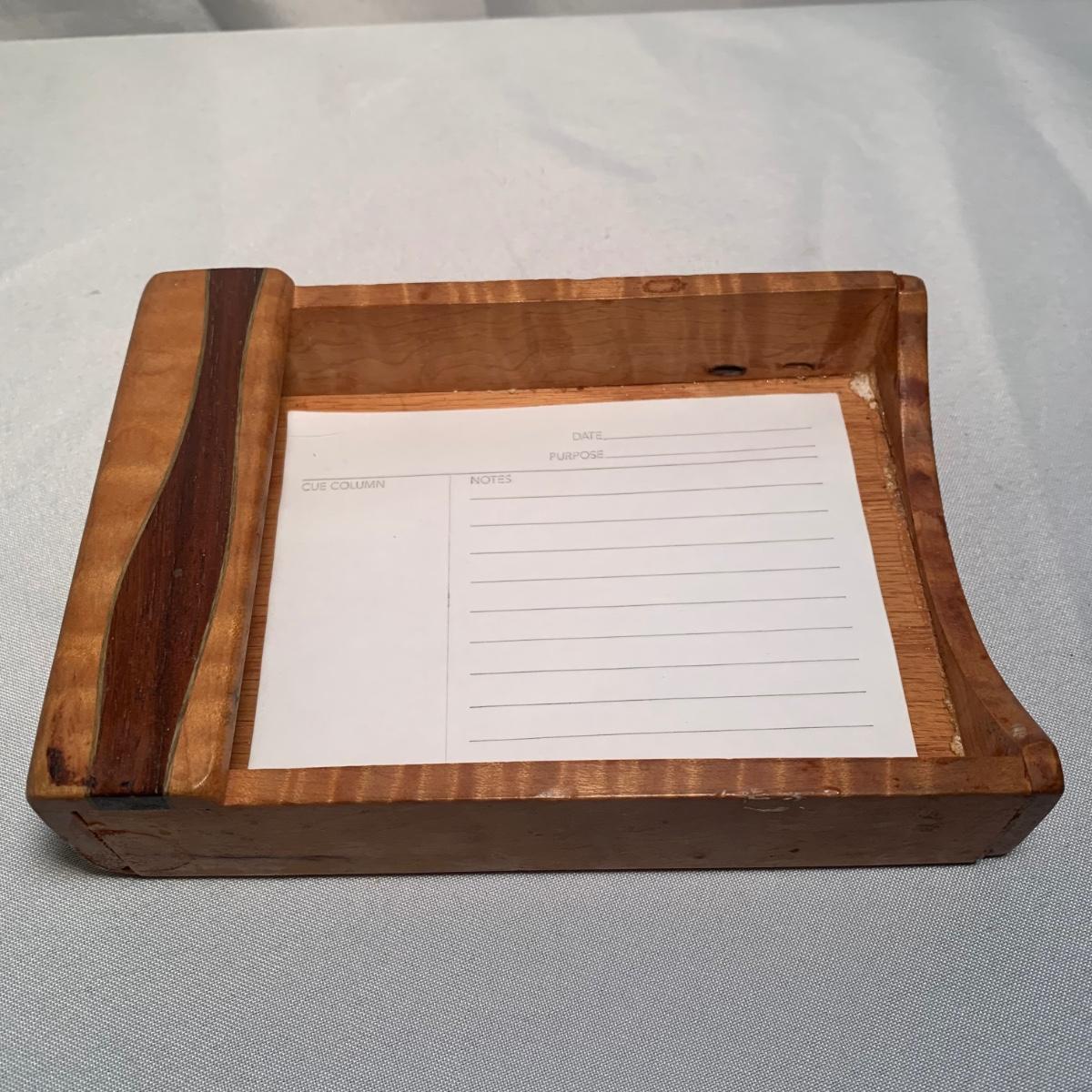 Lot includes three wooden desk organizers. Mail holder/letter opener combo, wooden message holder and small box with removable drawer. The letter opener holder is a bit loose and could use a little wood glue. Otherwise all items are in good condition. Mail holder/letter opener measures, 8.25”W x 5.5”W x 7”H.