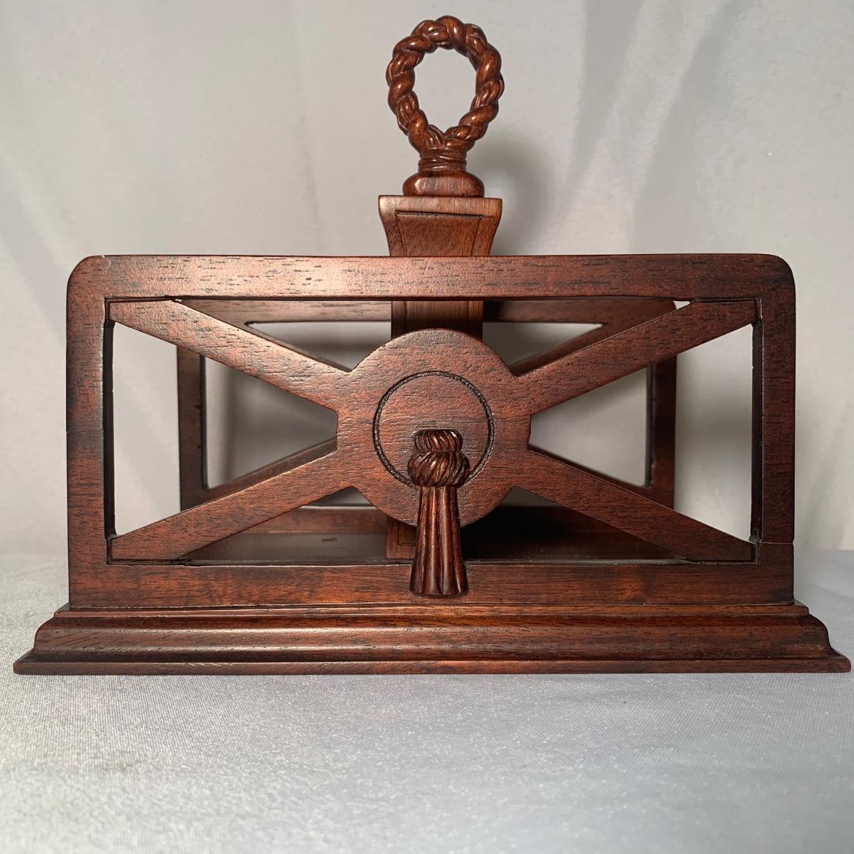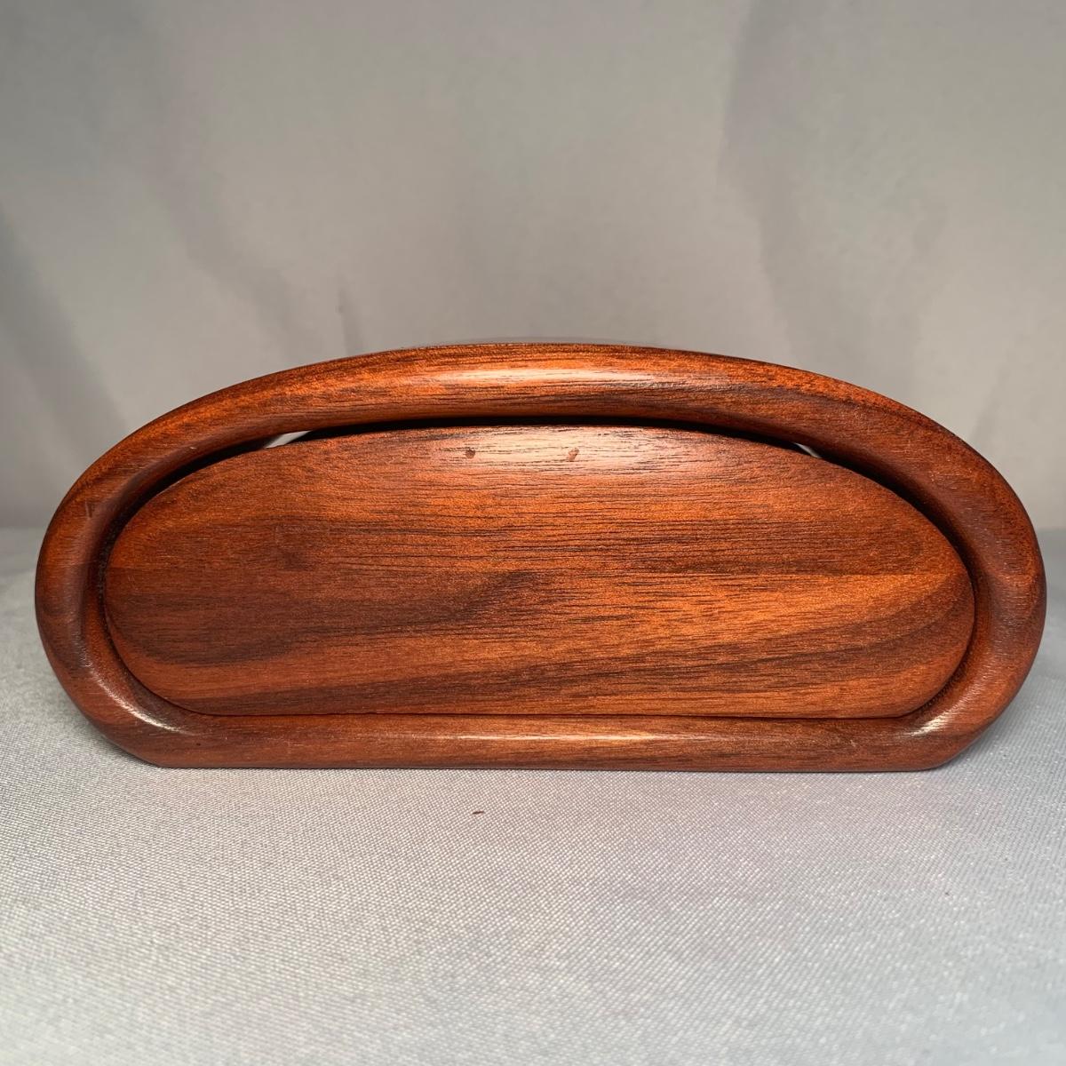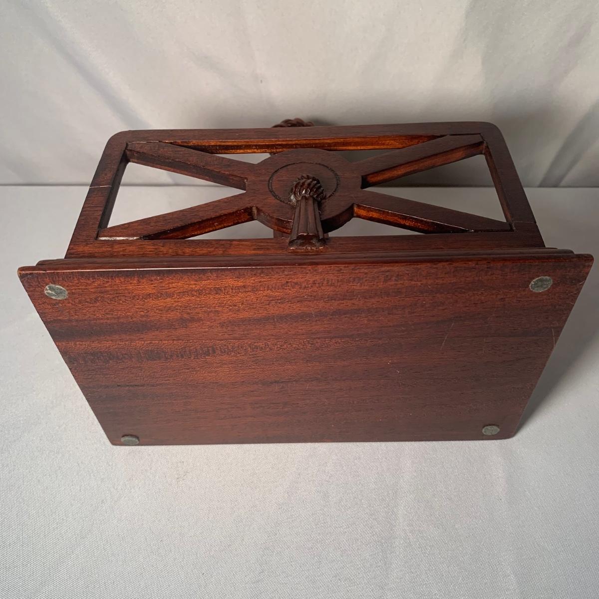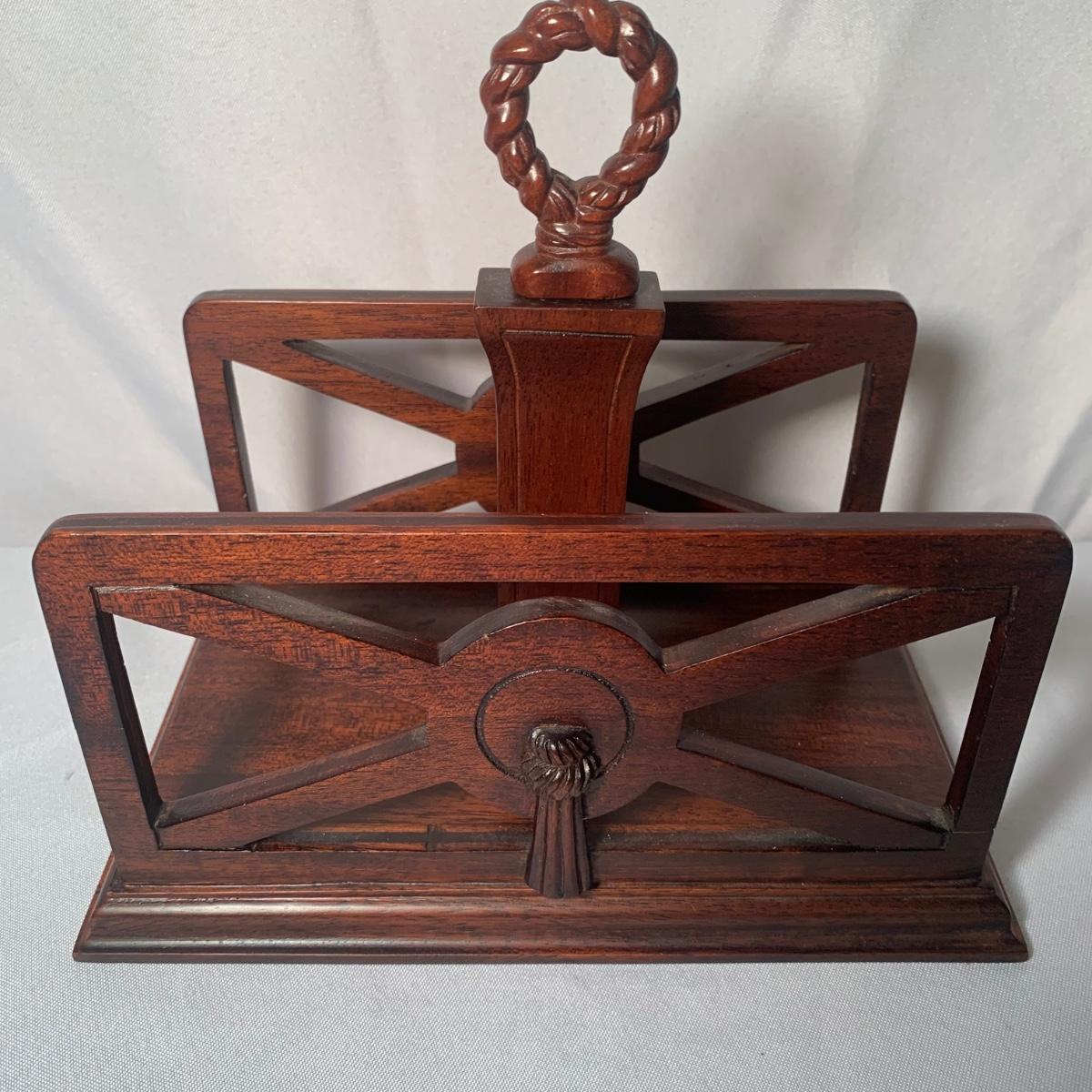 Lot includes three wooden desk organizers. Mail holder/letter opener combo, wooden message holder and small box with removable drawer. The letter opener holder is a bit loose and could use a little wood glue. Otherwise all items are in good condition. Mail holder/letter opener measures, 8.25”W x 5.5”W x 7”H.