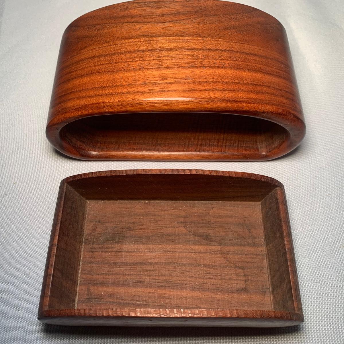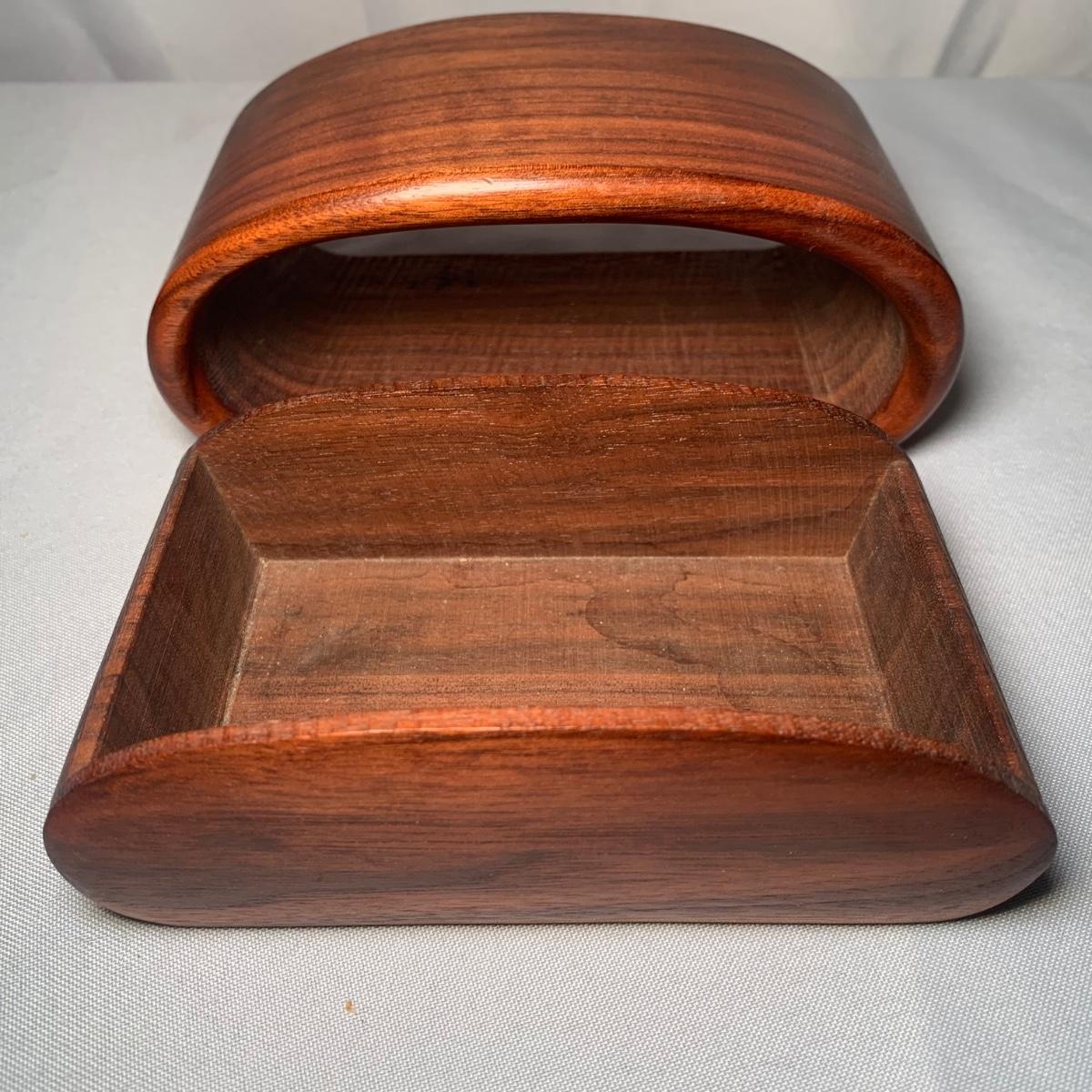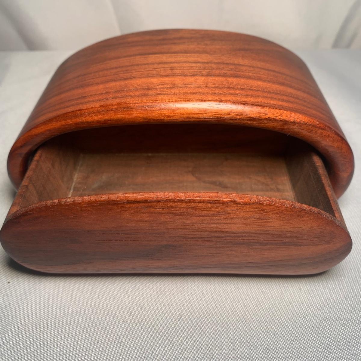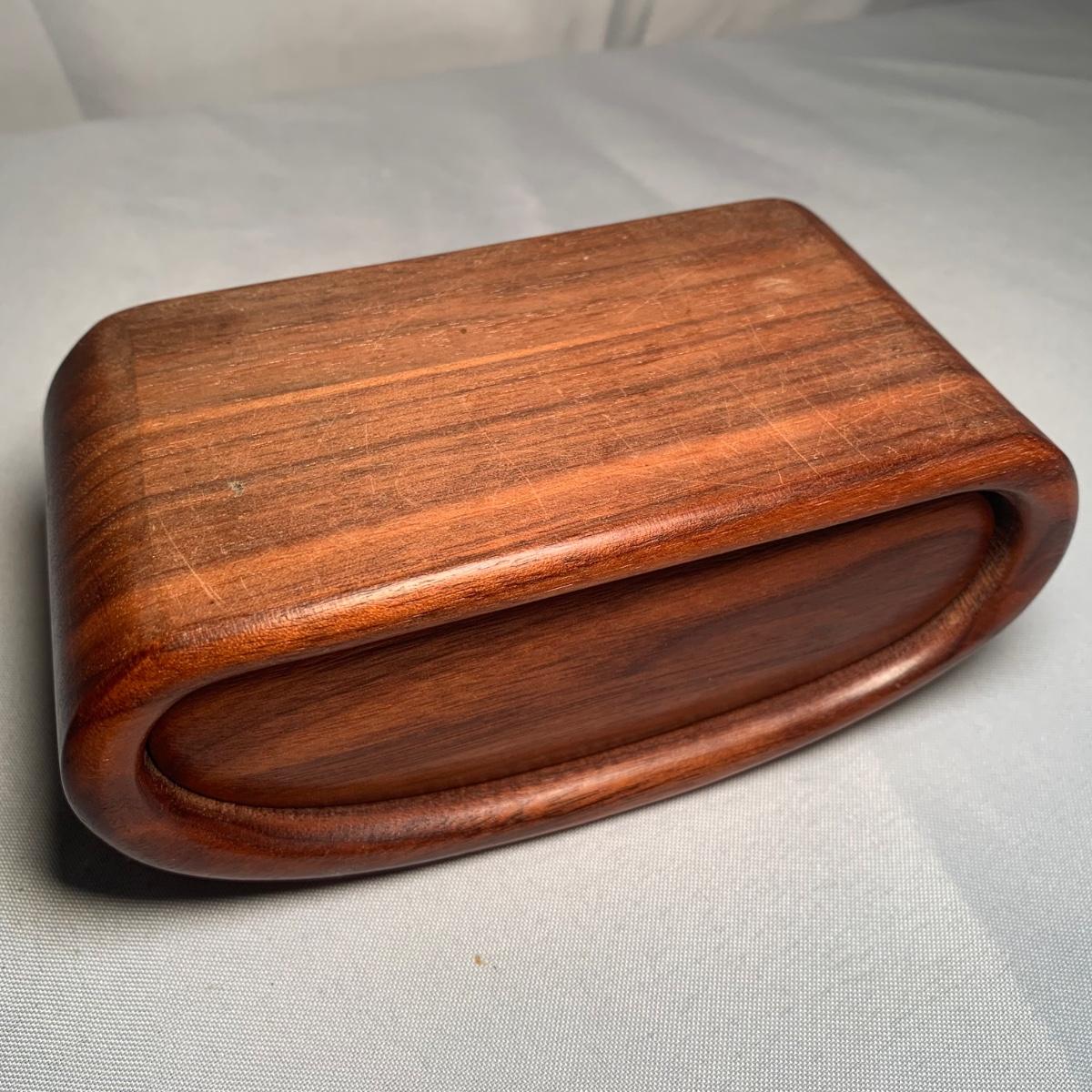Lot includes three wooden desk organizers. Mail holder/letter opener combo, wooden message holder and small box with removable drawer. The letter opener holder is a bit loose and could use a little wood glue. Otherwise all items are in good condition. Mail holder/letter opener measures, 8.25”W x 5.5”W x 7”H.