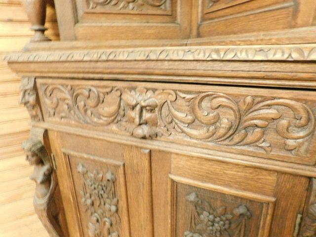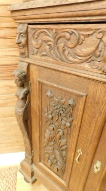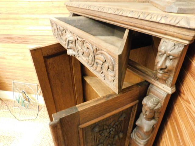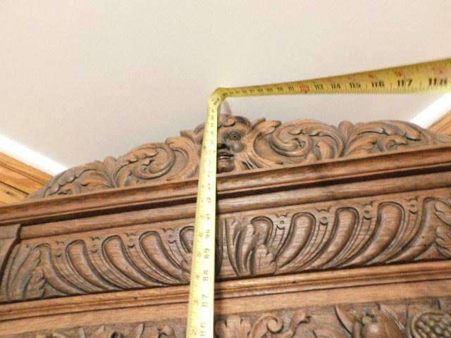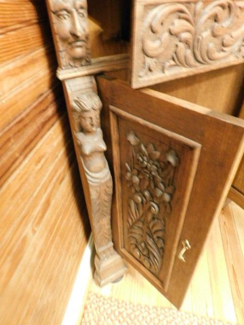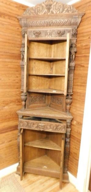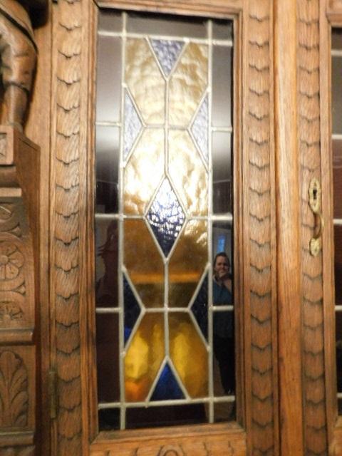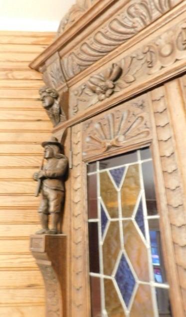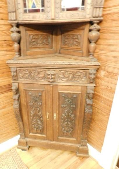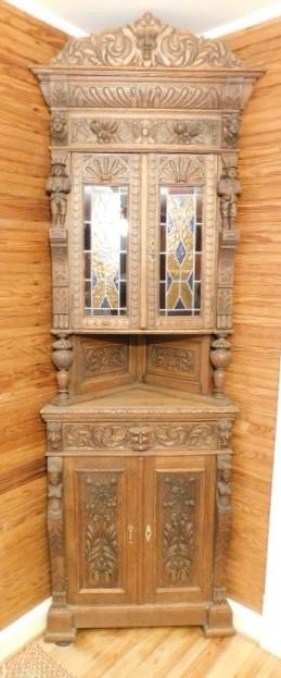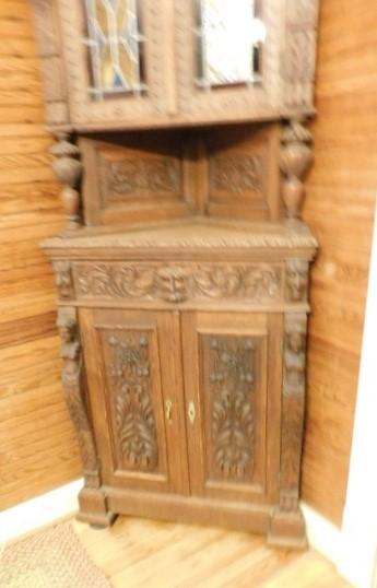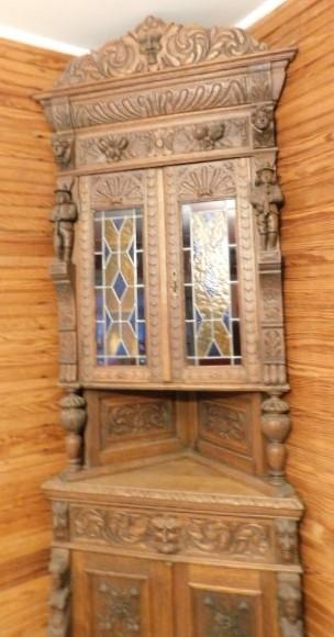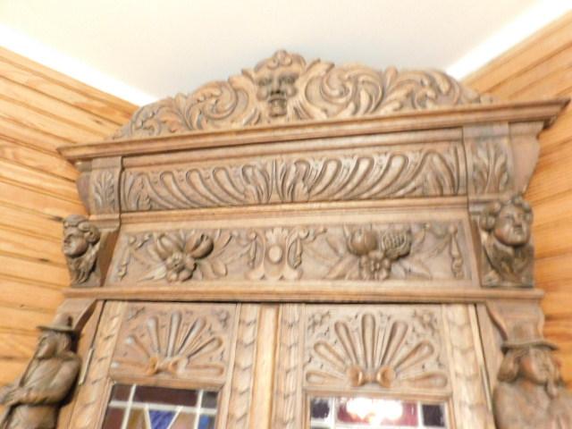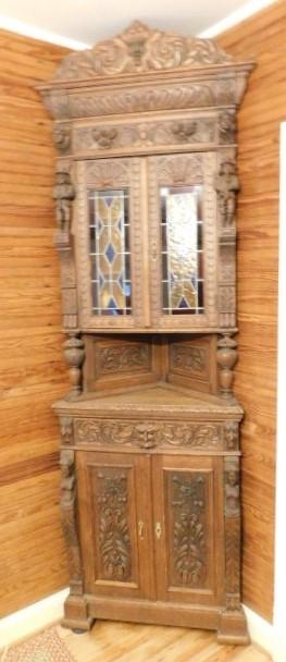 Rare! Antique European Hand Carved Corner Cupboard with Stained Glass Panels 32"x14"x102" Pictures can not do this piece justice. Hand carved figures and detailing are amazing. You have to see this with you own eyes. .