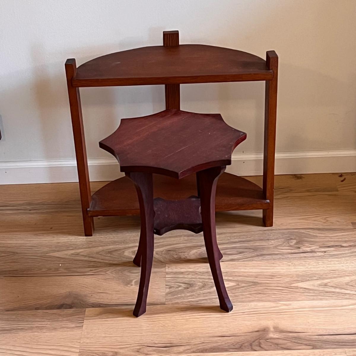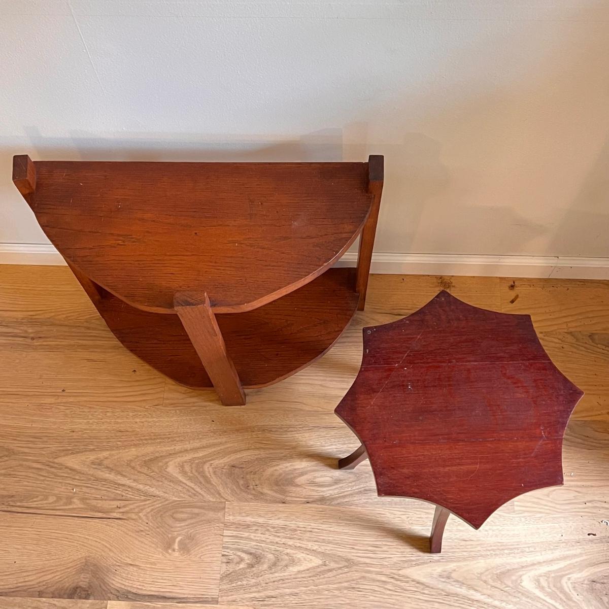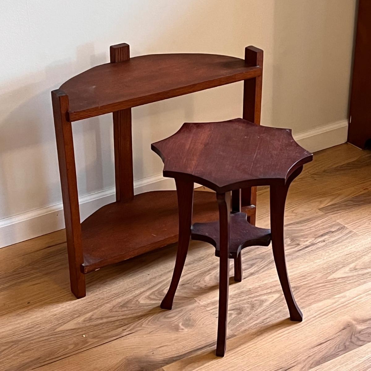 This lot includes two small accent tables. The demilune table measures 23” x 22”H and octagonal star-shaped side table measures 14” x 18”H. Both pieces are solid wood and are very light. Local pickup only.