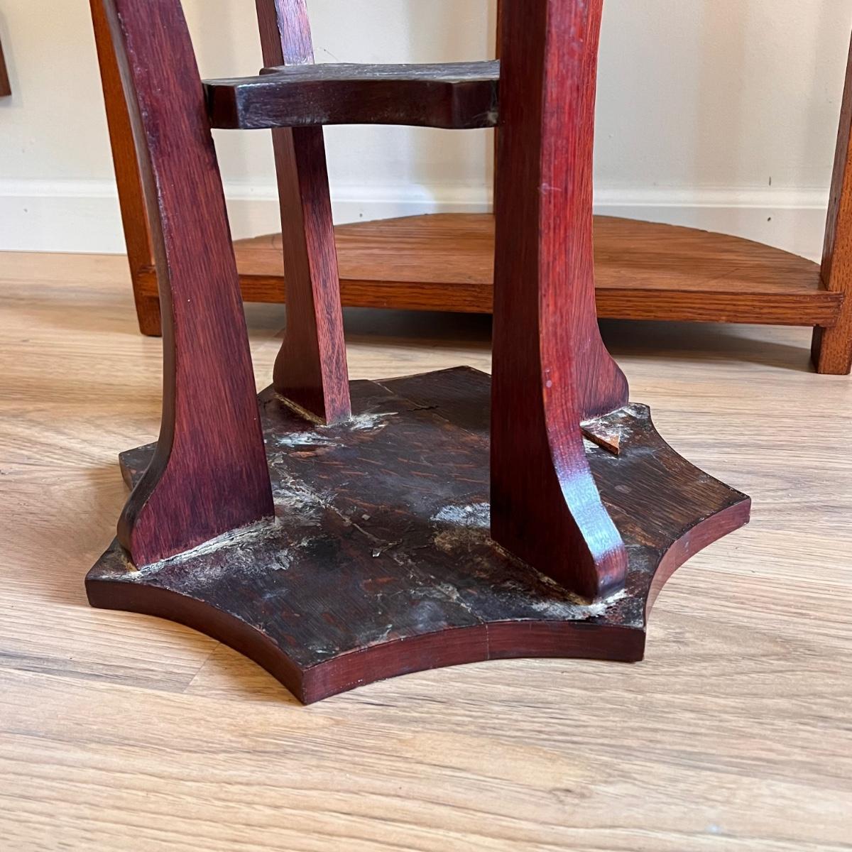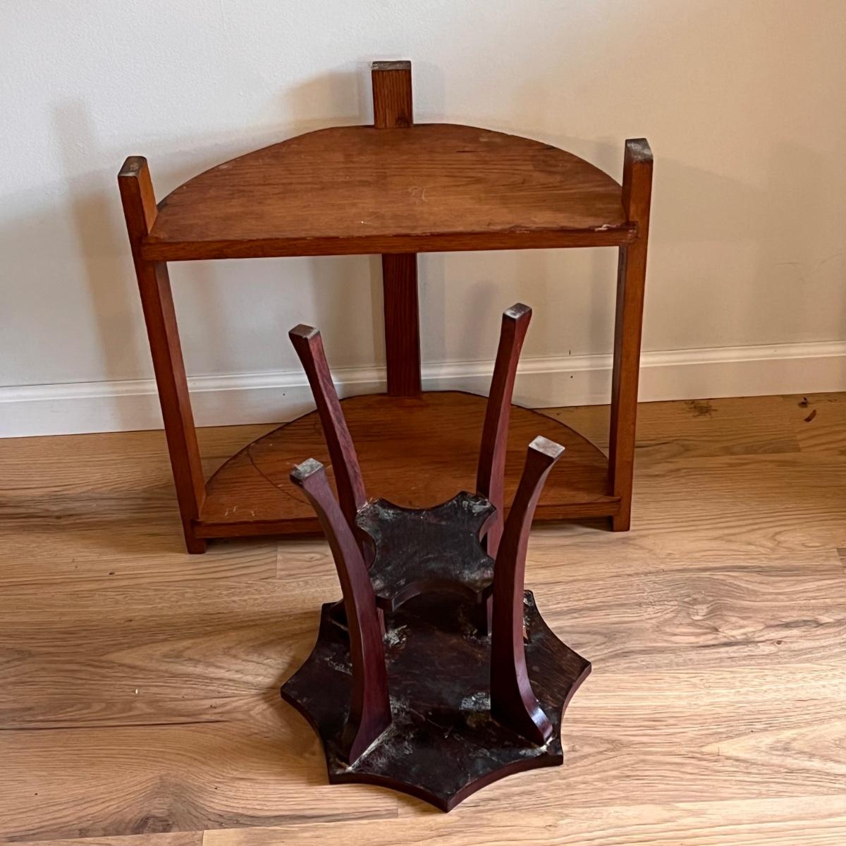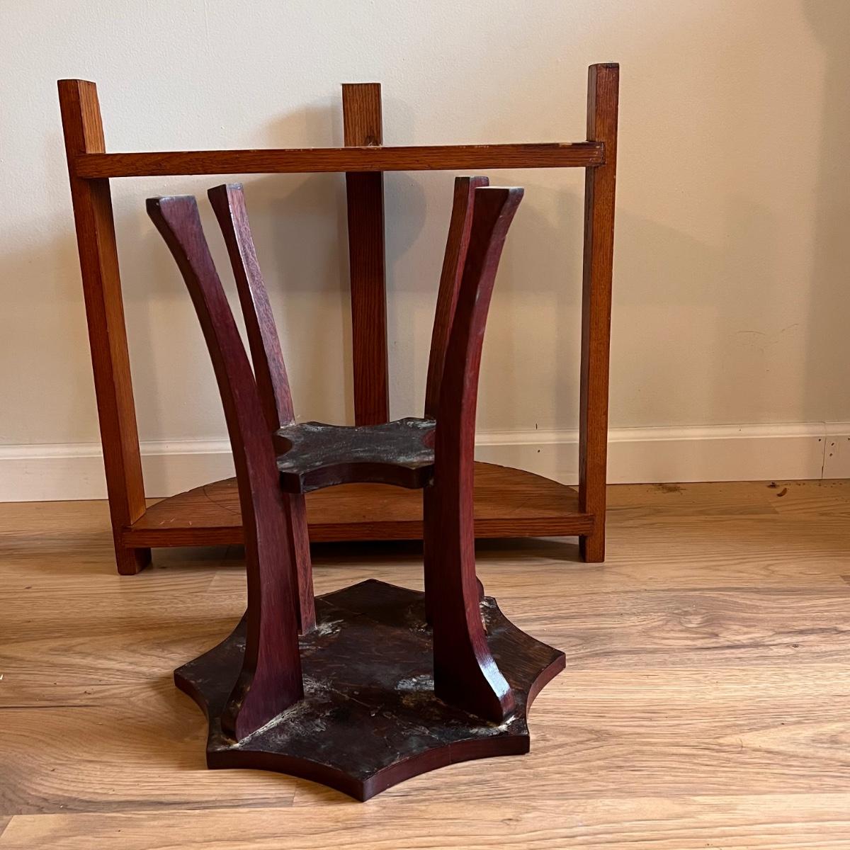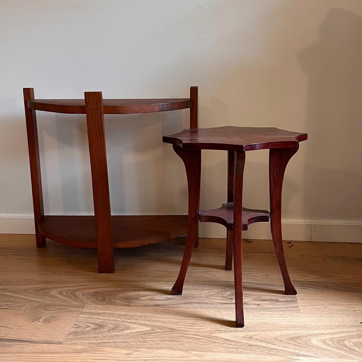 This lot includes two small accent tables. The demilune table measures 23” x 22”H and octagonal star-shaped side table measures 14” x 18”H. Both pieces are solid wood and are very light. Local pickup only.