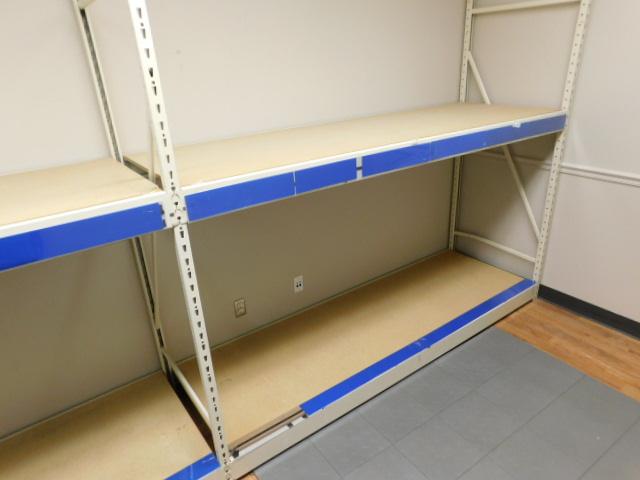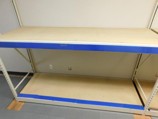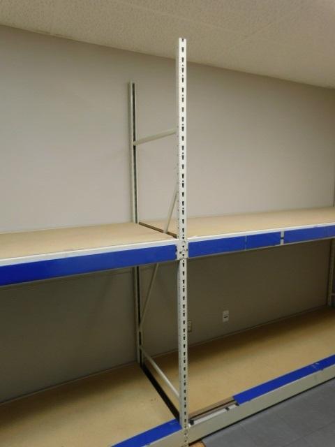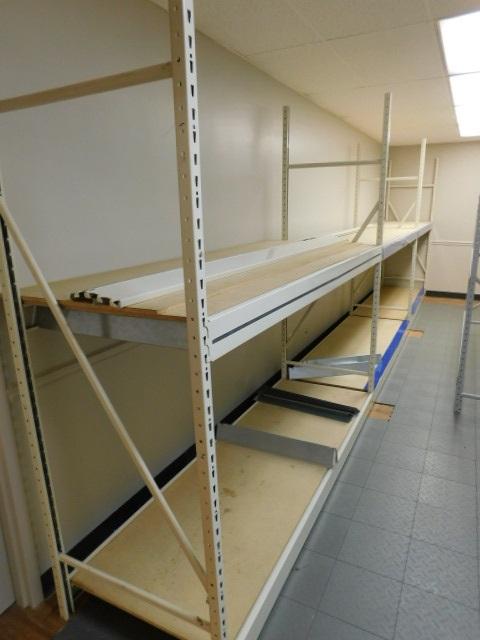 Unit #1: Three Section Commercial Pallet Racking Double Shelf 24'x8'. Very good condition and clean. Expect some stains or scratches to wood shelving pieces.