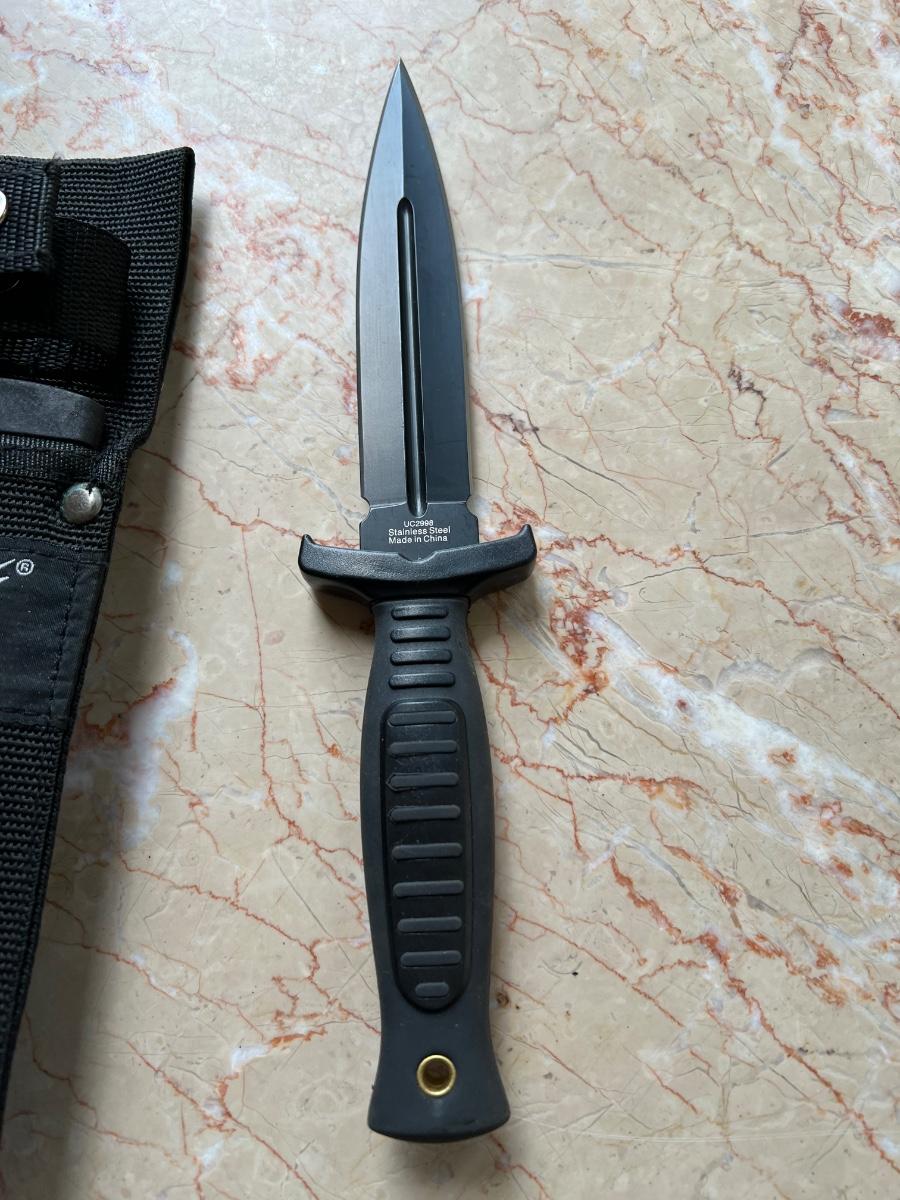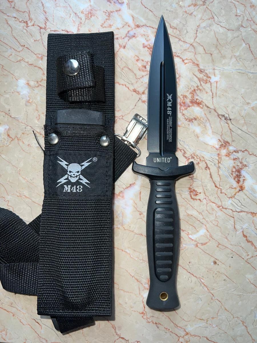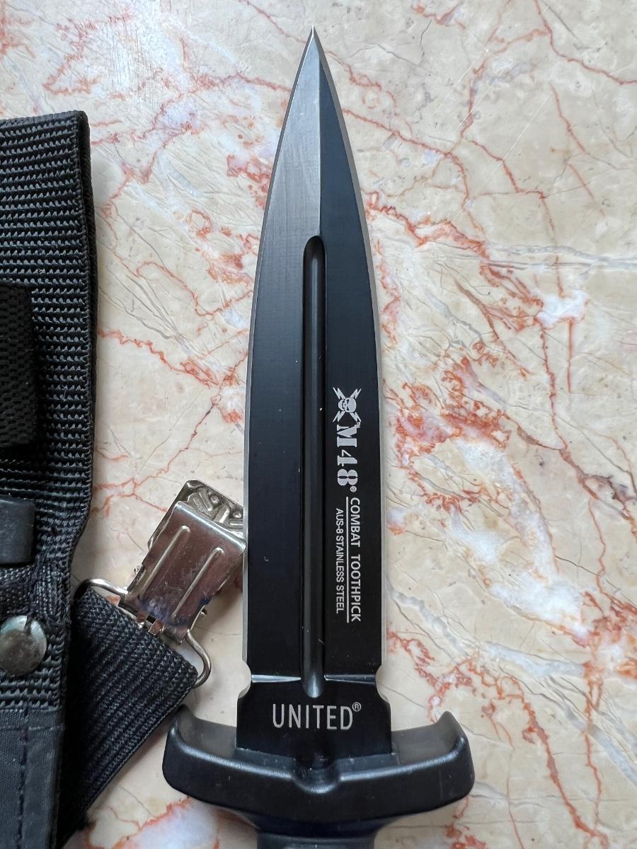 United XM 48 stainless steel combat toothpick knife with sheath & strap. Approx 9-1/2”. Near mint condition.