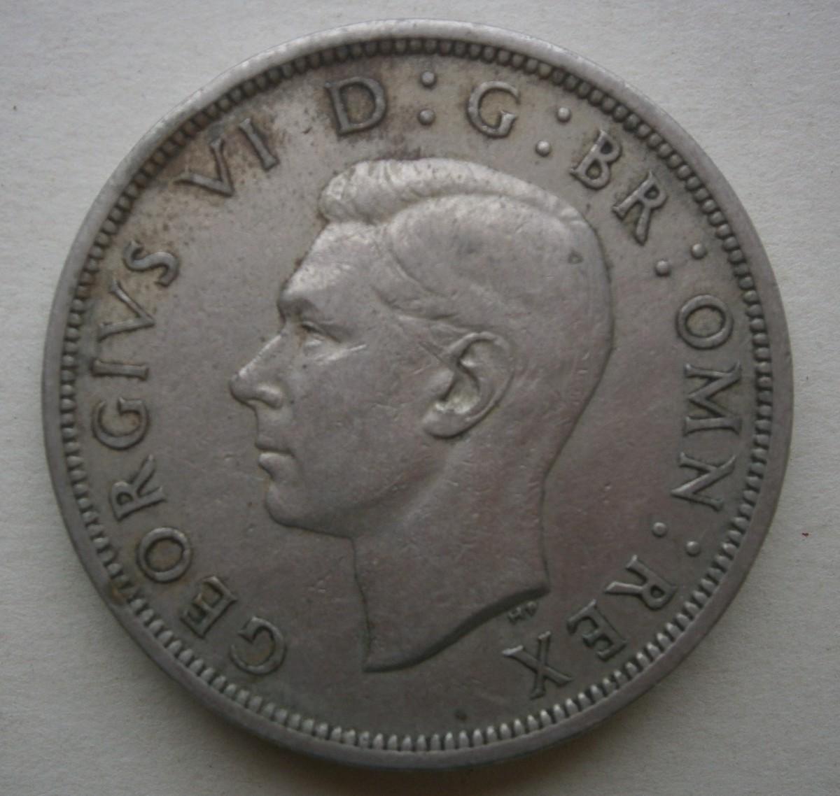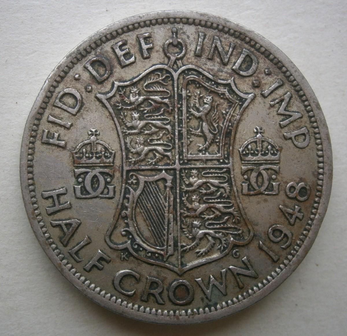United Kingdom 1948 Half Crown Silver Coin, circulated, 32 mm diameter, weighs 14.1 grams.