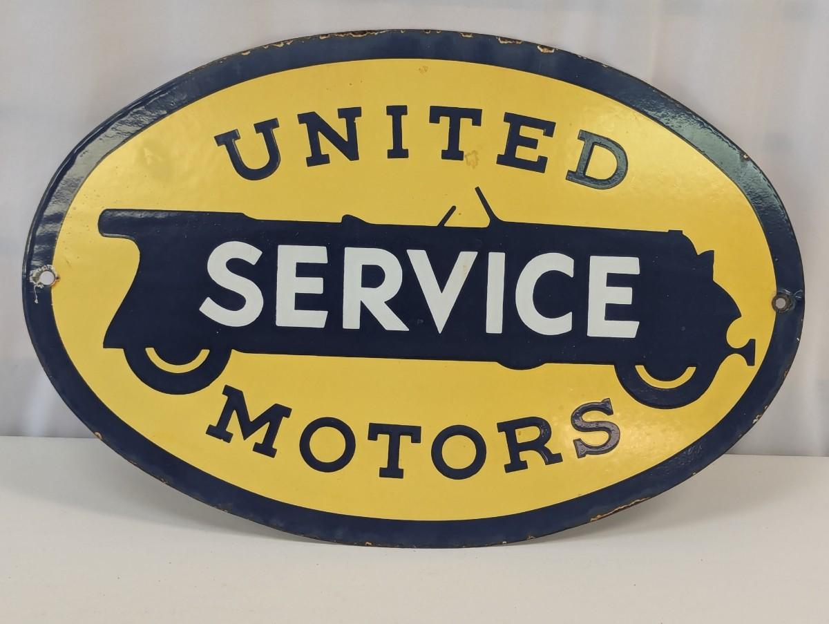 United Motors Service Porcelain Arrow Sign Approx 16 3/4" x 11"