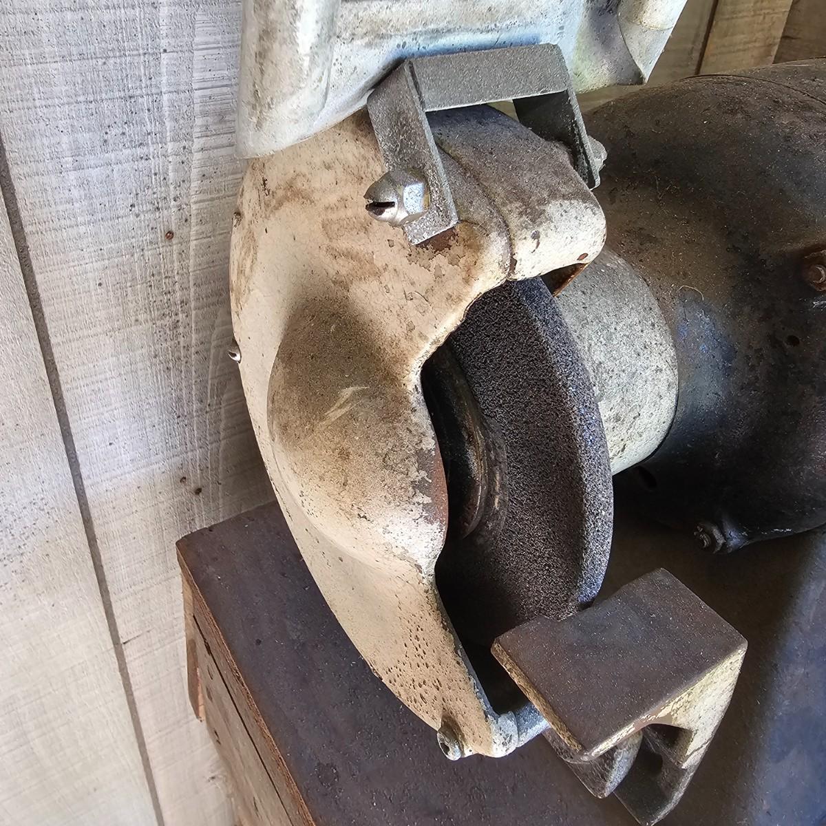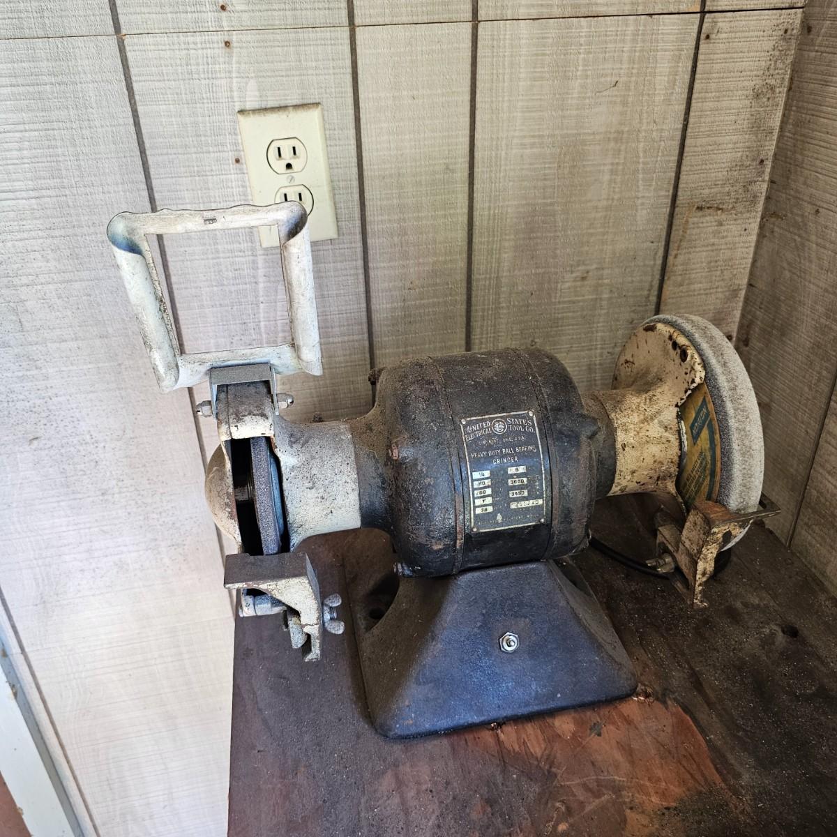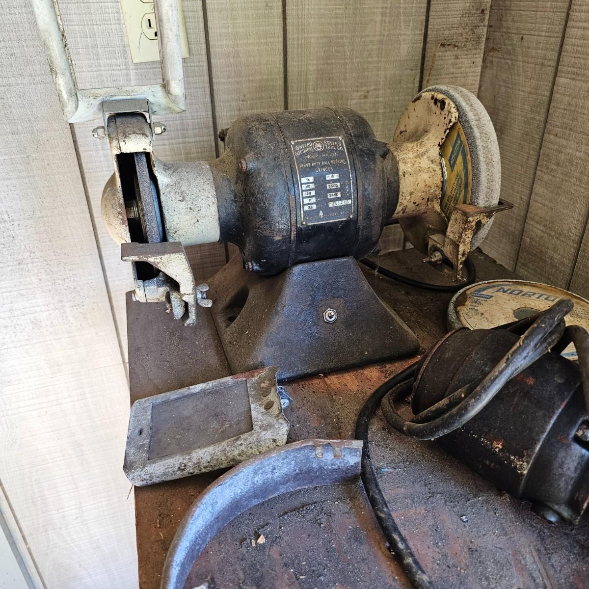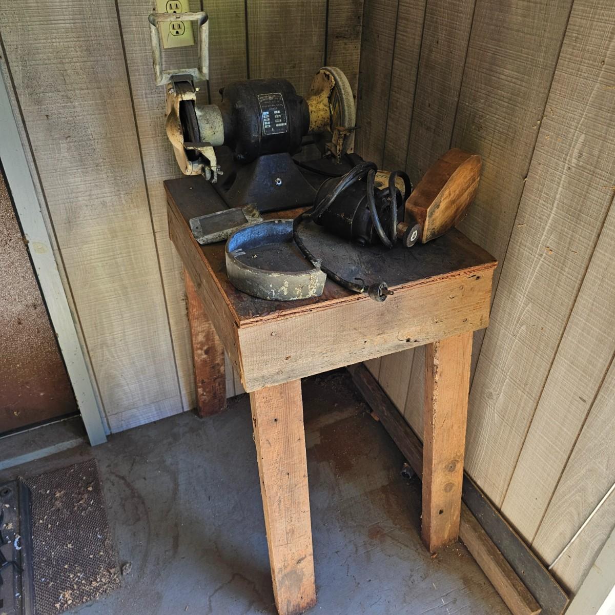 Older style 6" heavy duty double ended grinder, mounted on wood stand. Unit has shield, tool rest and cover on left side, cover and shield included but not attached on right side. 1/4hp motor powered on when plugged in. Also includes a small grinding unit mounted on a wood holder, and one extra 6" wheel for main grinder. Large unit measures 20" x 28" x 48"H. See photos for details. Local pickup only. Winning bidder must bring assistance to help move and load this item due to its weight and/or size. This lot is located in the shed. There is a step down to ground level. Will need to walk items through the yard. There is no driveway access to this location.