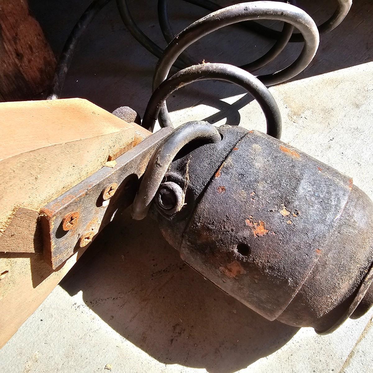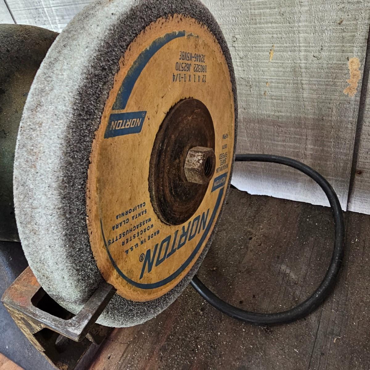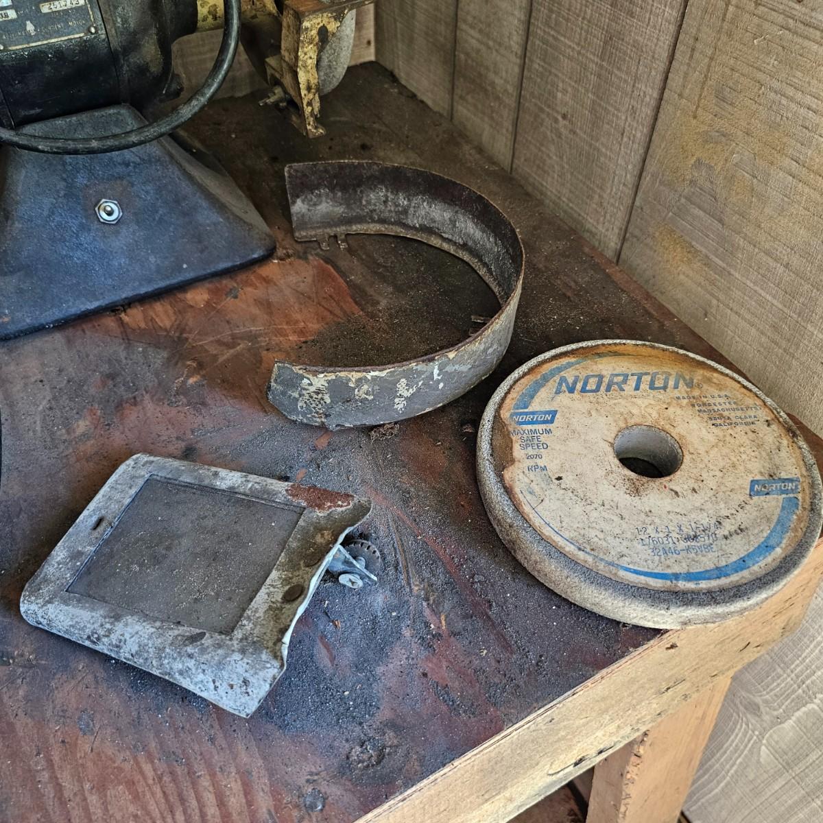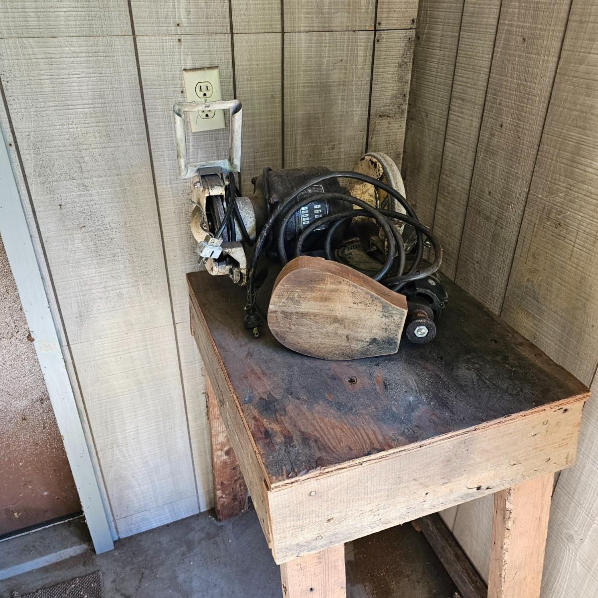 Older style 6" heavy duty double ended grinder, mounted on wood stand. Unit has shield, tool rest and cover on left side, cover and shield included but not attached on right side. 1/4hp motor powered on when plugged in. Also includes a small grinding unit mounted on a wood holder, and one extra 6" wheel for main grinder. Large unit measures 20" x 28" x 48"H. See photos for details. Local pickup only. Winning bidder must bring assistance to help move and load this item due to its weight and/or size. This lot is located in the shed. There is a step down to ground level. Will need to walk items through the yard. There is no driveway access to this location.