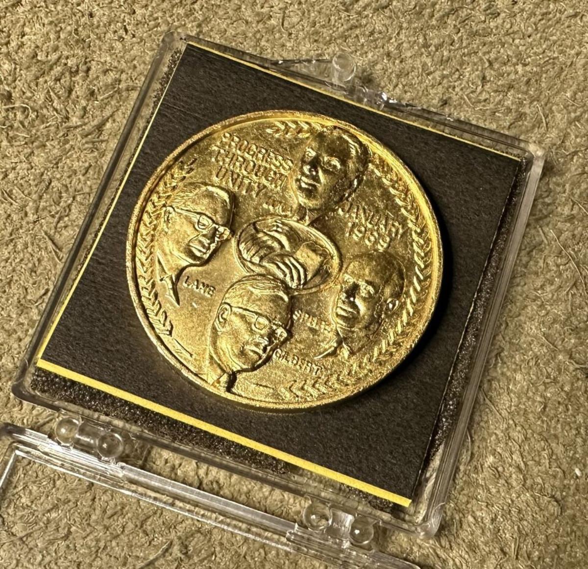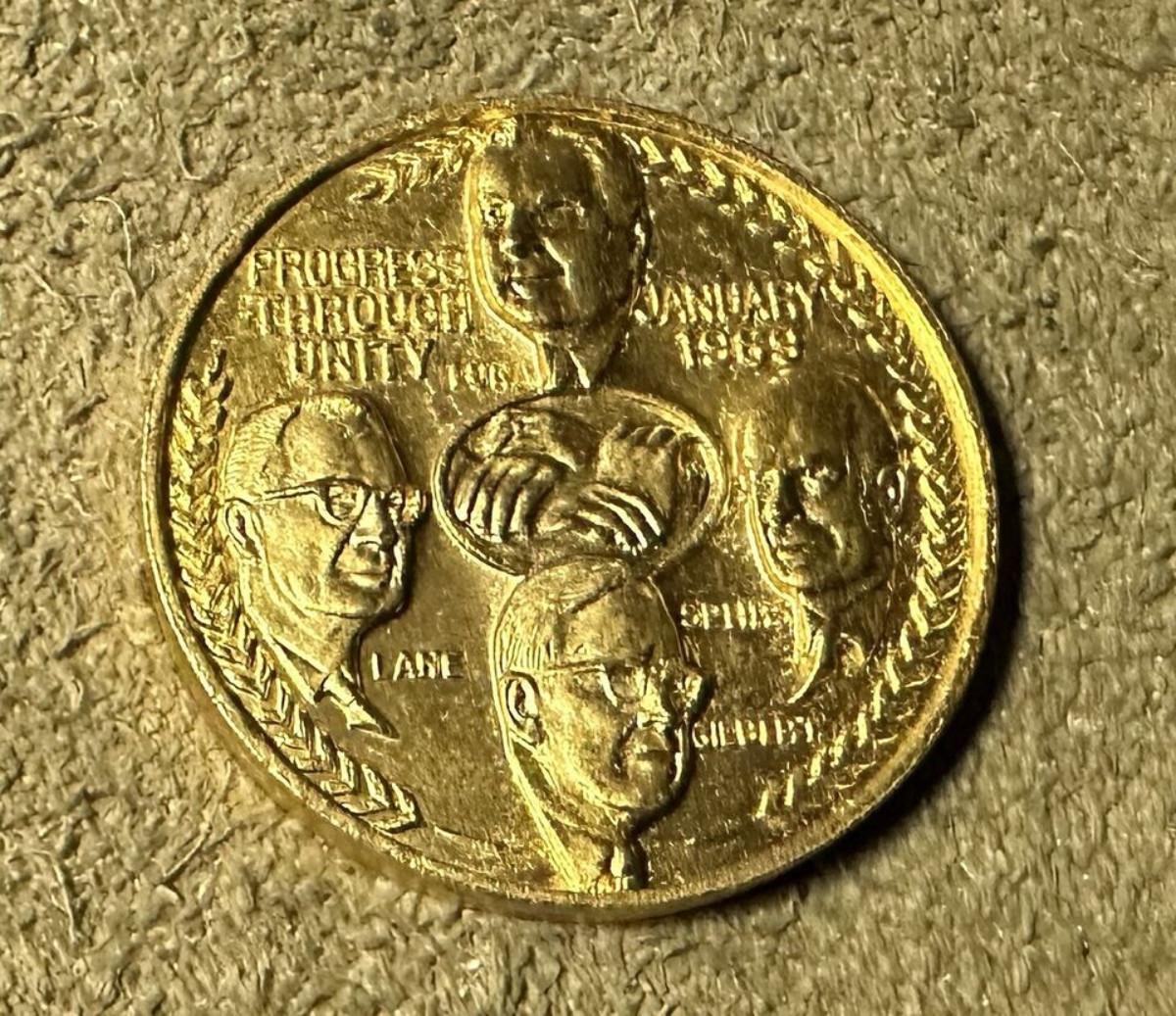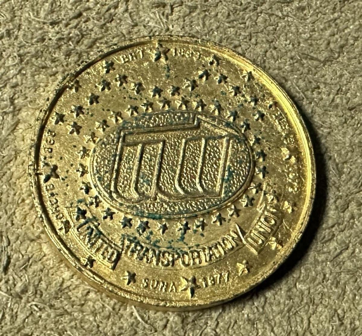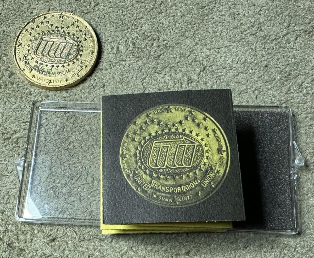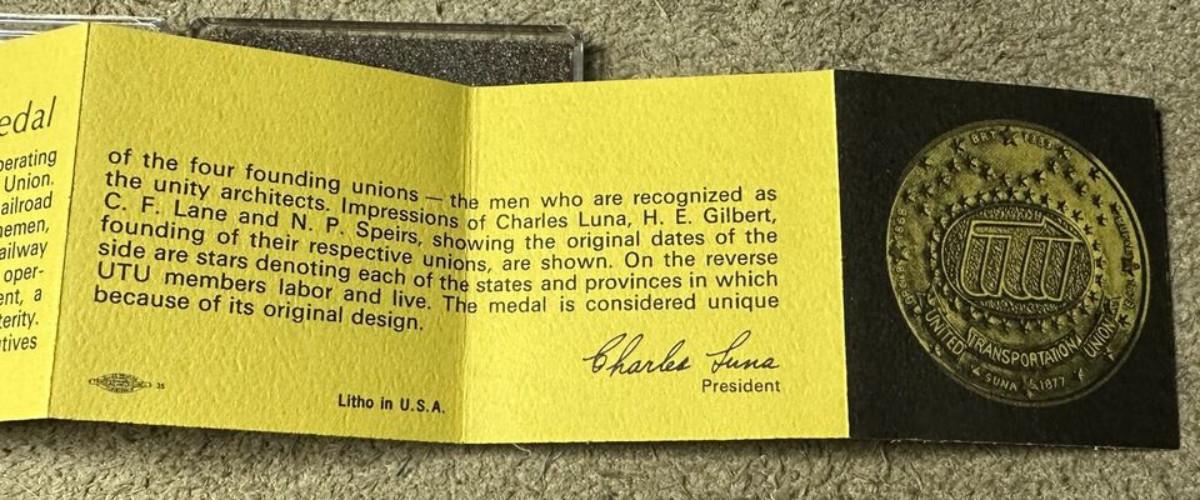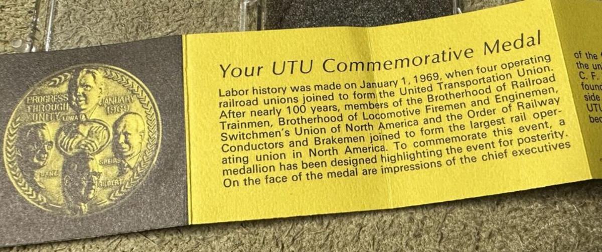 UTU Commemorative Medal from 1969..Four operating railroad unions joined to form the United Transportation Union...a broad-based labor union that represented about 70,000 active and retired railroad, bus, mass transit and airline workers in the United States...Merged into the International Association of Sheet Metal, Air, Rail and Transportation Workers (SMART) in 2014..Some verdigris on reverse side with age..41mm..