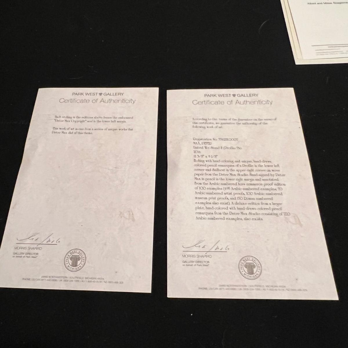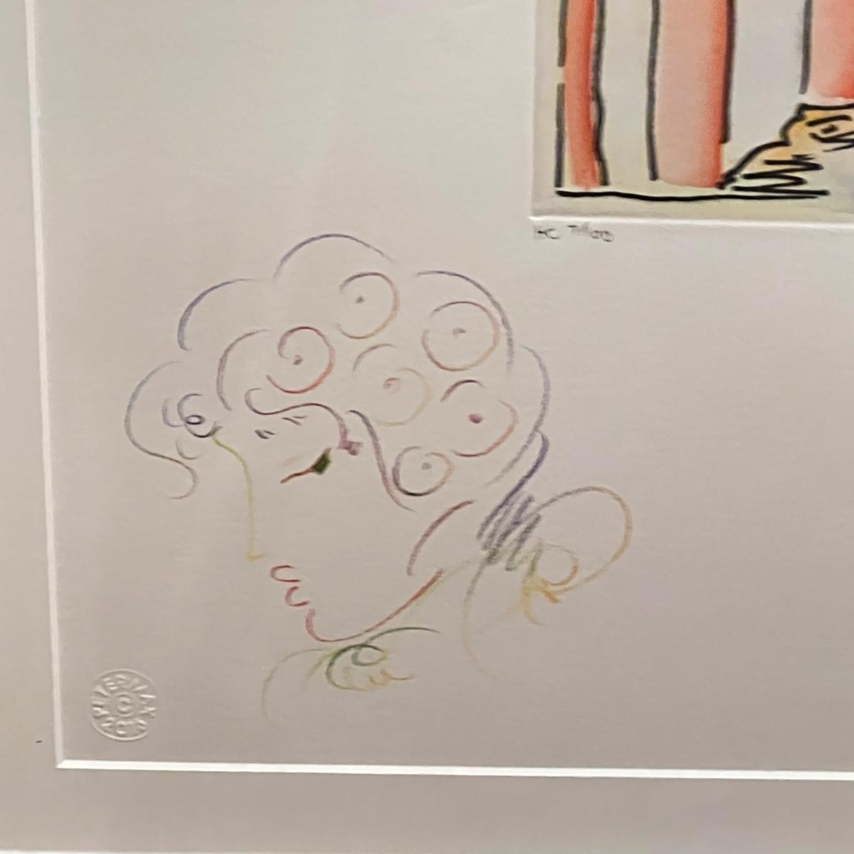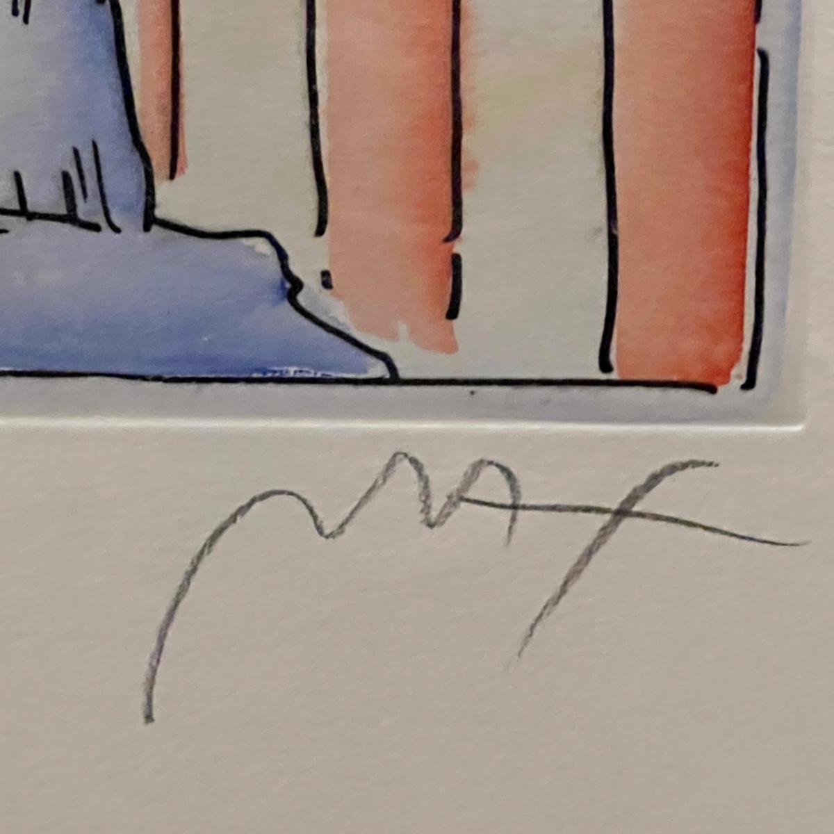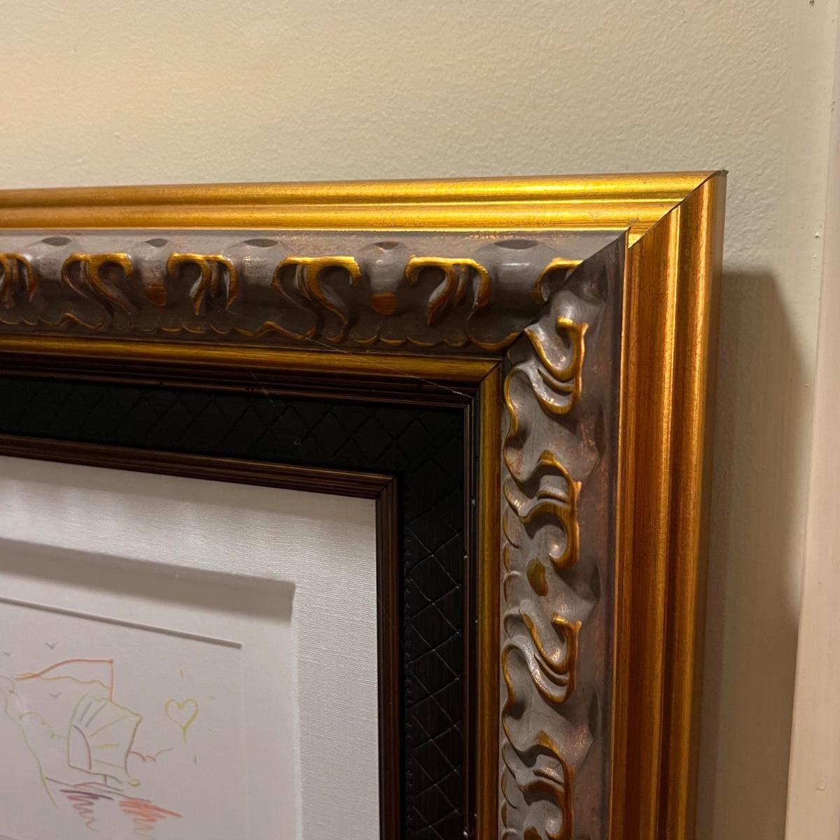 Etching with hand coloring and unique hand drawn colored pencil remarques of a profile. This is one of five pieces of art by Peter Max in this sale, two more lots have matching gilded ornate frames to this one. See photo of accompanying COA for more detailed information about the art. It is matted, under glass and in an ornate gilded frame that measures 33” x 3” x 36”H.