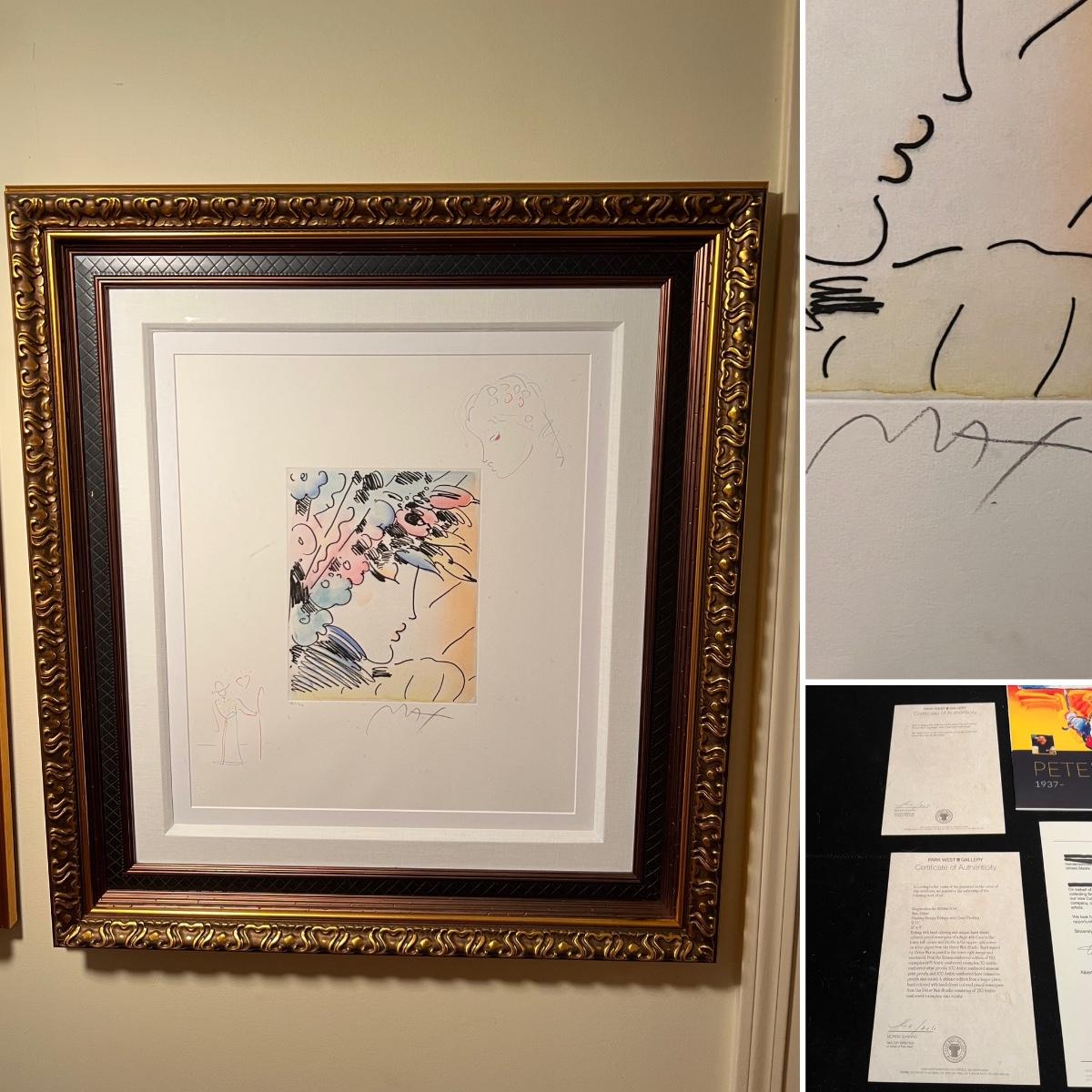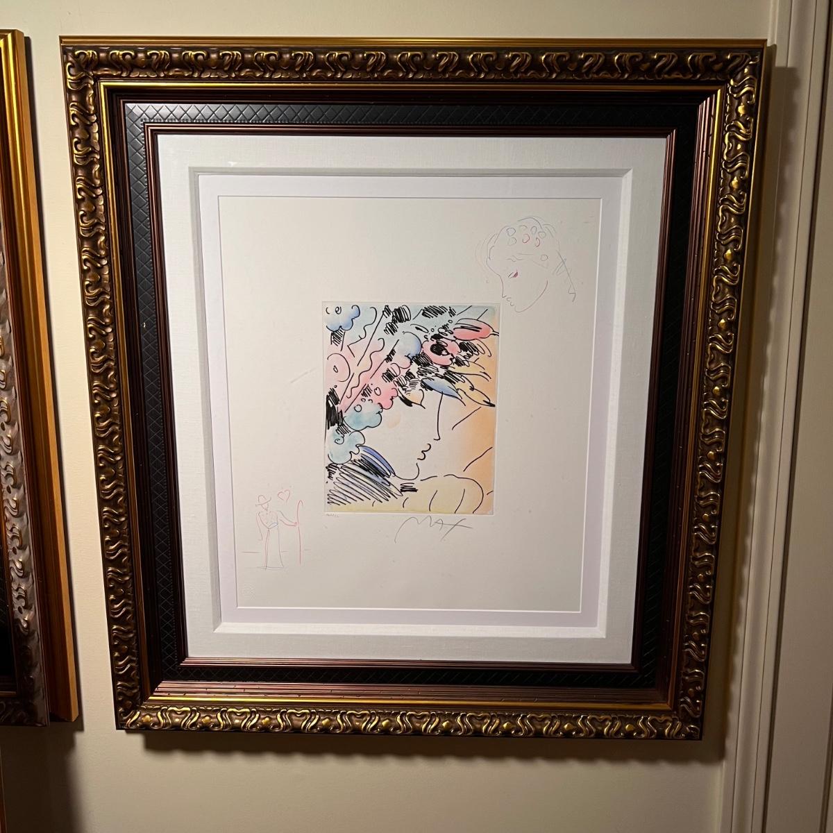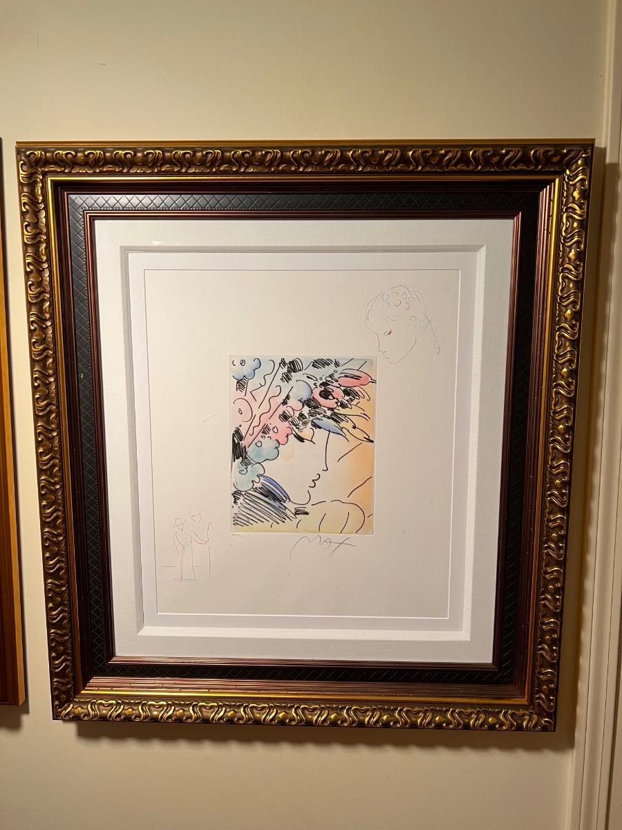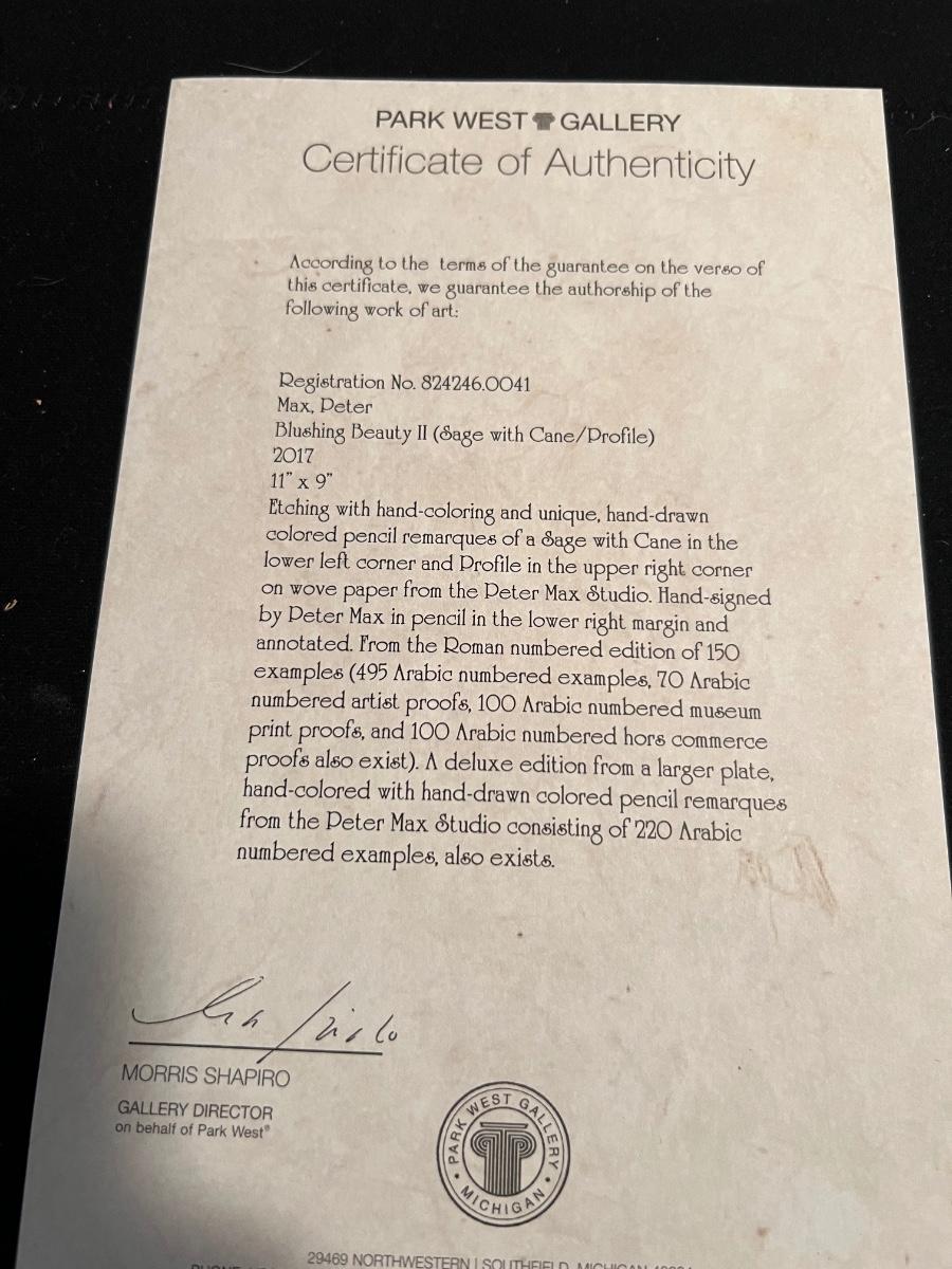Etching with hand coloring and unique hand drawn colored pencil remarques of a Sage with cane by Peter Max. This is one of five pieces of art by Peter Max in this sale, two more lots have matching frames to this one. See photo of accompanying COA for more detailed information about the art. It is matted, under glass and in an ornate gilded frame that measures 33” x 3” x 36”H.