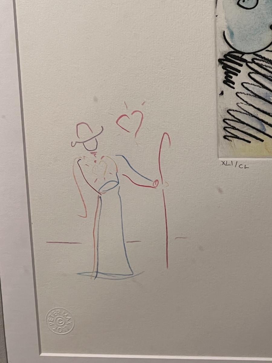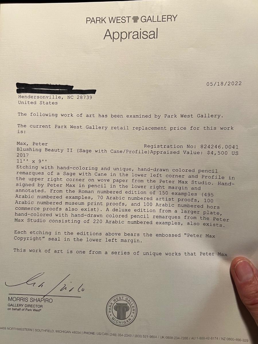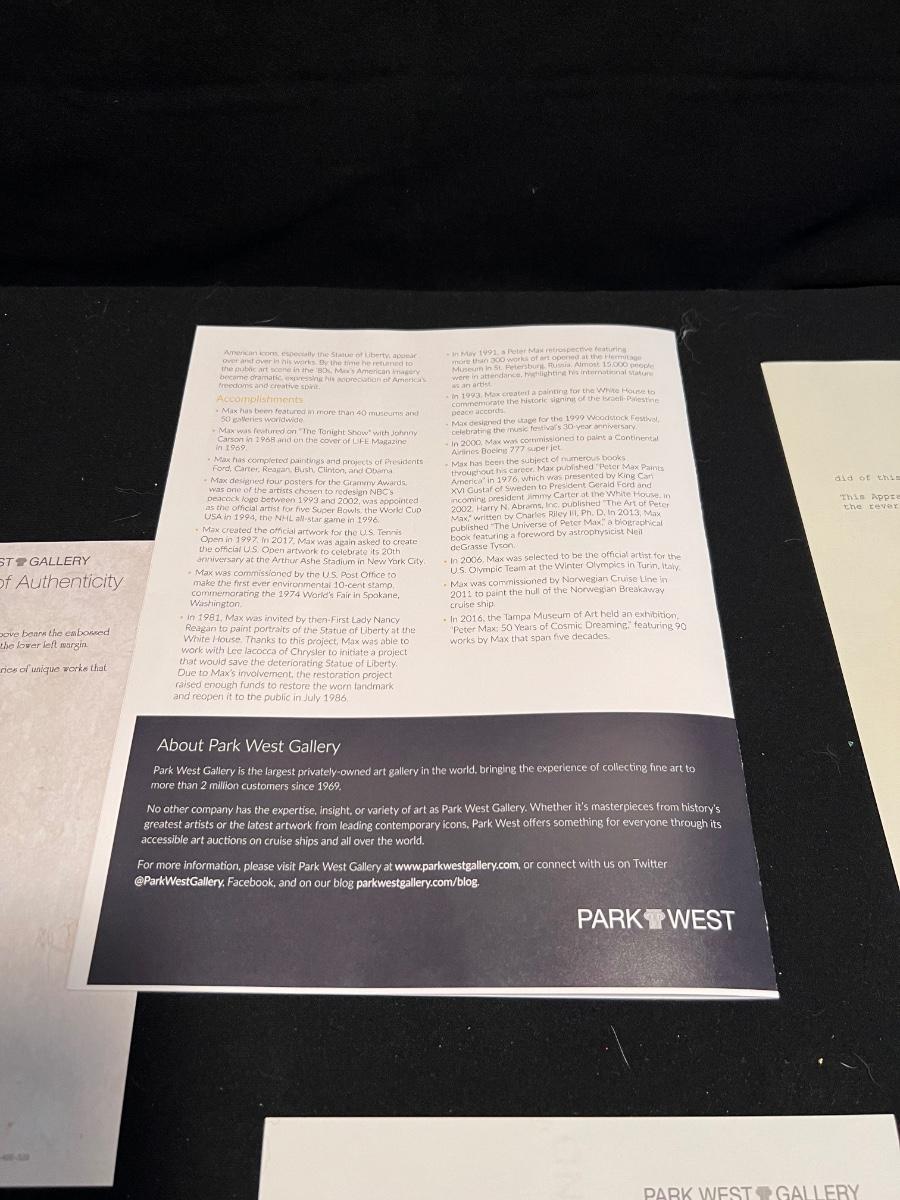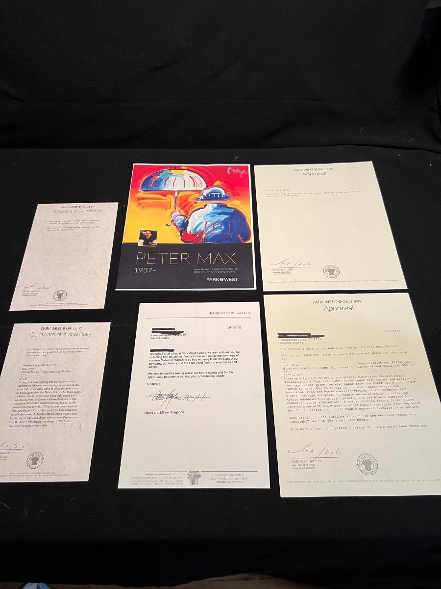 Etching with hand coloring and unique hand drawn colored pencil remarques of a Sage with cane by Peter Max. This is one of five pieces of art by Peter Max in this sale, two more lots have matching frames to this one. See photo of accompanying COA for more detailed information about the art. It is matted, under glass and in an ornate gilded frame that measures 33” x 3” x 36”H.