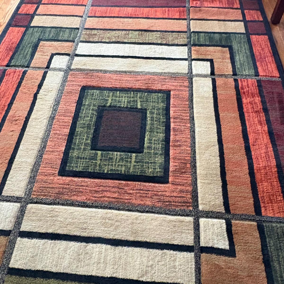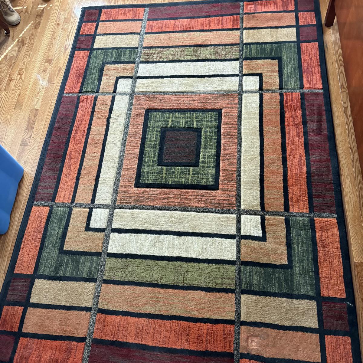 This United Weavers Contours Area Rug is contemporary and bold and will liven up your space, featuring sleek lines and intense colors. Comes with rubber backing as well. Please note this home did have pets so some pet hair may be present. Rug measures 5'4" x 7'6".