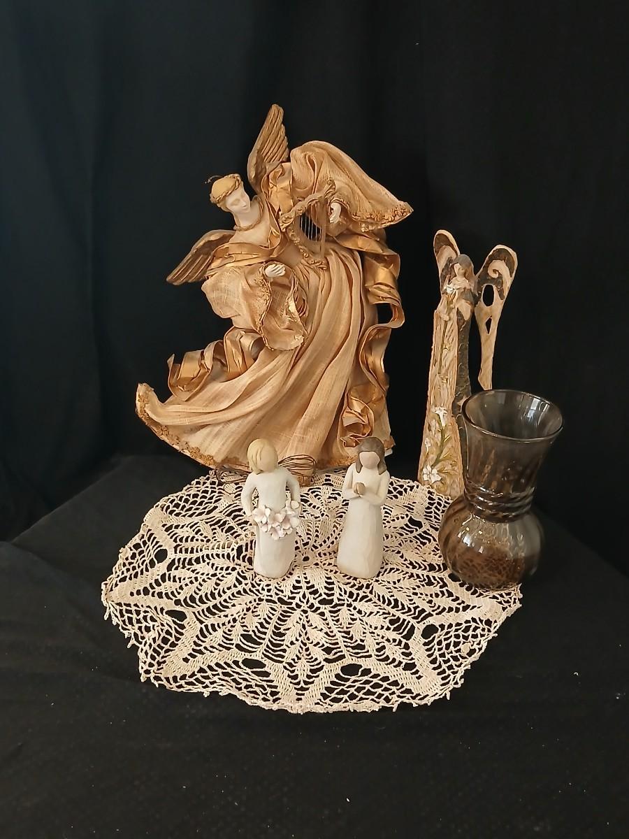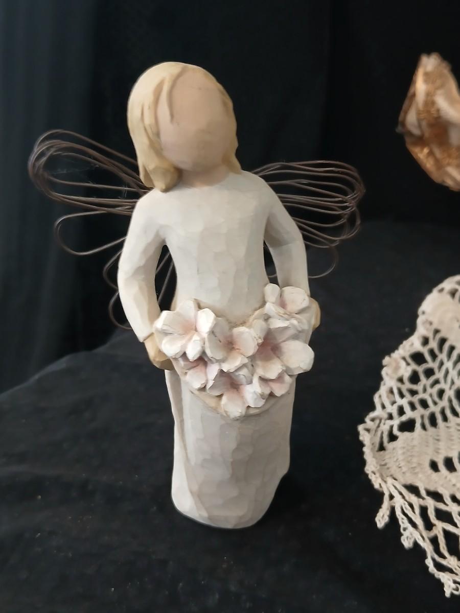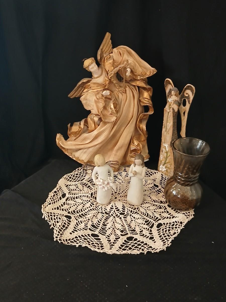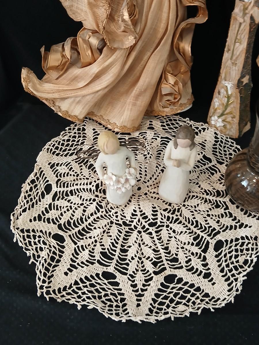 Collection of Angels - Willow tree angels and a large doily