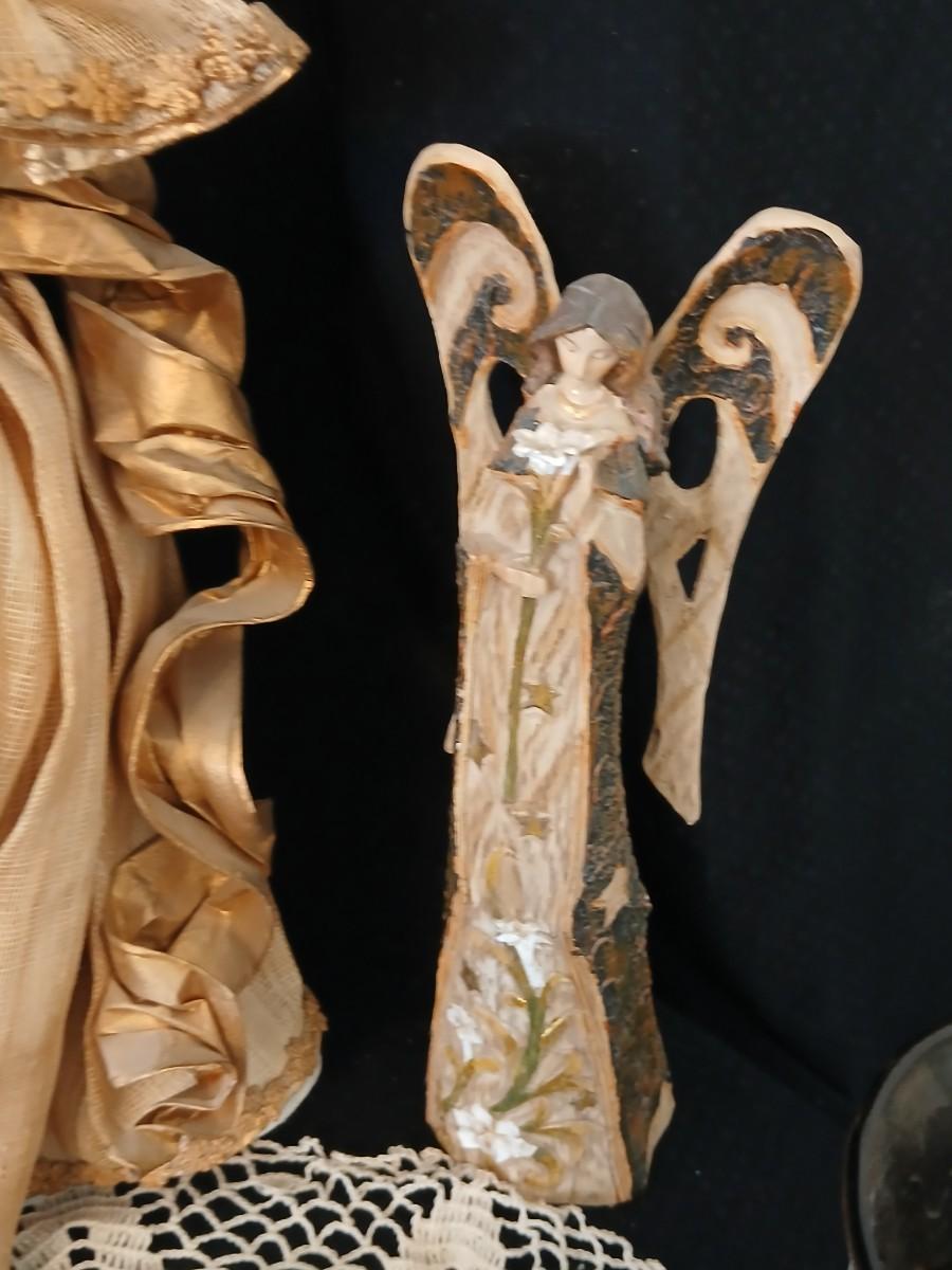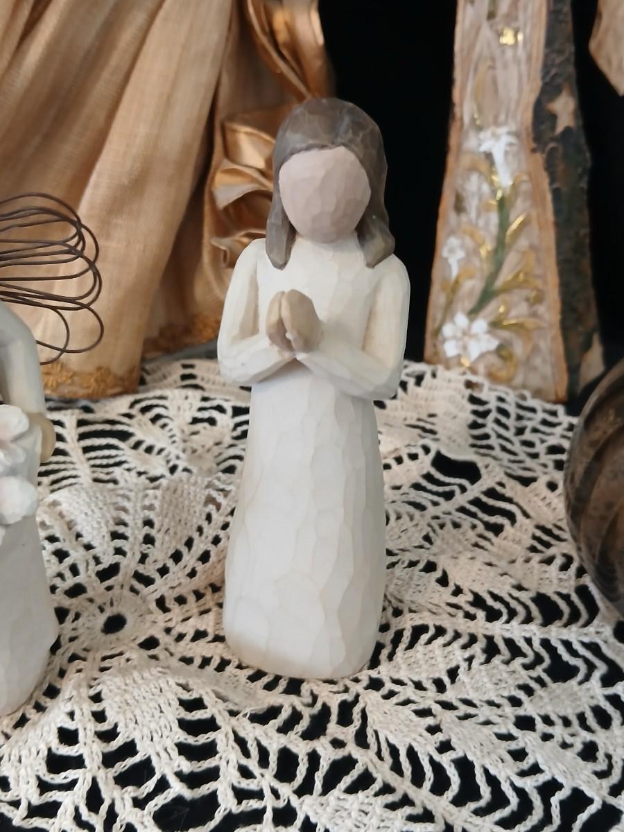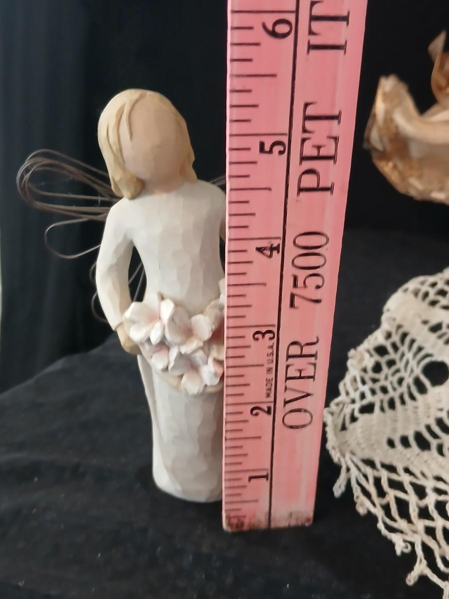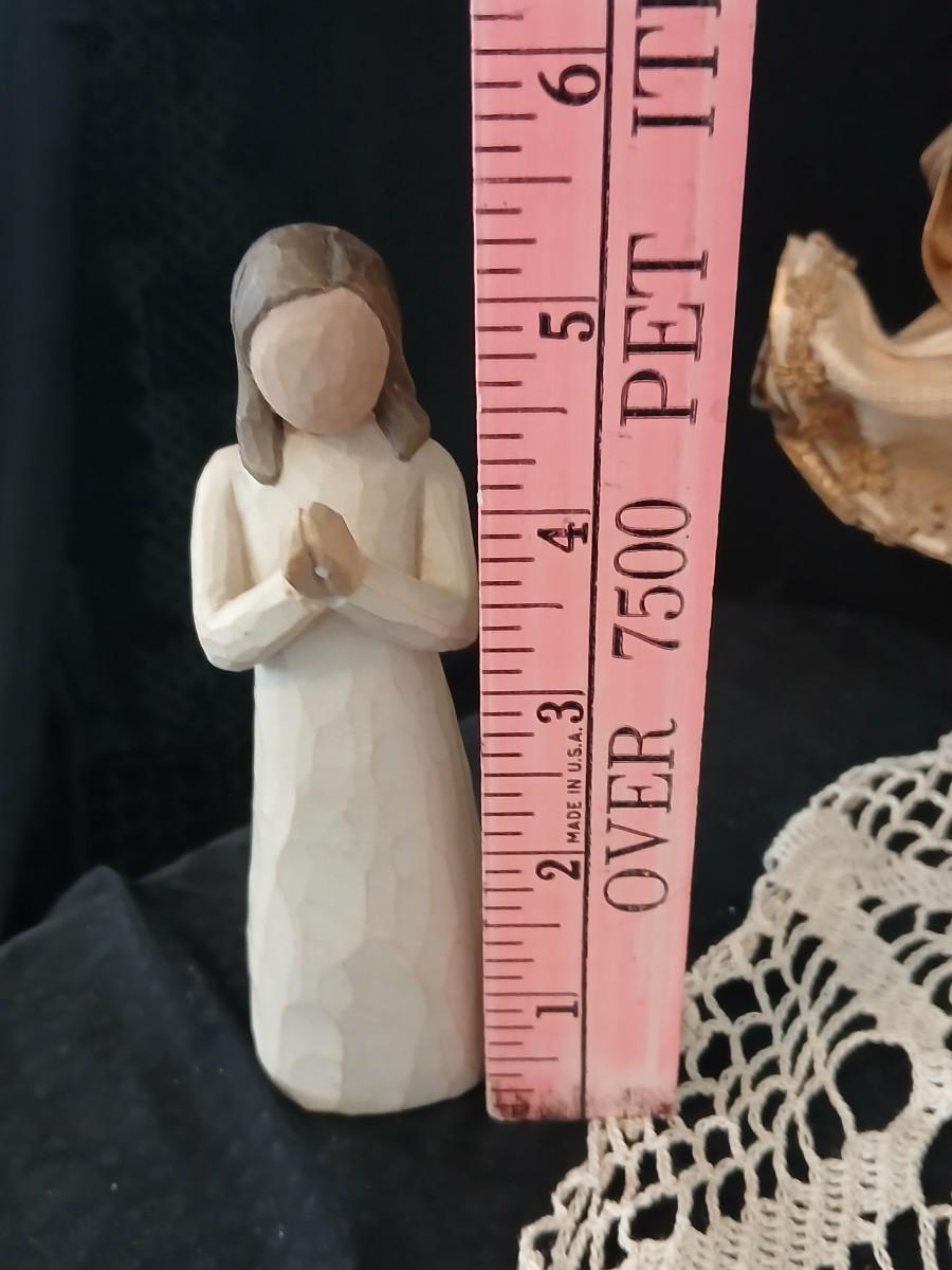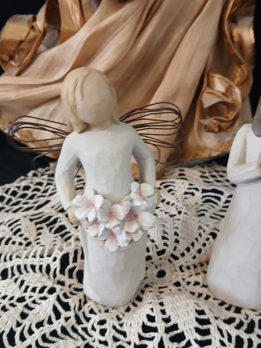 Collection of Angels - Willow tree angels and a large doily