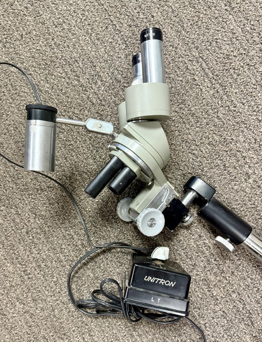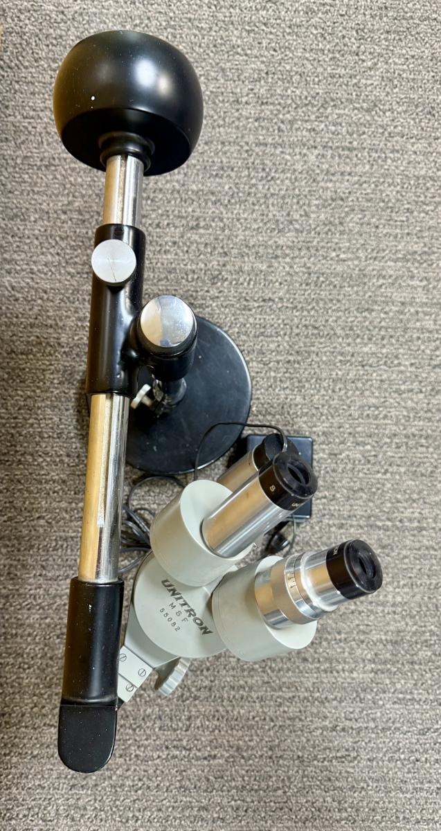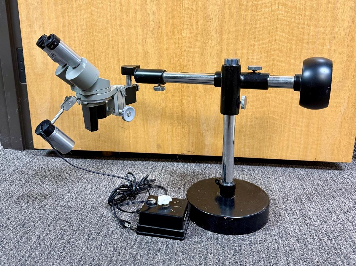 Includes microscope, adjustable no-vibrate weighted stand, and variable brightness light. Tested, light works and microscope works as expected. Lenses were disassembled, cleaned and re-assembled,