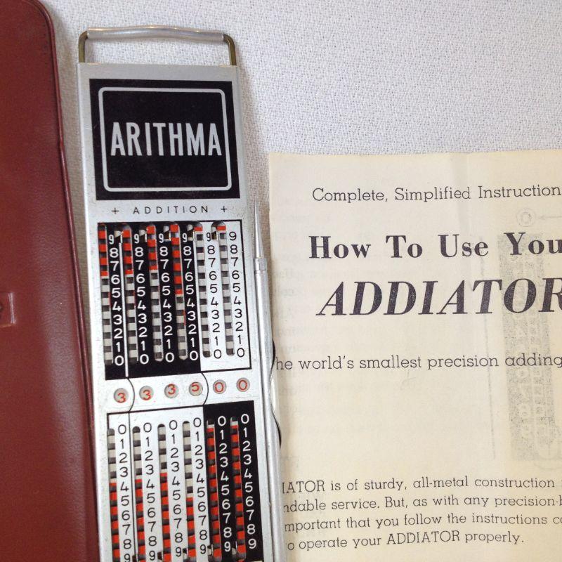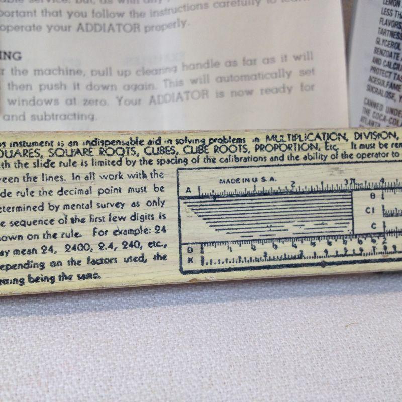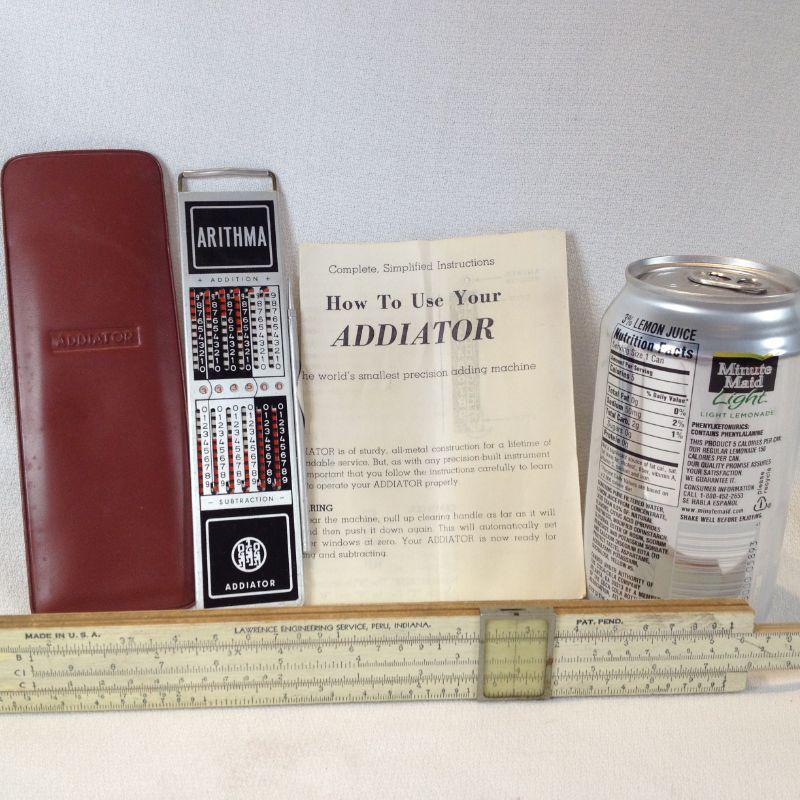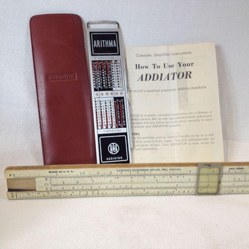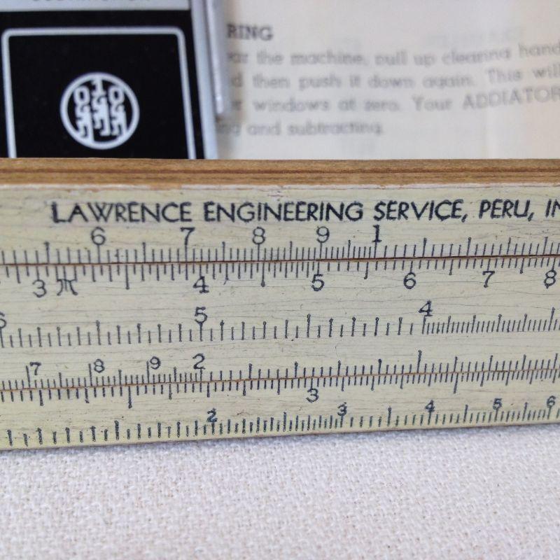 This is a two item set of early calculators. The first is a Addiator with original directions of use and case. It is metal. The second unit is marked Lawrence Engineering Service - Peru, Indiana. It is wood and works like a slide rule. Boasts that it will figure all forms of measures from squares to circles. Both units are in very good condition. These are just great pieces of mathematical history. Reserve/Starting Price is $10.