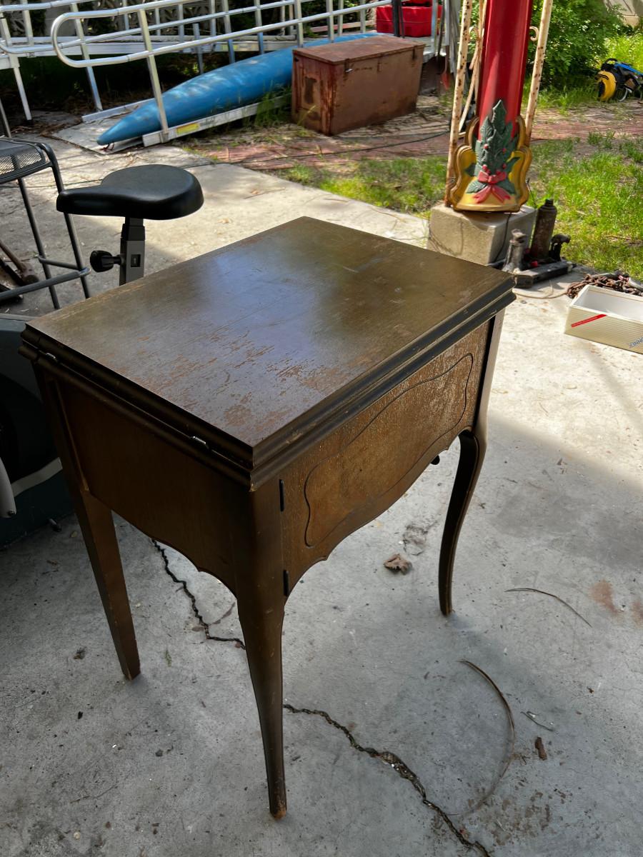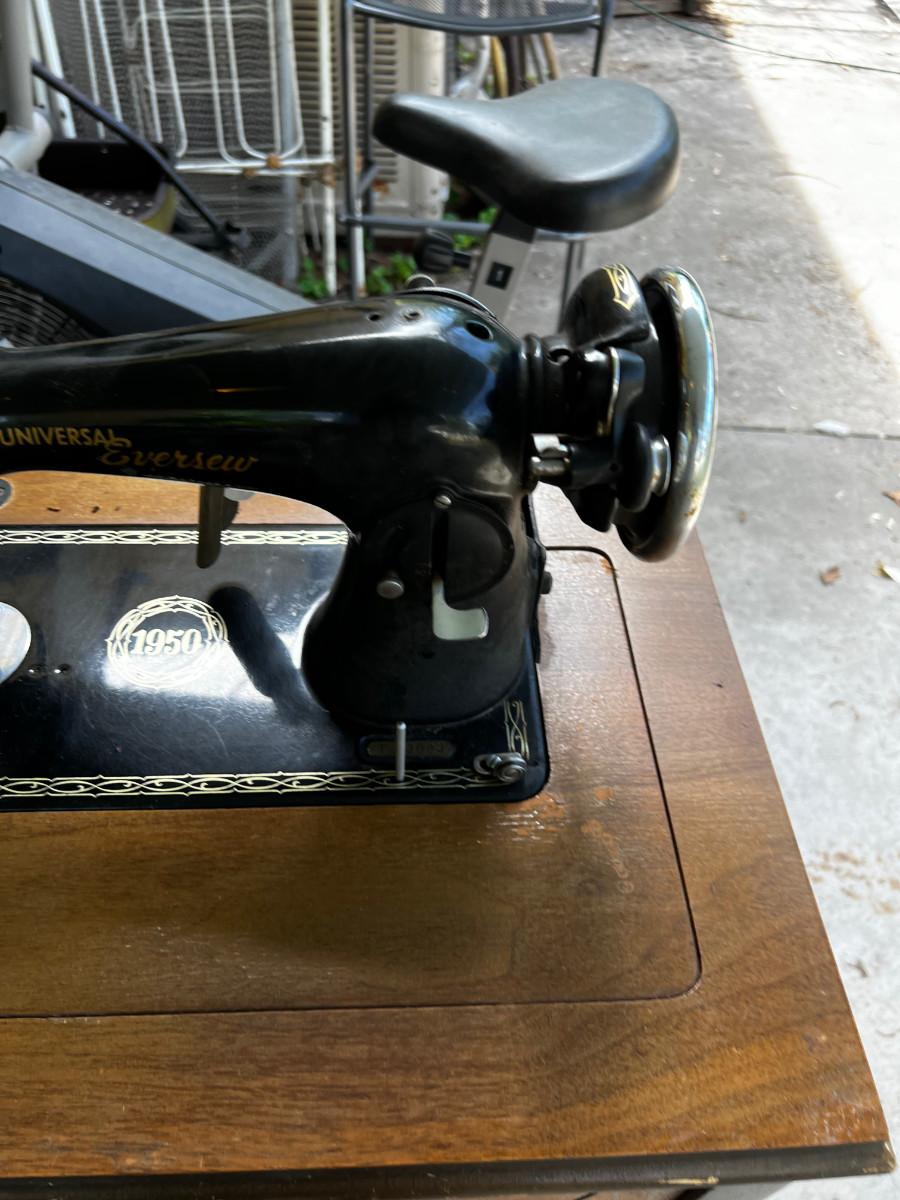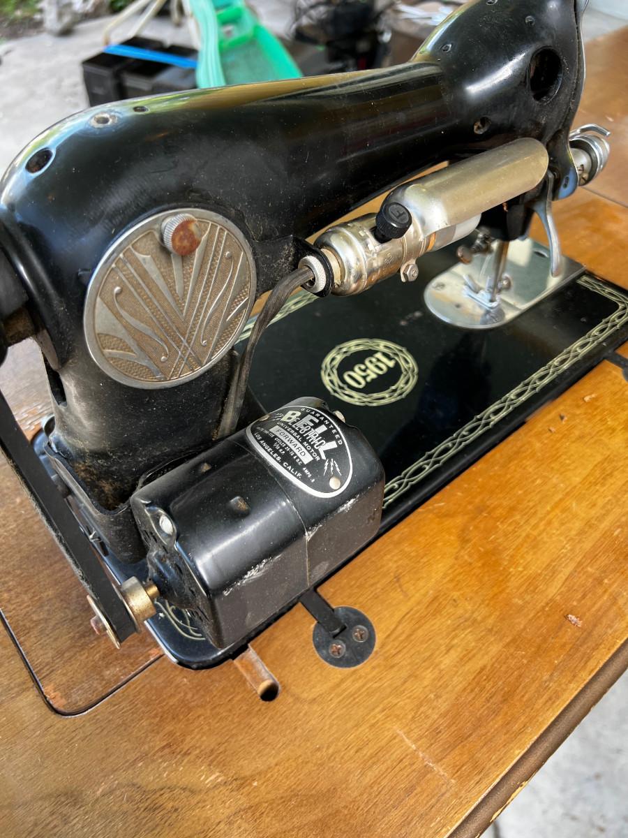 With a Knee Peddle. The Wood Case is a little Dried out. Needs oiled on the Cabinet.