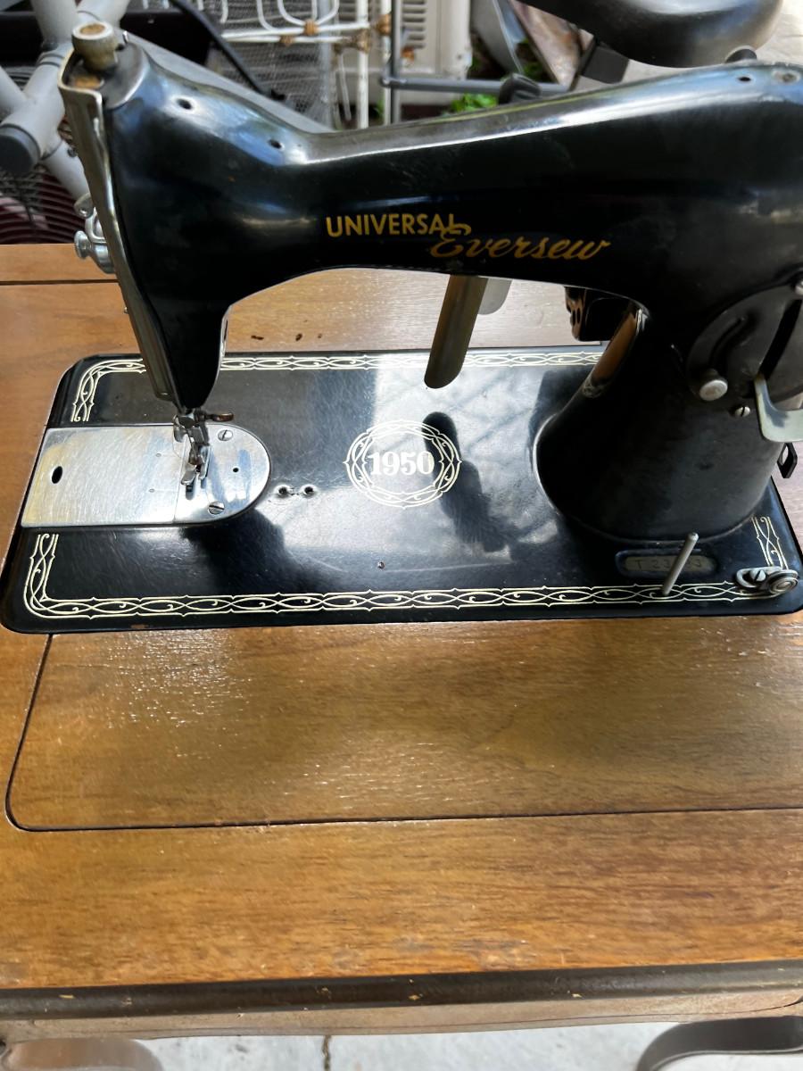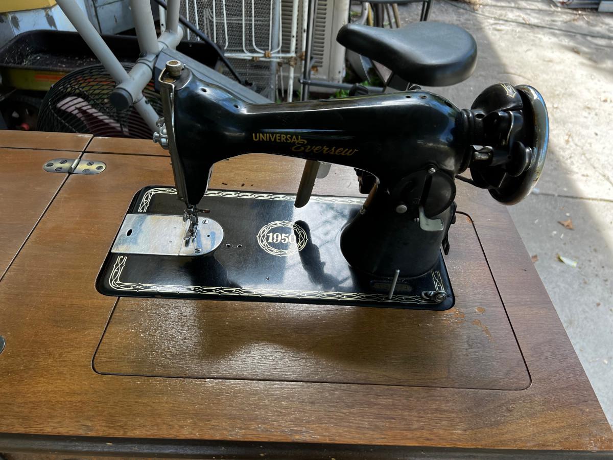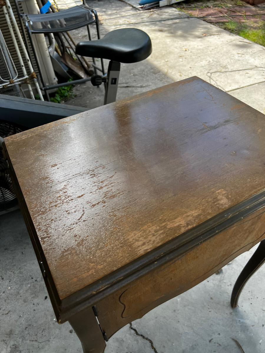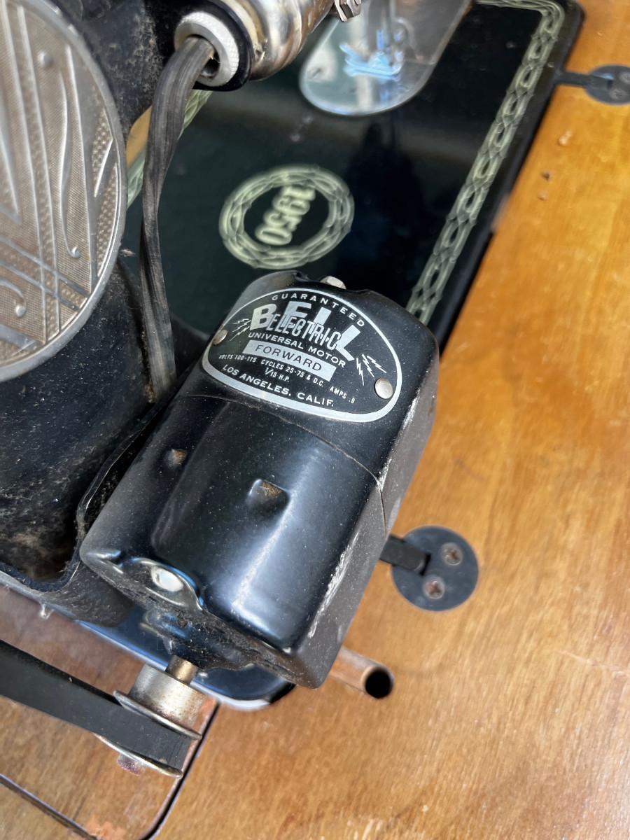 With a Knee Peddle. The Wood Case is a little Dried out. Needs oiled on the Cabinet.