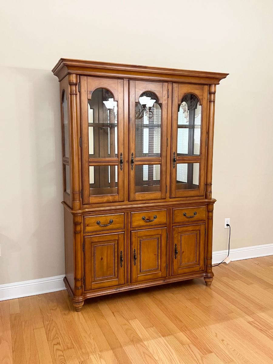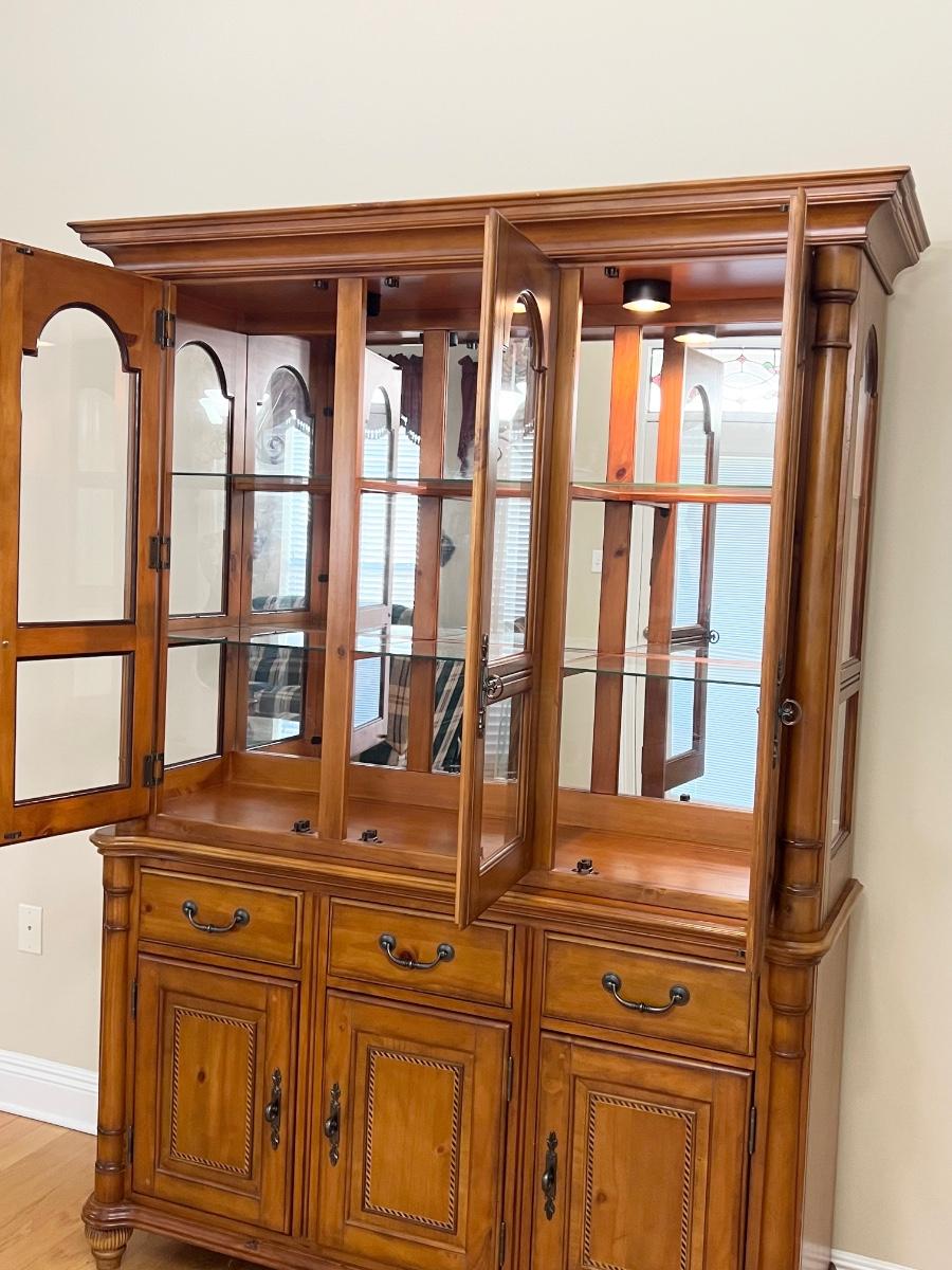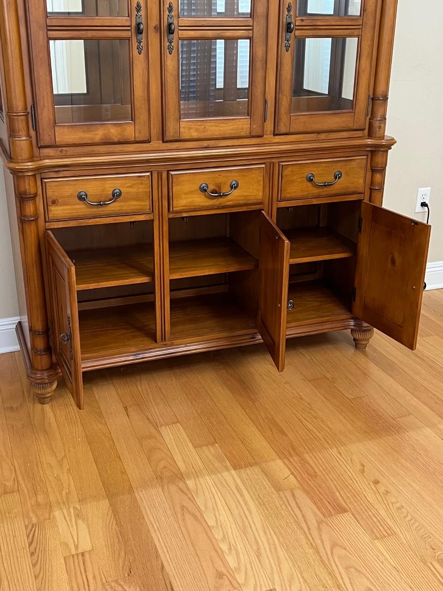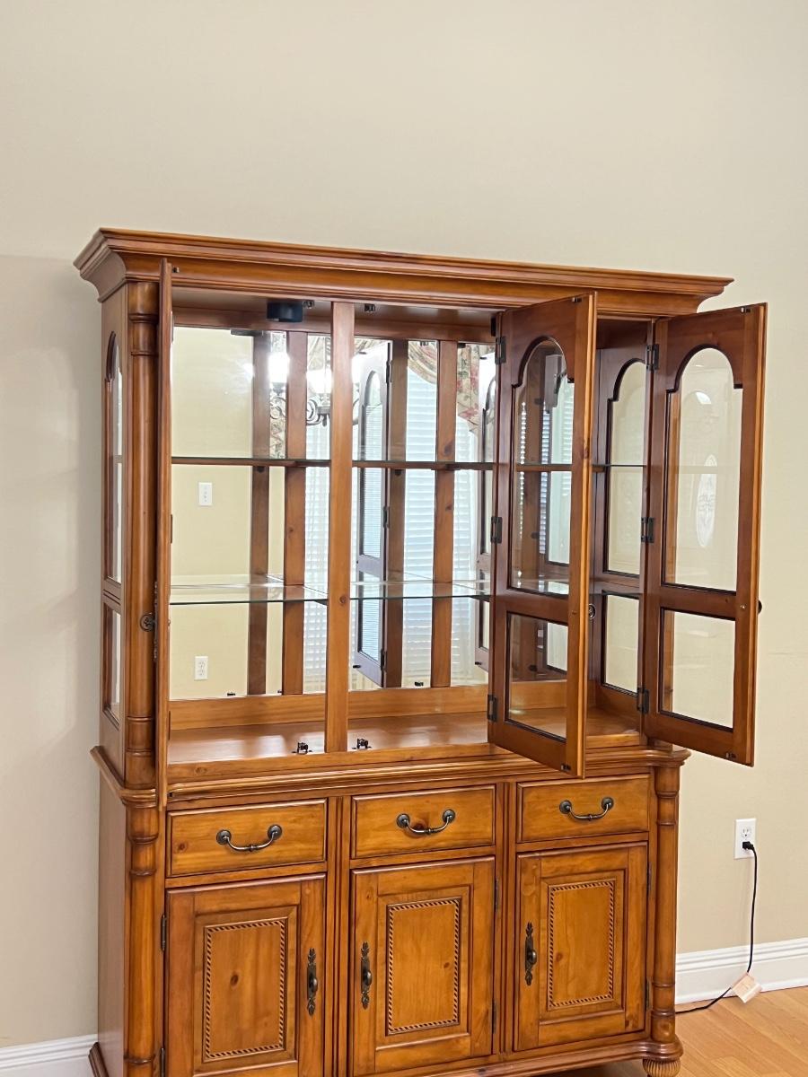 2 pieces ~ Can use buffet separately, buffet has a solid top ~ Both light fixtures work in cabinet, 1 bulb needs to be replaced ~ Bottom = 33” H x 54” W x 18” D ~ Top = 44” H