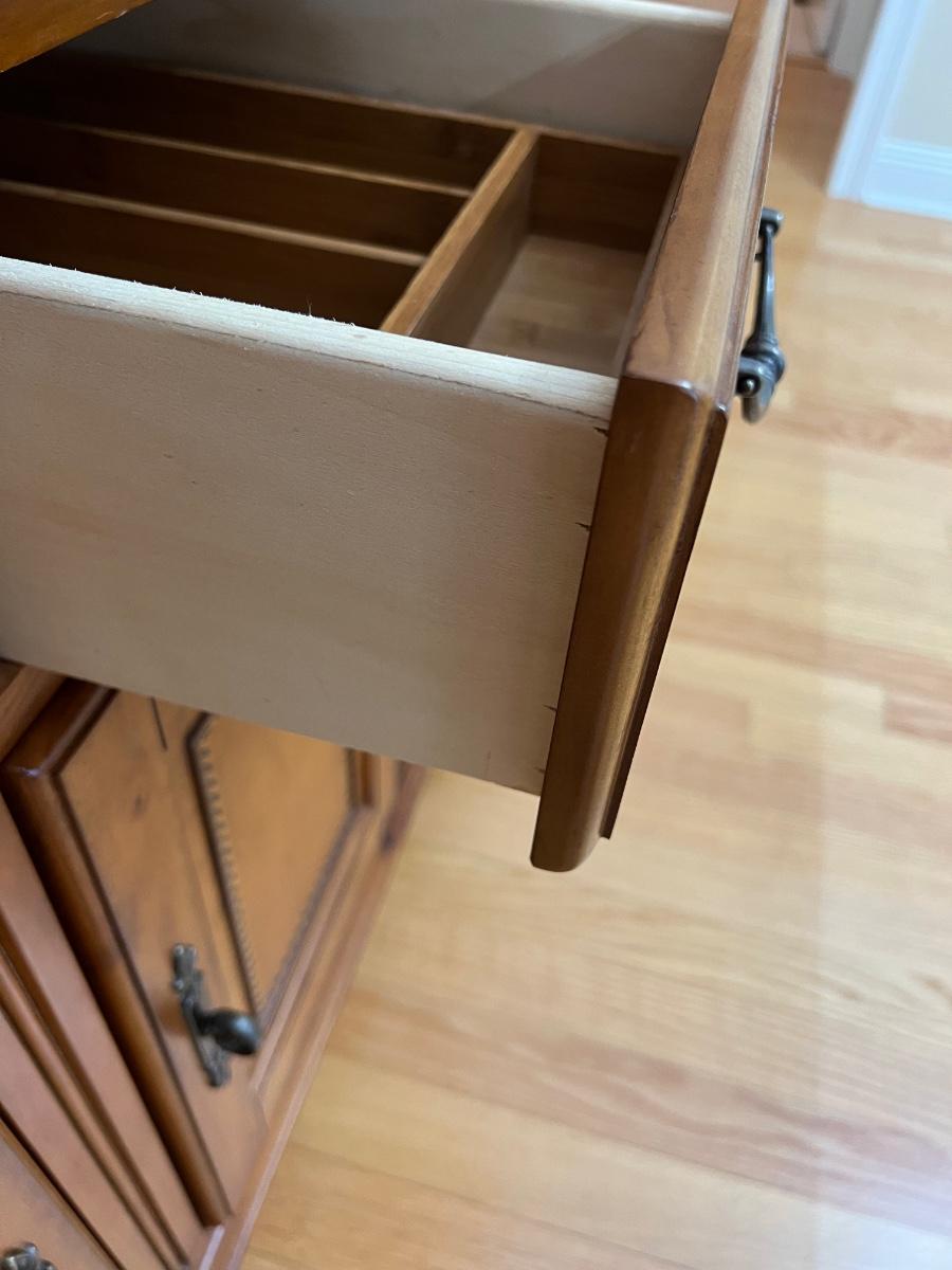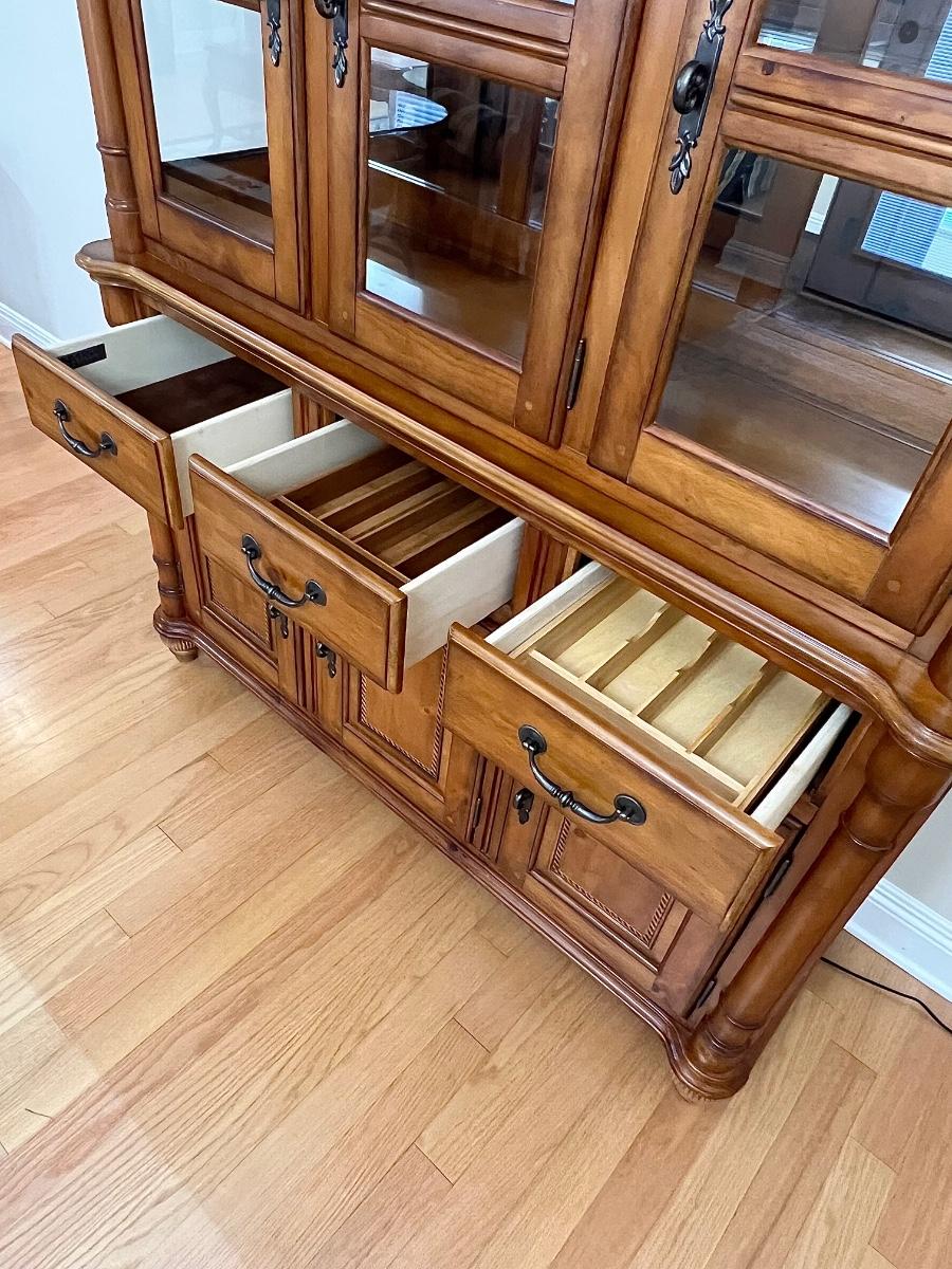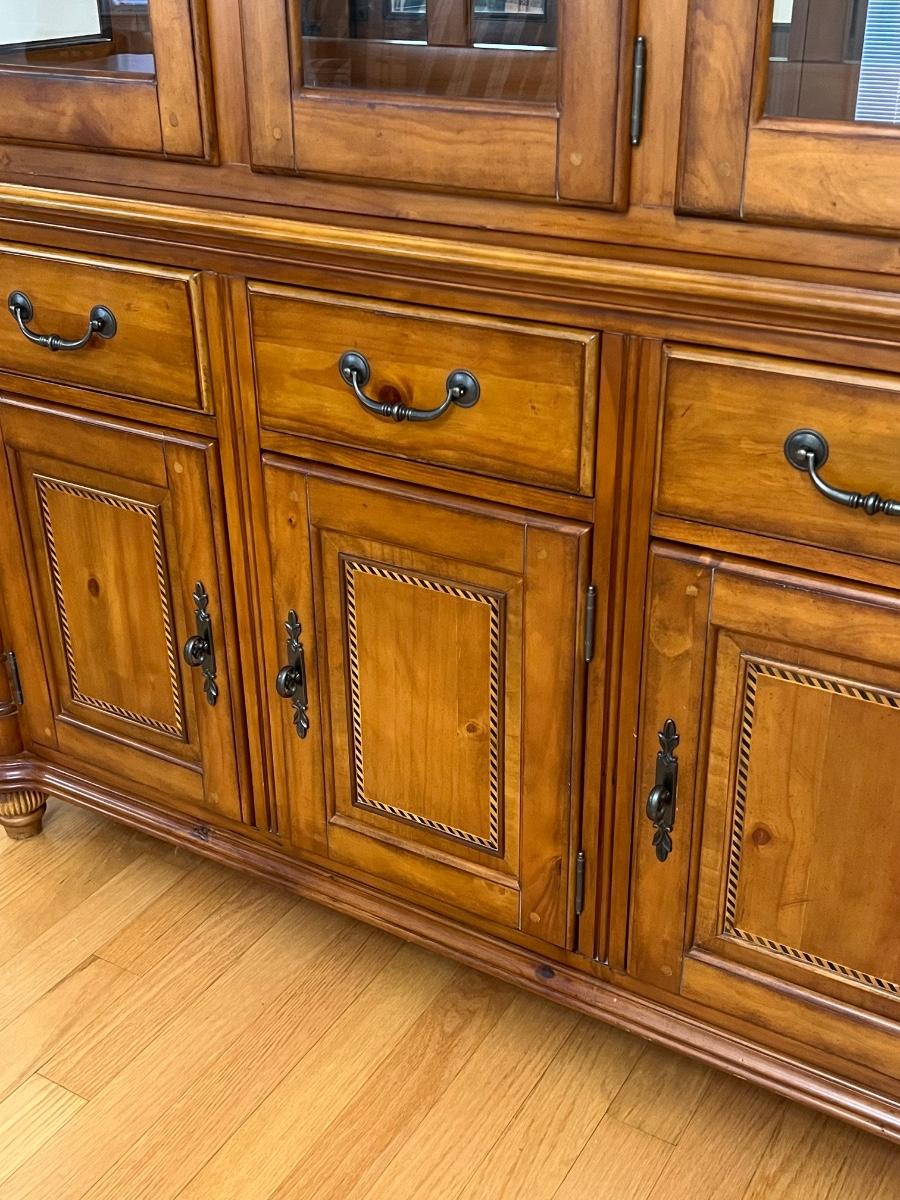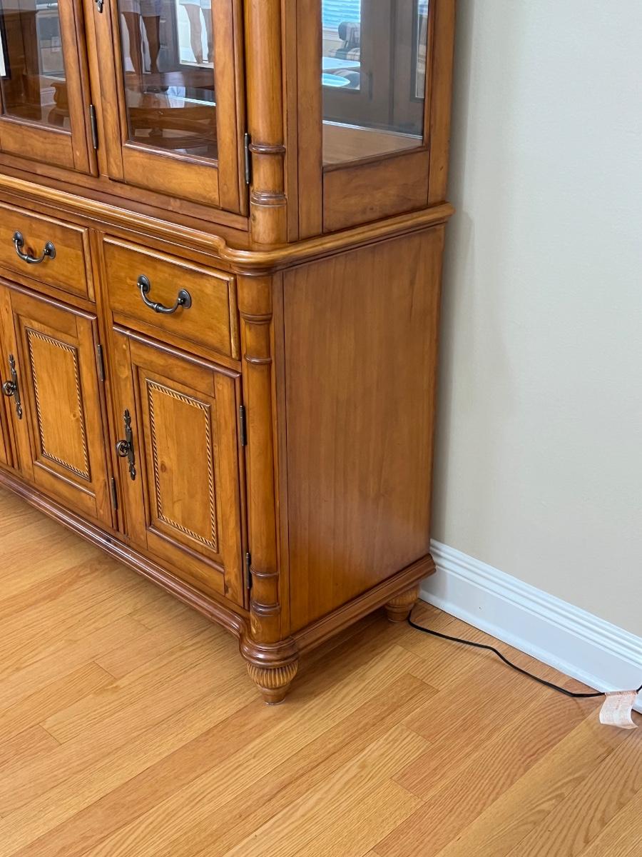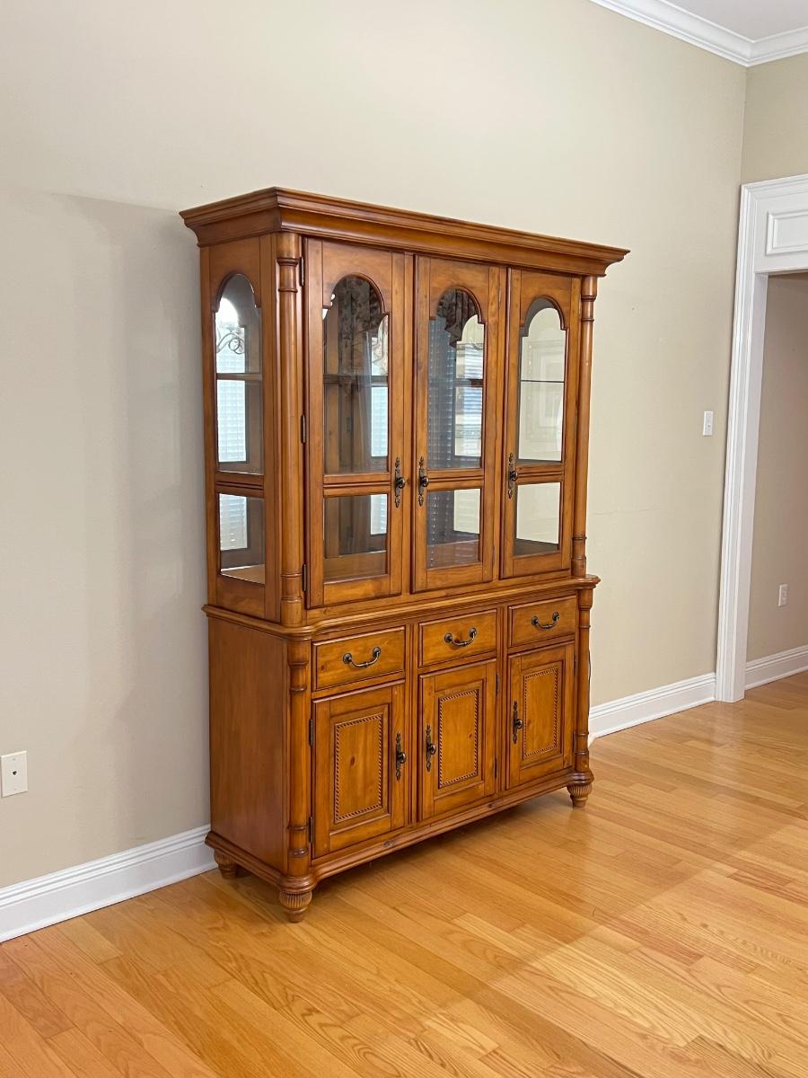 2 pieces ~ Can use buffet separately, buffet has a solid top ~ Both light fixtures work in cabinet, 1 bulb needs to be replaced ~ Bottom = 33” H x 54” W x 18” D ~ Top = 44” H