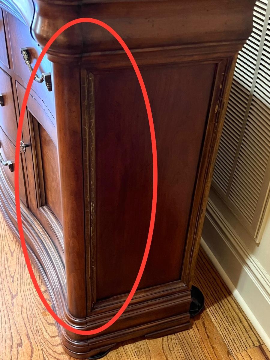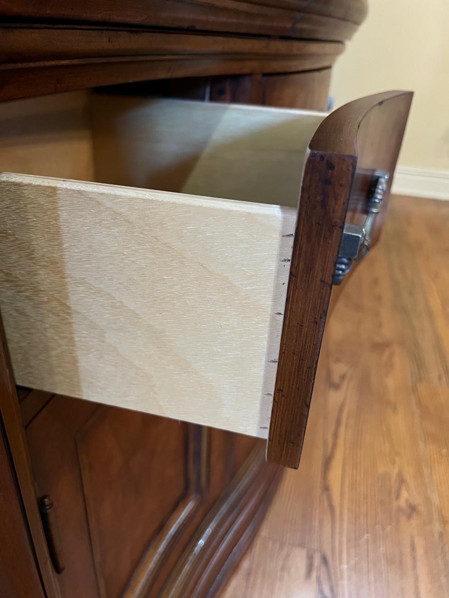 Drawers slide in & out easily. All drawers are felt lined. The finish is cracking / peeling in some spots on the sides ~ 40.5” H x 68” W x 21” D