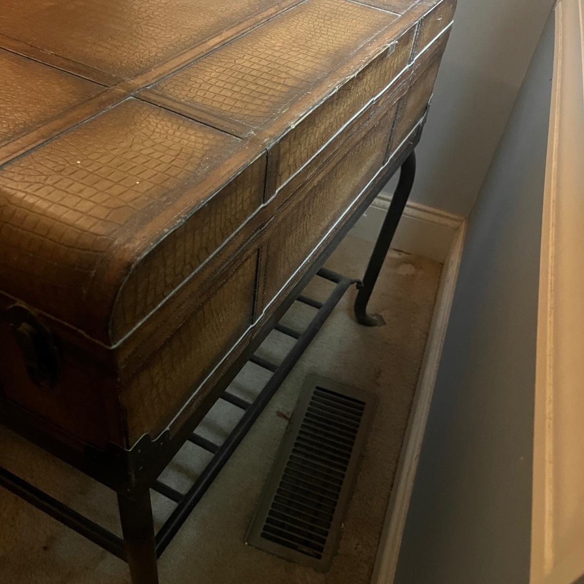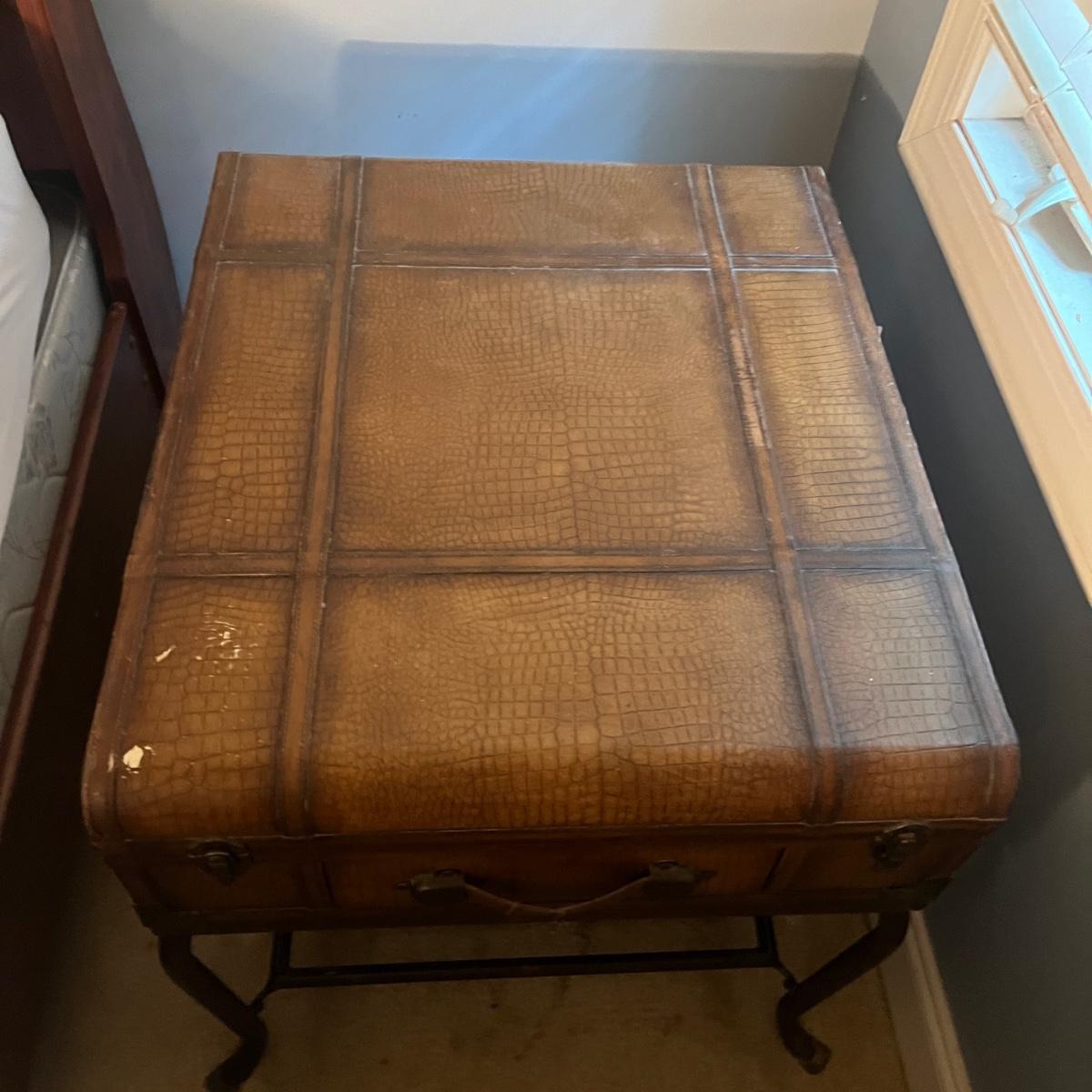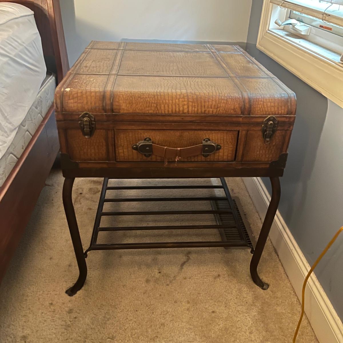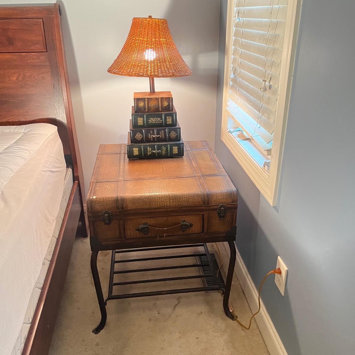Lot a Universal Furniture end table that has an iron base with a faux leather suitcase for the top with drawer and a faux book table lamp with three drawers. Table measures 26” x 31” x 26”H and lamp without shade measures 11” x 9” x 26”H. Table